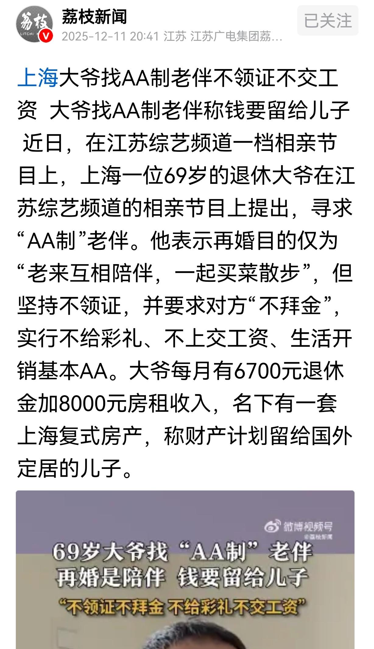 “这大爷长的不美想的美!”上海,一69岁大爷退休金6700元,每月还有8000元房租收入,名下有套复式房产,他征婚,想找个“AA制老伴”,他要求对方不拜金,他一分彩礼不给,也不领证、不交工资,说钱要留给定居国外的亲儿子。网友:这算盘打的,北京都听见了! 一69岁大爷老伴去世,儿子又定居国外,他每天自己买菜,做饭,遛弯,睡觉,形单影只,孤苦伶仃。 都说“少年夫妻老来伴”,可大爷的原配先走一步,留下他一个人晚景凄凉。 都说有出息的儿女,父母借不上力,大爷的情况就是真实写照,他唯一的儿子定居国外了,他如果去国外跟儿子一起生活,但无法适应,也故土难离。 但如果大爷留在上海,又太过孤单,平时还好,有个头疼脑热的,连个端水递药的人都没有。 其实,大爷的经济条件非常好,退休金高达6700,而且,每月出租房子还有8000元收入,要说他雇个保姆,照顾他饮食起居一日三餐,经济上绰绰有余。 但大爷这辈人精打细算惯了,每月保姆费可不便宜,他再有钱也舍不得。 也不知道是大爷自作主张,还是跟儿子商量打成共识了,大爷决定枯木逢春,梅开二度,再找个老伴相濡以沫。 可大爷不傻,他怕老伴算计自己的财产,为了防患于未然,他就丑话说前头,他要求女方不能拜金,因为女方在自己这里什么都捞不到,他不给一分钱彩礼,更不领证、不交工资。 在他看来,要彩礼的那是黄花大闺女,他们都土埋大半截老头老太婆了,没有彩礼一说。 而且,他们这个岁数找老伴,就是搭伙过日子,合则聚不合则散,没必要领证,那是枷锁也是责任,更是他如果先走一步,就成了老伴分割自己财产的合法凭证,他可不愿意给自己招惹麻烦。 大爷准备把所有的财产都留给定居国外的儿子,也不知道是大爷舐犊情深,主动这么做的,还是这是儿子同意他晚年再婚的条件。 所以,每月退休金他当然不会上交,他必须找一个愿意跟他生活费AA制的老太太过日子。 但这AA是光指的生活费,还是也包括干家务活,大爷没说。 你想呀,大爷这苛刻的条件,在生活中能找到老伴吗?他这不是找免费保姆吗? 如果大爷这么能算计,那可以找个老头了,两个男的在一起还能下下棋,男的在生活费上也不会斤斤计较。 又或者,找个老太太也行,他把家务都干了,别人负责吃饭睡觉陪他买菜逛街。 大爷为什么不去养老公寓长住呢。 里面老头老太太,每天都可以做伴,还有好多活动,根本不孤单。 而且还有团队照顾,又很安全。 何必去找什么一起买菜散步都老太太呢? 想找个免费保姆,明说,这个岁数咯,女的也不傻,一把岁数了,自己有钱花,干嘛要给对方做保姆,闲的嘛? 找个保姆也得管吃管住还得给人开好几千的工资,找个AA的伙伴有人照顾,不用工资,甚至买东西还有人给他出一半钱。 所以说,大爷这老伴不好找,除非找同等的条件,都不缺钱,三观一致,各自留钱给儿女。相互尊重相互照顾,但这样的不多。 生活中找不到,大爷竟然跑到电视台征婚去了,大爷一说出自己的条件,立马火的一塌糊涂,招来骂声一片,看来,不管在生活中还是媒体上,他这再婚条件,都让人愤愤不平。 你找个保姆还得每月给人5000块呢,还管吃管住,你又不跟人家登记,为什么叫找老伴?现在的男人给保姆5000块都舍得,找个老伴跟他过日子,那饭钱都开始算计,这样的男人找什么老伴? 这大爷可真会打算盘啊!自己有钱却舍不得雇保姆,想找个老伴又不愿付出,彩礼不给、不领证、不交工资,还想AA制,这哪是找老伴,分明是想找个免费保姆嘛! 他也不想想,人家老太太又不傻,自己有钱花,干嘛要给他当保姆,还得搭上自己的钱和精力? 再说了,就算真有老太太愿意,那也是因为看重感情,可大爷这条件,哪还有半点感情可言? 我觉得啊,大爷还是别找了,自己过或者去养老公寓,都比这强,省得招人骂,还找不到合适的。 《民法典》第1065条规定:夫妻可以约定婚姻关系存续期间所得的财产以及婚前财产归各自所有、共同所有或部分各自所有、部分共同所有。约定应当采用书面形式。 大爷提出不领证、不交工资、生活费AA制,本质是试图以非婚姻形式规避夫妻共同财产制。 但问题在于,如果没进行书面财产约定且未登记结婚,双方不构成法律认可的夫妻关系,所谓“AA制”缺乏法律基础。 即便双方形成同居关系,大爷拒绝支付生活费、不承担共同扶养义务的行为,既违反公序良俗,也与《民法典》中“家庭成员间应当敬老爱幼、互相帮助”的倡导相悖。 此外,大爷将财产全部留给儿子、拒绝与老伴共享收益的安排,虽可视为个人财产处分,但如果老伴在共同生活中承担了较多家务、照料义务,依据《民法典》第1090条“离婚时一方生活困难,另一方应给予适当帮助”的类推原则,老伴仍有权主张经济补偿。大爷的算计,在法律与情理层面均难以成立。 对此,你怎么看? 关注@灋律盐究员 学法辩是非,用法止纷争。