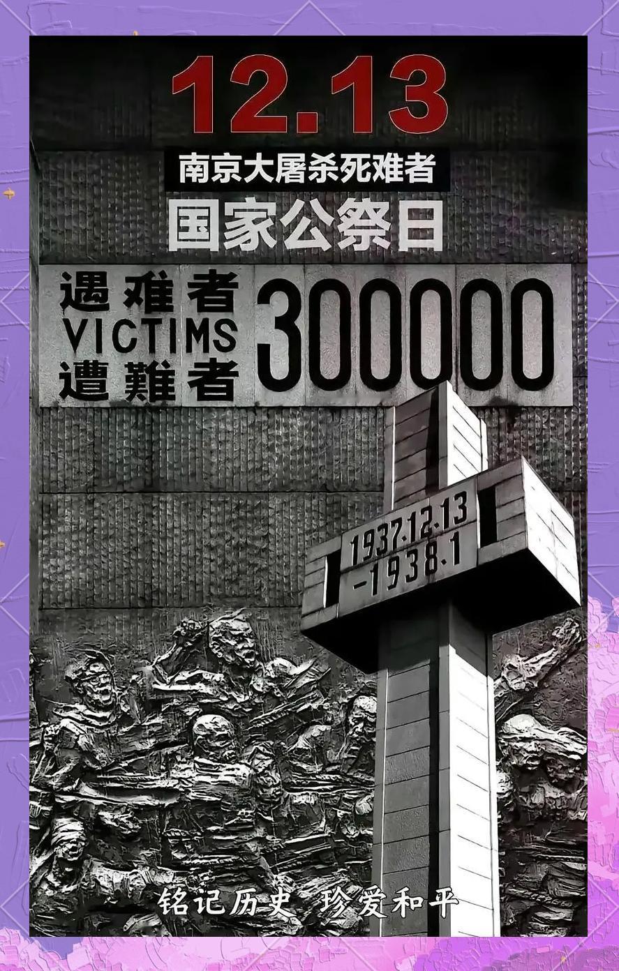 今日,南京城上空警报长鸣,山河垂泪,我们以国之名,悼念1937年冬那场惨绝人寰的大屠杀中遇难的30万同胞。六周暴行,血染秦淮,白骨盈城,这是中华民族历史上最黑暗的一页,更是人类文明史上不可磨灭的伤痕。 历史不会因时光冲刷而褪色,真相不容篡改,正义不容践踏。我们铭记同胞的苦难,不是为了延续仇恨,而是要以史为鉴,让“天下兴亡,匹夫有责”的信念深植血脉,让“勿忘国耻,振兴中华”的呐喊永振心间。 今日之中国,山河无恙,盛世如愿。我们告慰先烈:祖国已非当年积贫积弱之邦,人民正以自强之姿,守护和平、追求复兴。愿和平鸽翱翔寰宇,愿悲剧永不再现!让我们携手同行,以奋斗铸就未来,以团结捍卫尊严,共同守护人类文明的曙光。 铭记历史,珍爱和平;山河永固,吾辈自强!