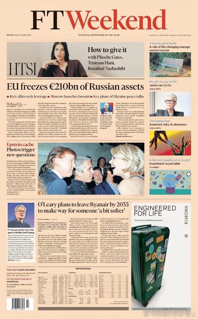 《金融时报》今天的是欧洲昨天宣布,无限期冻结俄罗斯在欧盟地区拥有的资产,总值为2100亿欧元。报道指出,此举为乌克兰以此作为抵押品,向金融机构贷款以资助其军费开支铺平了道路,同时也使欧洲国家在美国主导的乌克兰和谈中,增强其谈判的筹码。而莫斯科方面也马上作出反击,向欧洲清算银行提出控告,而大部分俄罗斯资产也是在该银行名下托管的。报道指出,俄罗斯因此也可以没收欧洲清算银行再俄罗斯境内拥有的任何资产。报道还透露,在欧洲与乌克兰修订的和谈方案中,也建议乌克兰最快可在2027年获准加入欧盟。该报还在头版宣布,美国人工智能芯片制造商英伟达(Nvadia)的创始人黄仁勋,获该报选为本年度风云人物。该报指黄仁勋是推动人工智能技术在全球各领域迅速应用的灵魂人物,同时也使英伟达成为世界上市值最高的企业。而黄仁勋本身的个人财富也超过1600亿美元以上,名列全球十大富豪之列。