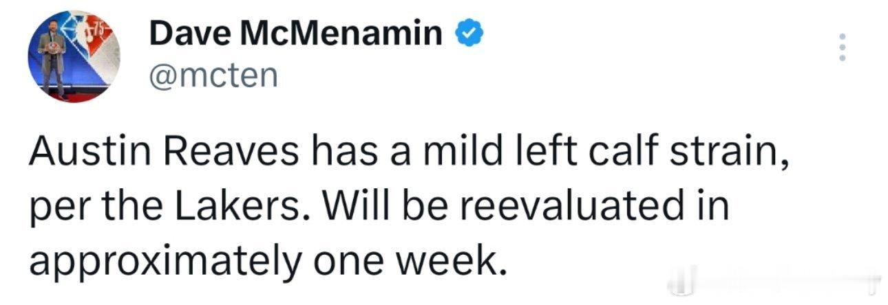 里夫斯左小腿轻微拉伤,约一周后复查。