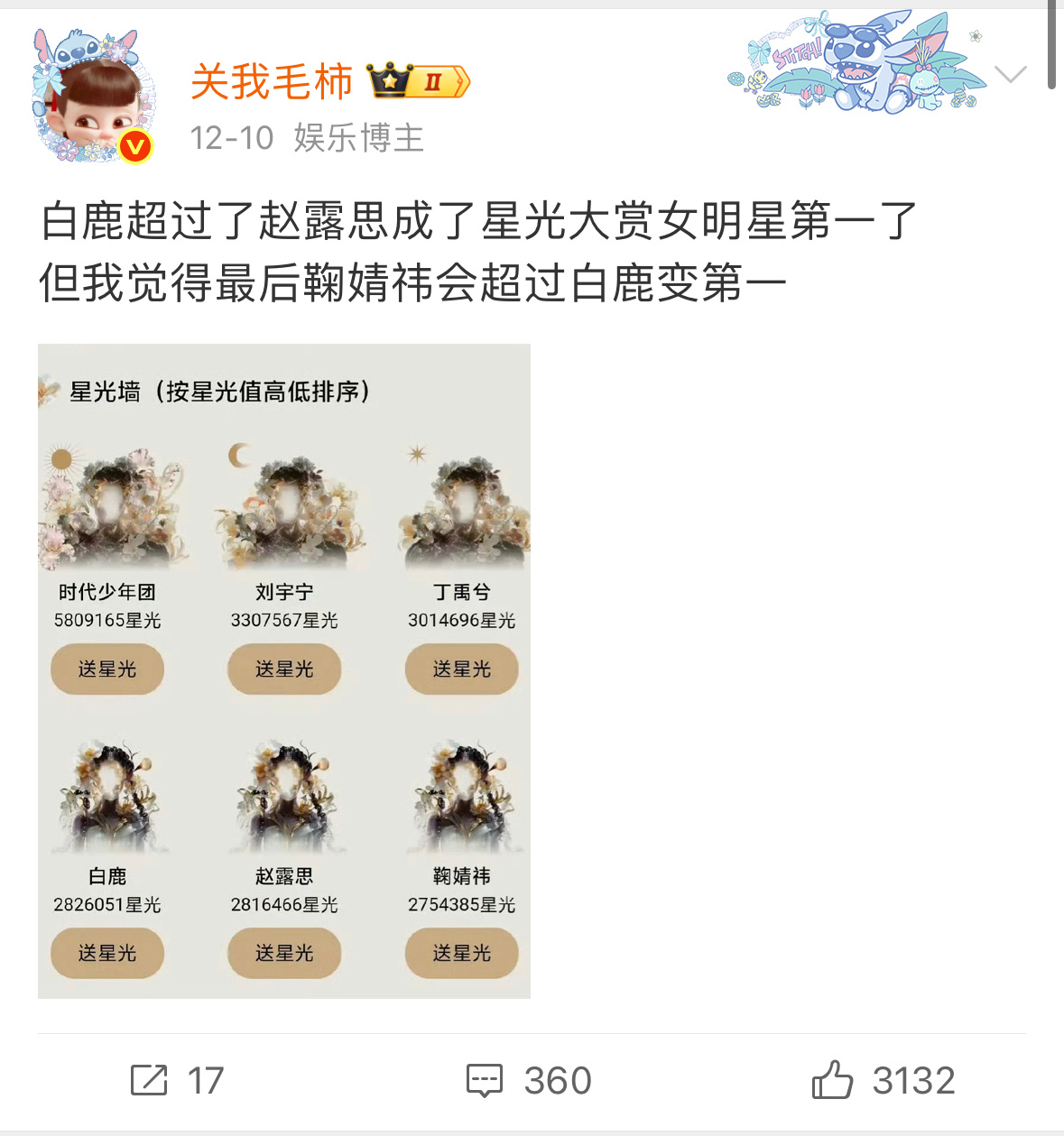 白鹿星光大赏星光墙投票反超赵露思,两人都已破千万,好厉害