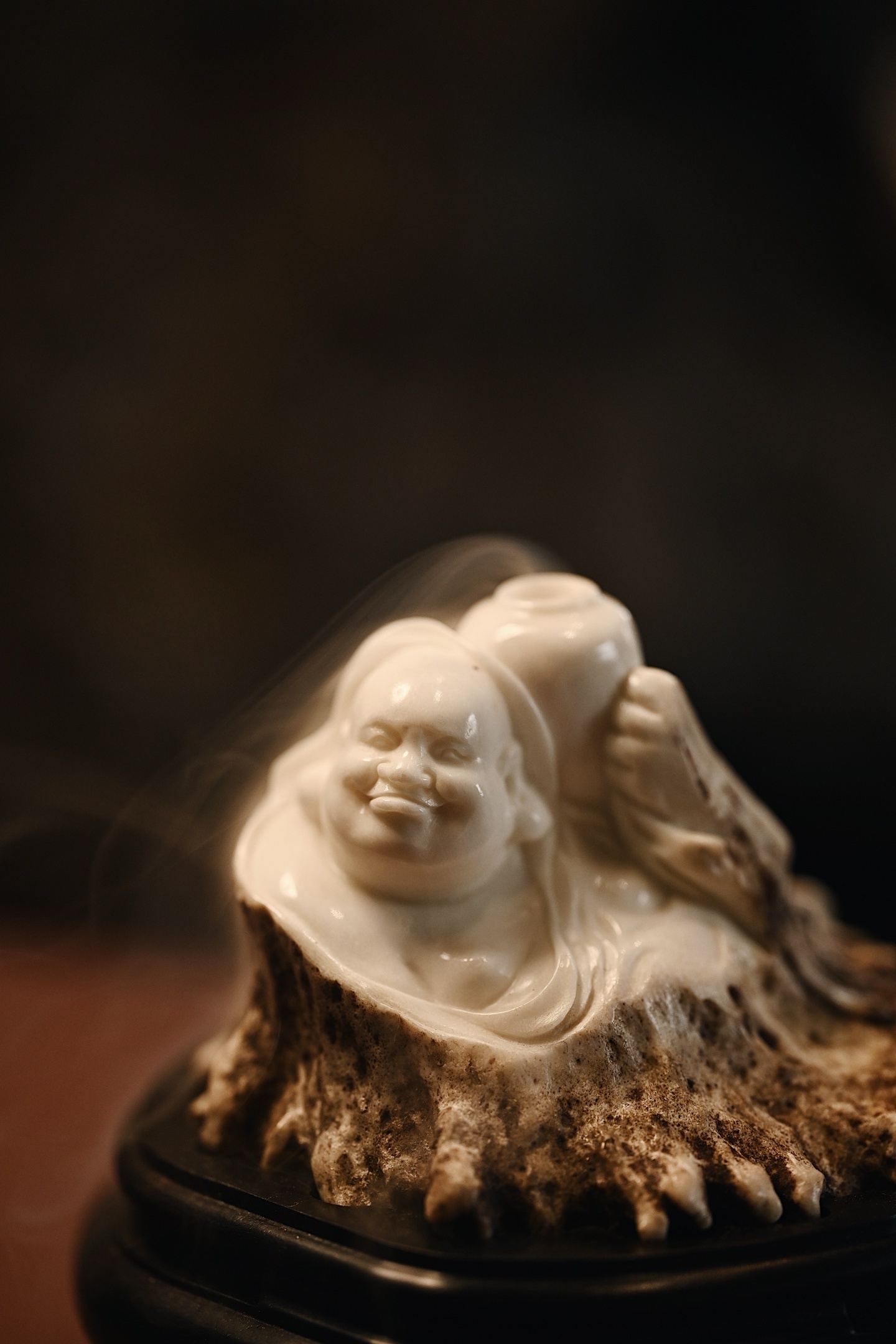 鹿角|欢喜弥勒香炉料质清润,雕刻弥勒笑意盈盈,焚香出烟,一派仙风道骨之韵。