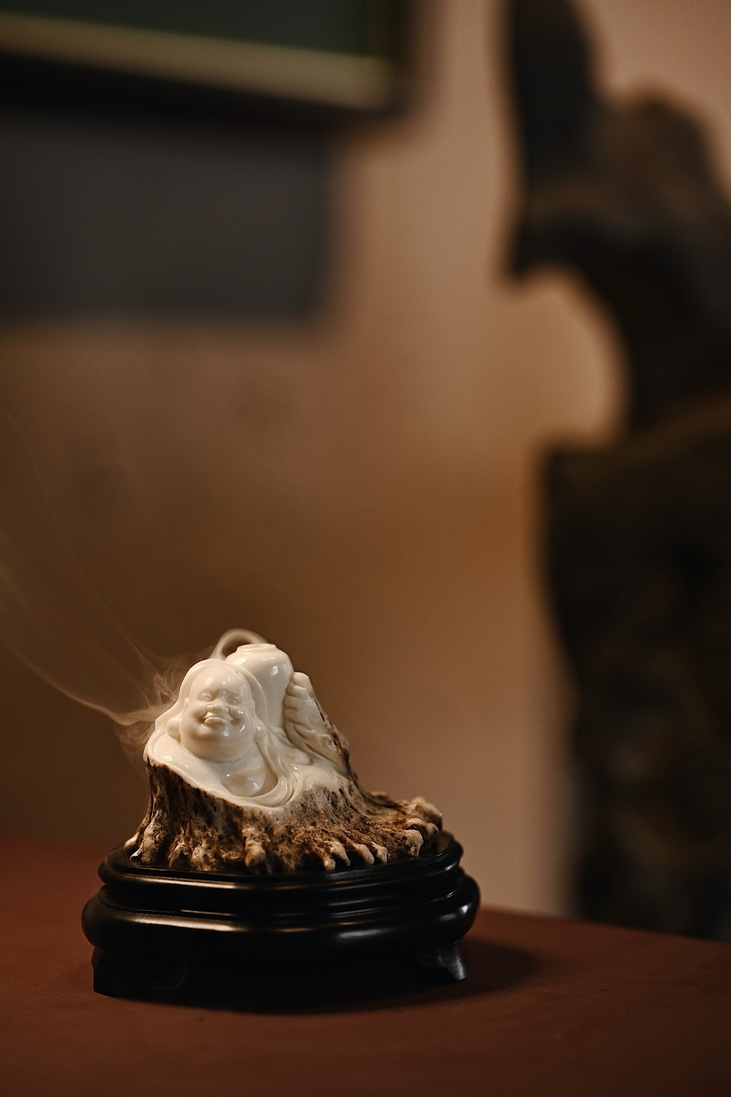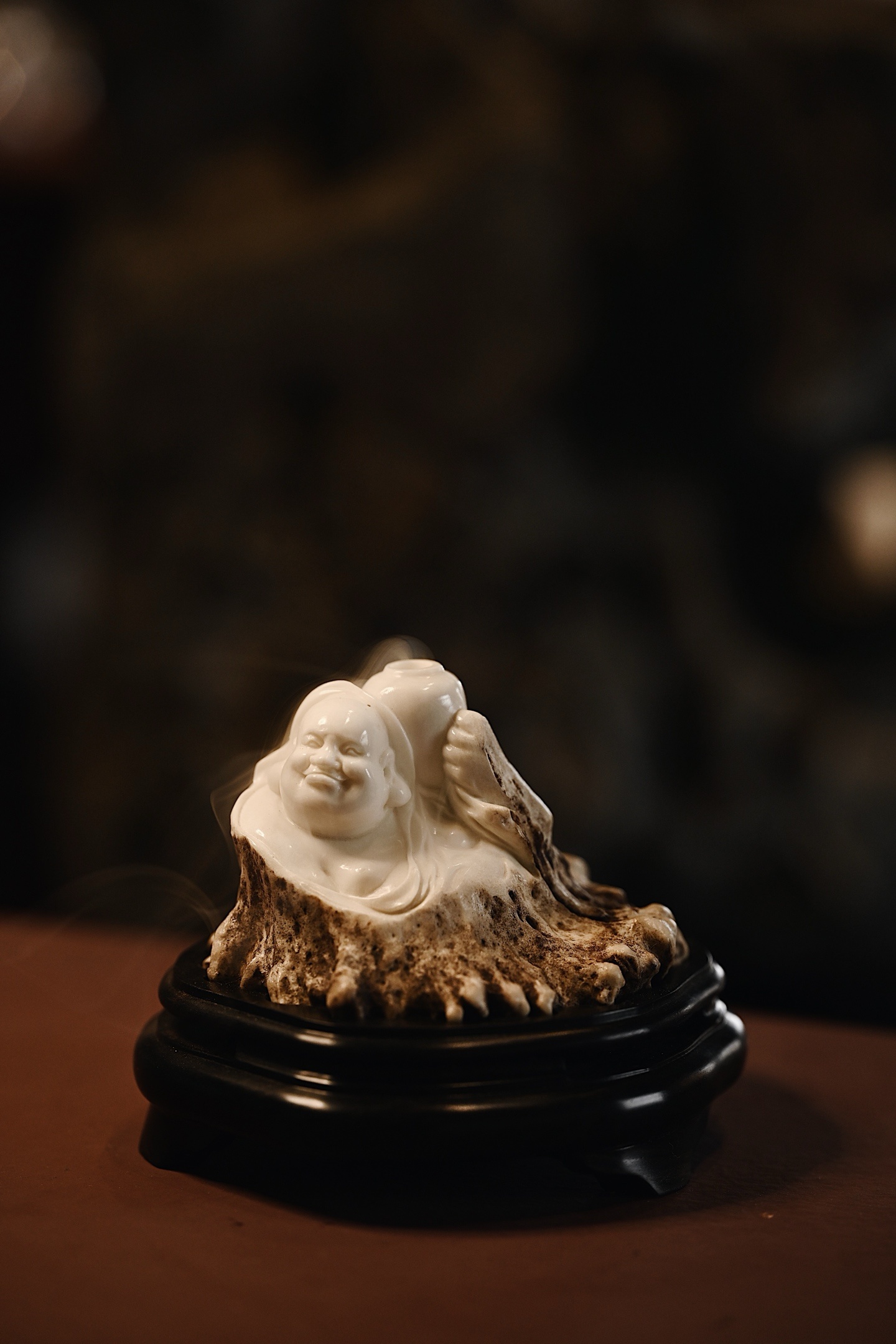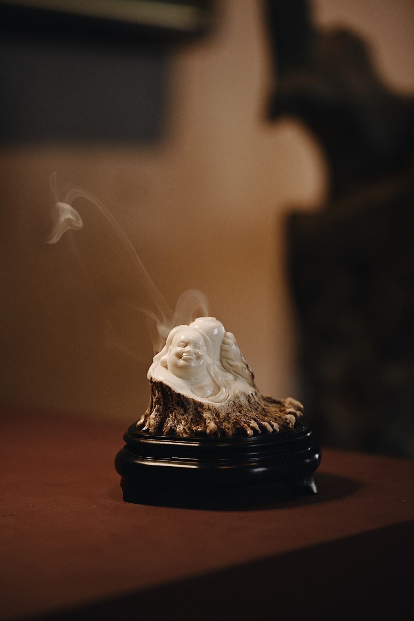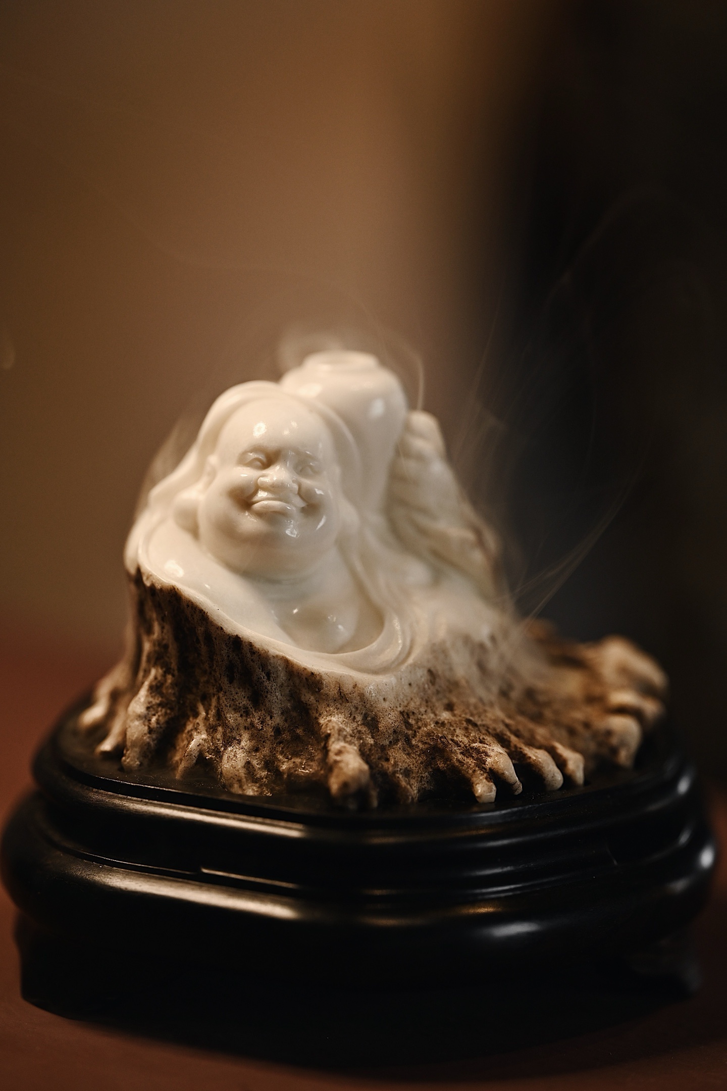 鹿角 | 欢喜弥勒 香炉料质清润,雕刻弥勒笑意盈盈,焚香出烟,一派仙风道骨之韵。