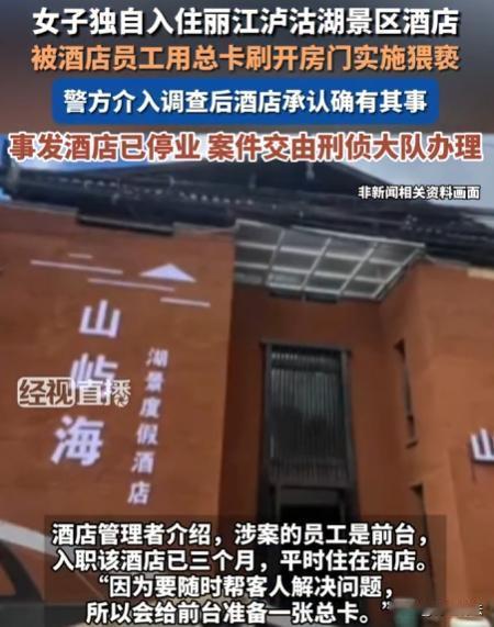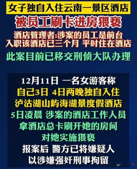 云南丽江,一女子独自到泸沽湖景区旅游,入住当地酒店,连续两晚平安无事让她放松警惕,然而5号凌晨,酒店前台王某用万能总卡刷开她房门,对她进行猥亵,女子惊醒反抗后报了警,民警以涉嫌强奸刑拘了王某,可酒店的处理方式让女子心寒,自出事后6天的时间,仅收到一条酒店轻飘飘的道歉信息,而酒店照常营业,记者介入后才显示暂无房型,酒店还称是员工个人行为,各方回应也没让女子满意。 (信息来源:红星新闻、极目新闻、新京报) 12月3日,女子小雨(化名)独自来到泸沽湖旅游,入住了当地的一家度假酒店。 头两晚,住的体验还不错,小雨渐渐放松了警惕,谁能想到,5日凌晨,酒店前台王某,拿着万能总卡刷开了小雨的房门。 当时小雨正睡得香,毫无防备,王某一进来,就对她进行 猥 亵。 小雨被惊醒,她开始拼命反抗,大声呼救,在激烈的反抗中,她成功挣脱后报了警。 当天上午,民警将王某带走。 经调查,以涉嫌强奸立案,对王某采取了刑事拘留措施,案件随后移交刑侦部门进一步调查。 小雨本以为,自己报了警,酒店会重视起来,会给她一个合理的交代。 可现实却让她心寒不已,从5日出事到11日,整整6天时间,酒店仅仅给她发了一条道歉信息。 内容丝毫没有体现出对这件事的重视,更没有对后续处理的任何承诺。 而酒店依旧照常营业,仿佛什么事都没发生过。 直到记者介入后,酒店才有了点动静,在订房平台上显示暂无房型。 面对记者询问,酒店负责人还轻描淡写地说,这是员工个人行为,和他们酒店没关系。 更让人气愤的是,酒店还称给员工发万能总卡是行业惯例。 小雨对酒店这样的态度和回应,失望透顶,她期待能得到酒店的真诚道歉和合理赔偿,能感受到酒店对客人安全的重视,可酒店却一次次让她寒了心。 各方回应都没能让她满意,她不知道自己还能怎么办,只能无助地等待一个公正的结果。 酒店,该不该为王某的行为负责呢? 酒店觉得这是员工个人行为,和他们无关,可事实真的如此吗? 酒店给员工发万能总卡,却没有严格的登记审批和监控措施,这明显是管理上存在巨大漏洞。 酒店作为经营场所,有义务保障客人的人身安全。 王某能轻易拿到万能总卡进入客人房间,酒店没有尽到应有的安全保障义务,就必须对客人的损害承担责任。 而王某,他的行为已经触犯了法律,涉嫌强制猥亵罪或强奸罪,必须为自己的犯罪行为承担刑事责任。 难道酒店的一句属于员工个人行为,就能推脱所有责任吗? 从法律角度讲,这显然不行。 根据《民法典》第1198条规定,宾馆、商场、银行、车站、机场、体育场馆、娱乐场所等经营场所、公共场所的经营者、管理者或者群众性活动的组织者,未尽到安全保障义务,造成他人损害的,应当承担侵权责任。 酒店给员工发放万能总卡,却没有建立严格的审批登记制度,也没有有效的监控措施来防止员工滥用总卡,这明显没有尽到安全保障义务。 王某利用万能总卡进入小雨房间实施猥亵行为,给小雨造成了身心伤害,酒店就应该对小雨的损害承担相应的民事赔偿责任。 王某的行为,已经涉嫌犯罪。 如果他只是对小雨进行猥亵,没有进一步的暴力或强迫发生性 关 系的行为,那么他涉嫌强制猥亵罪。 根据《刑法》第237条规定,以暴力、胁迫或者其他方法强制猥亵他人或者侮辱妇女的,处五年以下有期徒刑或者拘役。 要是王某在猥亵过程中,使用了暴力、胁迫等手段,强行与小雨发生了性 关系,那他就涉嫌强奸罪。 根据《刑法》第236条规定,以暴力、胁迫或者其他手段强奸妇女的,处三年以上十年以下有期徒刑。情节严重的,处十年以上有期徒刑、无期徒刑或者死刑。 现在很多酒店为了管理方便,给员工发放万能总卡,但却忽视了安全管理。 一些酒店只注重经济效益,对员工的管理和培训不到位,导致类似的安全隐患长期存在。 这不仅损害了客人的权益,也影响了酒店行业的整体形象。 无论是酒店经营者还是我们普通游客,都要重视安全问题。 酒店要加强管理,完善安全制度,保障客人的人身安全。 游客在外出旅游时,也要提高警惕,选择安全可靠的住宿场所。 酒店称给员工发万能总卡是行业惯例,这能成为他们免责的理由吗? 根据《民法典》规定,经营场所未尽到安全保障义务造成他人损害应担责。 酒店发万能总卡却无严格管理,没尽到保障客人安全的义务,不能免责。 王某如果只是猥亵小雨,会受到怎样的法律制裁? 如果王某只是猥亵,涉嫌强制猥亵罪。 按刑法规定,以暴力等手段强制猥亵他人,处五年以下有期徒刑或者拘役。 目前警方已对王某刑拘,案件移交刑侦,但酒店还没个明确处理结果。 希望酒店能正视自己的问题,积极承担责任,给小雨一个合理的赔偿和真诚的道歉。