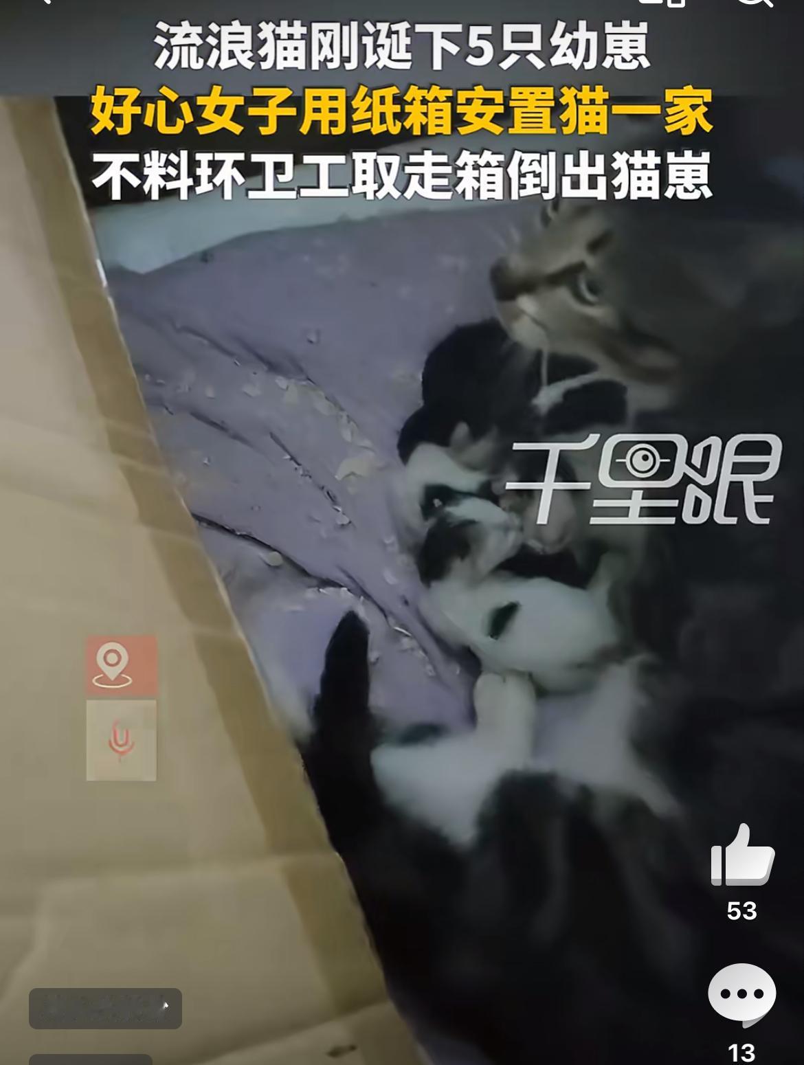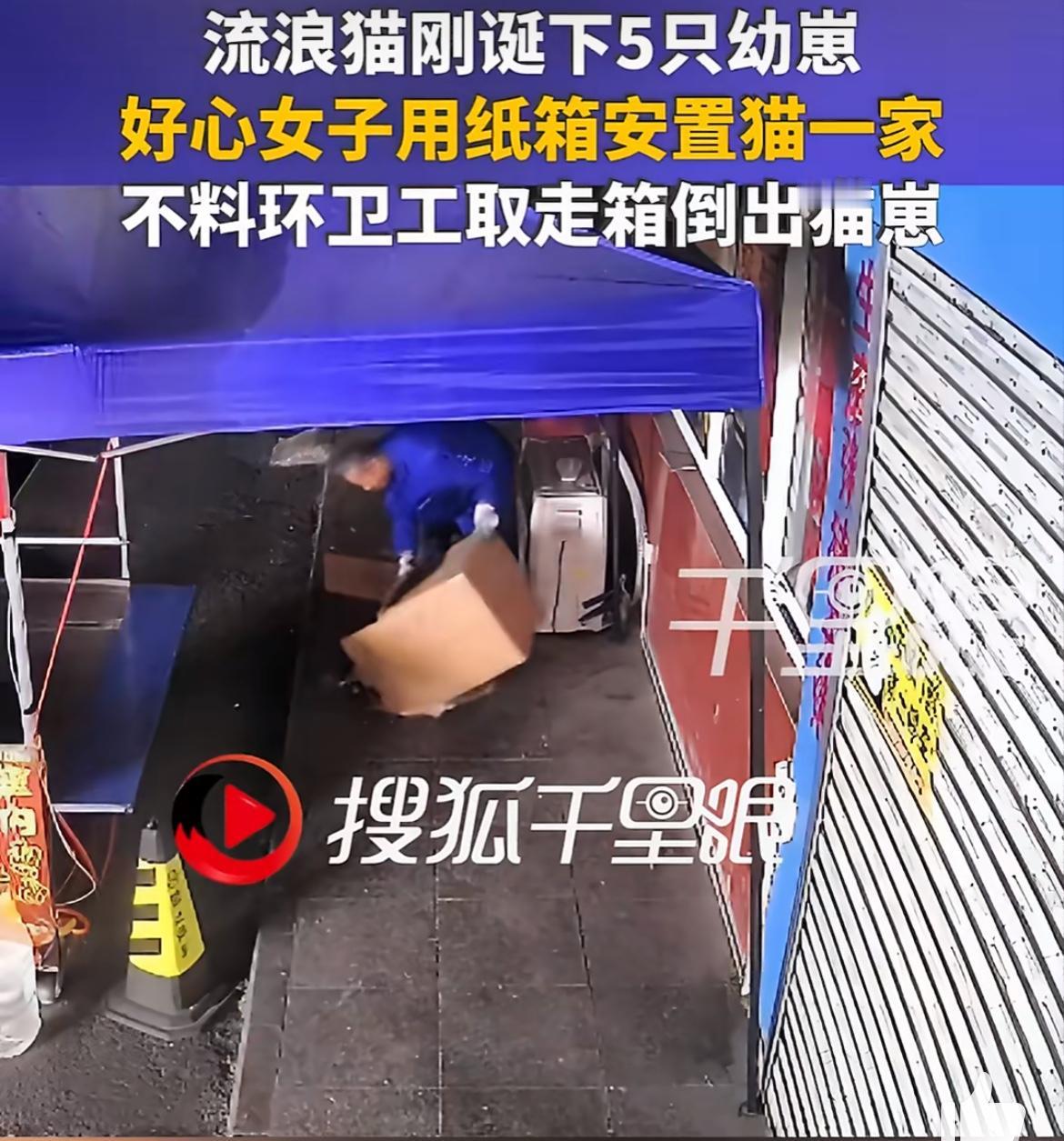 广西贺州一环卫工为捡一个纸箱,抄了流浪猫一家6口的家。这个流浪猫下了5个崽,天气寒冷无处躲藏,附近开店的女子找了一个纸箱垫了一些衣物,给流浪猫弄一个临时的窝,放在店门口,没想到这个纸箱却被捡废品的环卫工盯上了,不顾里面住着小猫一家,强行把他们像倒垃圾一样倒出来,拿走了纸箱。流浪猫 流浪猫狗冬天