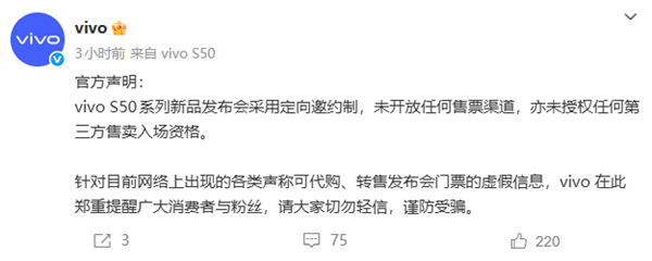都开始这么带蓝厂的节奏了吗?vivo声明,S50系列12月15日19:00发布会系定向邀约,未售票也未授权第三方售票,提醒勿信代购信息。