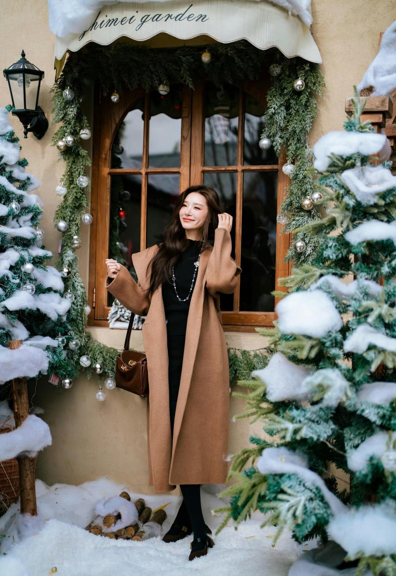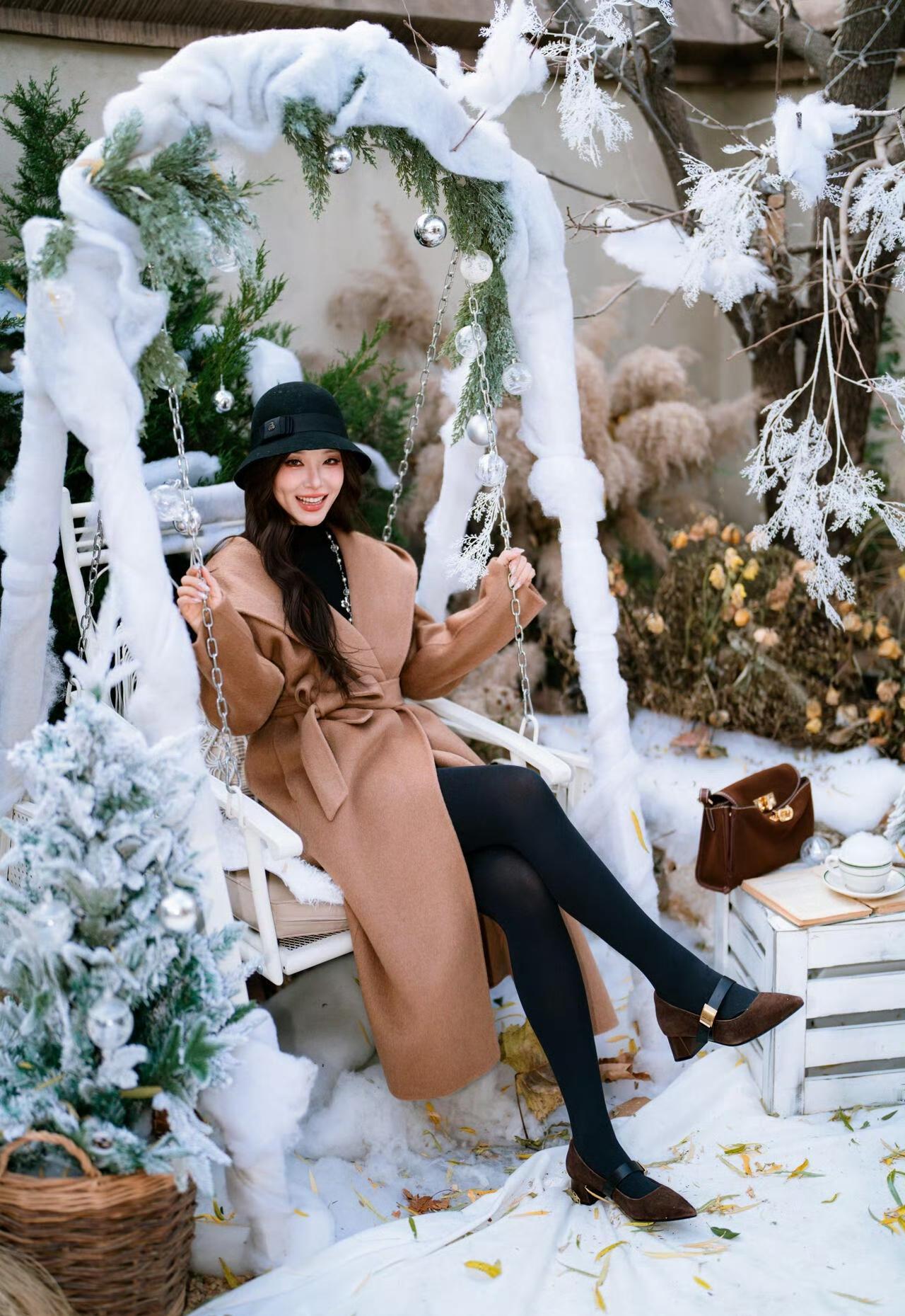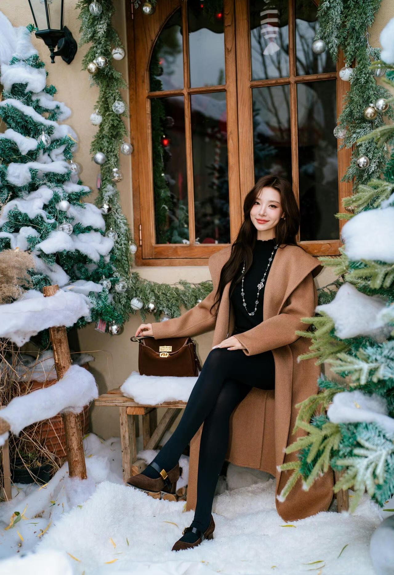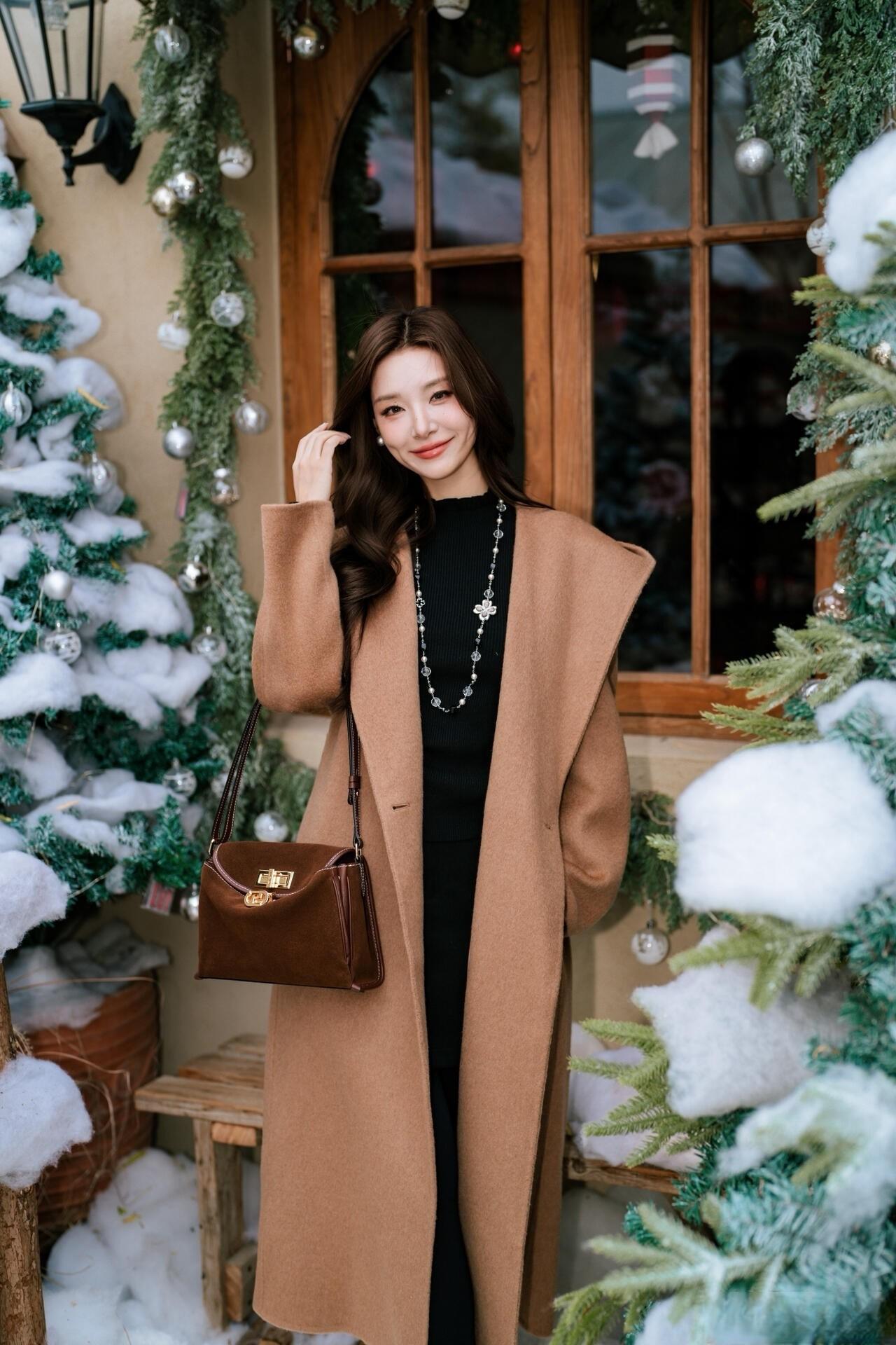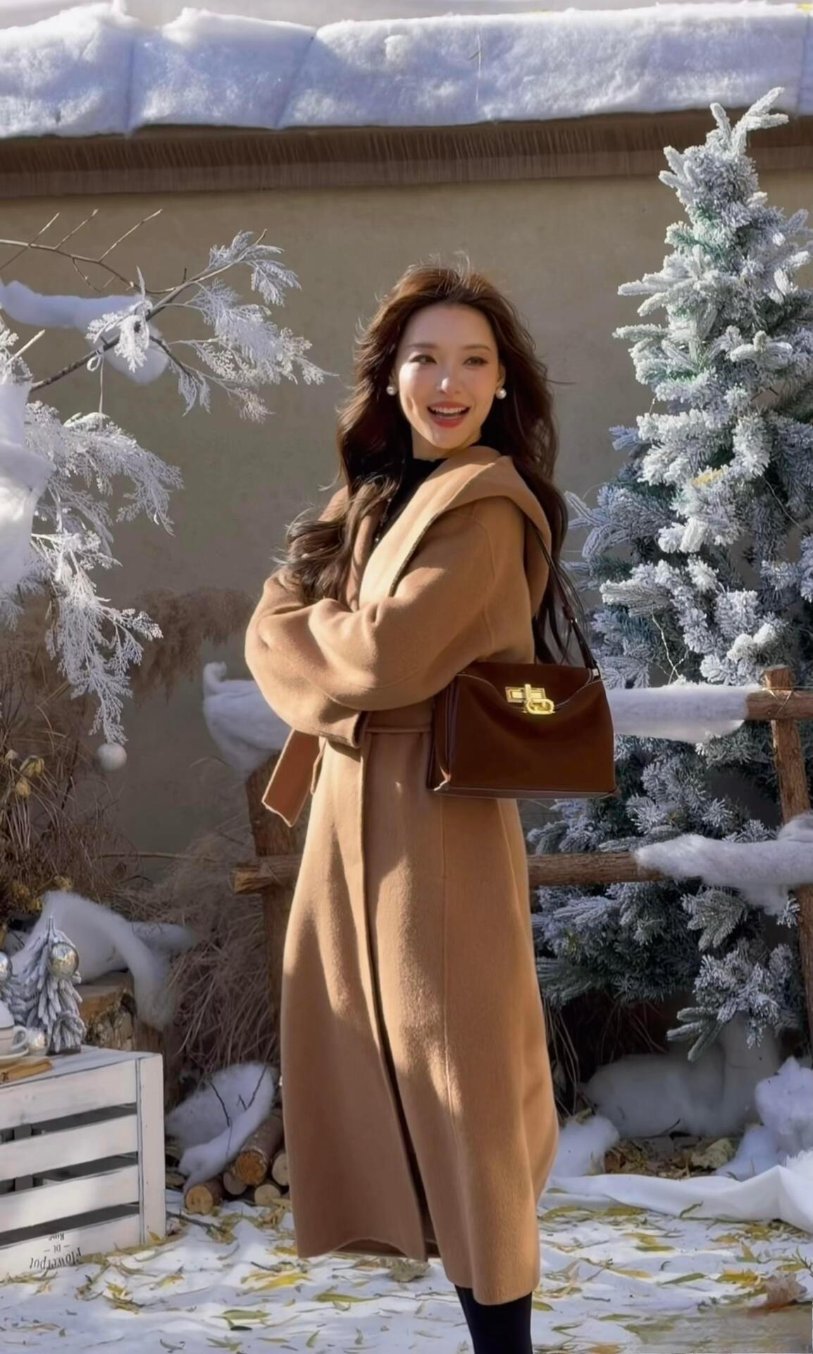 这套穿搭是温暖高级的冬日驼色氛围风,适配圣诞季的温柔质感拉满。驼色长款大衣自带冬日温暖氛围,大翻领设计更显优雅;内搭全黑打底,简约基础款突出了大衣的质感,让色彩层次更和谐。 同色系棕色包包与大衣呼应,强化了整体的温暖调性;带金属扣的棕色鞋履精致复古,与配饰项链形成细节呼应,提升了造型的精致度。能充分展现穿着者温暖高级的冬日氛围魅力。经典驼色穿搭 驼色系搭配 浅驼色羊绒大衣