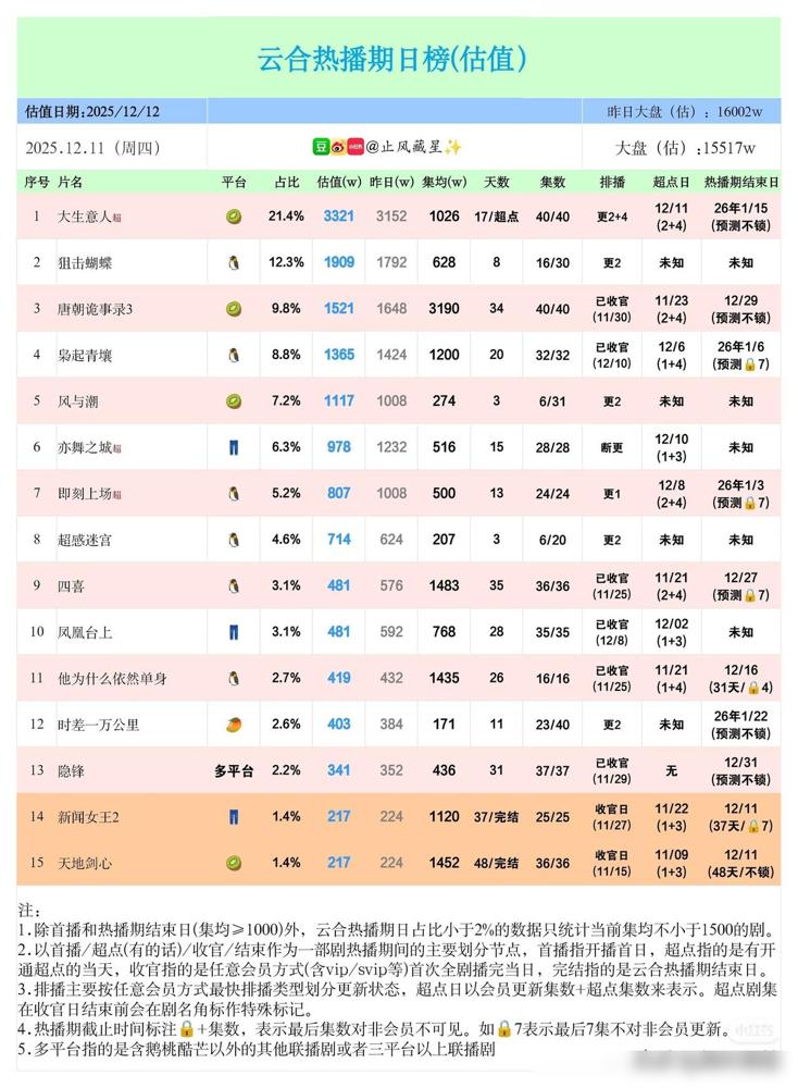 12.11云合热播榜:《大生意人》领跑,大盘再低 今天刷到云合的期日榜,说白了就是12月11日各剧的播放表现排了个队,大盘估值15517w,在整体偏低的情况下,谁在真跑出来一眼就能看见。 最显眼的还是《大生意人》。21.4%的占比、3321w估值,单集都过千万,已经播了17天还能站在第一,这种续航力在现在的环境里不算常见了。 第二第三也挺稳。《狙击蝴蝶》占比12.3%守住第二,《唐朝诡事录3》9.8%排第三。一个偏现偶节奏,一个是成熟IP,受众不重合,但都没被挤下去。 我更在意的是《枭起青壤》。都收官了还能有8.8%的占比,这种情况一般要么是口碑带动补看,要么是平台长尾还在发力,热度没立刻散。 新剧这边,《风与潮》上线才3天估值就破千万,算是一个挺好的开局,至少说明前几集把人留住了。后面能不能站稳,还得再观察。 收官的《新闻女王2》《天地剑心》虽然整体热度回落,但集均数据还撑得住,感觉不像“播完就凉”的那种,更像自然下线。 整体看下来,大盘确实低,但不是没剧看,而是热度更集中、更分层了。你现在追的是榜上的哪一部?