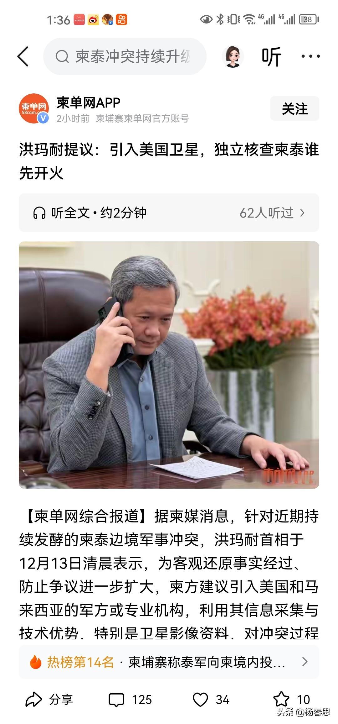 洪二亲美走到黑,智商堪忧,这样的人还想世袭领导人。居然提议引入美国卫星调查是谁先开火,谁先开火都不重要了,重要是他为什么被打?挨打的原因嘛无非三种,第一柬埔寨确实先开火,埋地雷炸了泰国士兵。第二,泰国先开火。第三,泰国发现柬埔寨自己把身后的大树砍了,泰国抓住了千载难逢的机会收复争议区域。 其实网友分析的比较准,就是柬埔寨与美国走得越来越近,对一直扶持,支持他们的的东大疏远了,特别是与美国签订了什么毒丸的贸易协定,触犯了东大的利益,忘恩负义白眼狼,被教训是自然的事情。