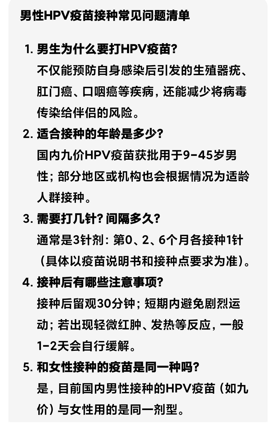 这个,男生也需预防? 雪后初晴 路面冰未化透 踩上去偶有打滑 却拦不住我们出门兴致 玩雪、打疫苗、买好吃的 一路安排妥当 候诊时 瞥见墙上宣传画 才知HPV疫苗 不只是女生要打 男生也需预防 HPV防护非女生专属 男生感染风险更高 早预防更安心 男生是否要接种HPV疫苗 听护士姐姐来科普 HPV不仅致女性宫颈癌等病 也可能让男性患生殖器疣、肛门癌、口咽癌等症 且男性可能将病毒传染给伴侣 男性感染相关HPV比例(91.3%) 甚至高于女性(84.6%) 目前国内部分HPV疫苗(如九价) 已获批用于男性接种 建议适龄男性尽早接种 更好保护自己和他人 男性HPV疫苗接种常见问题清单(图四,来自豆包) HPV科普 HPv疫苗