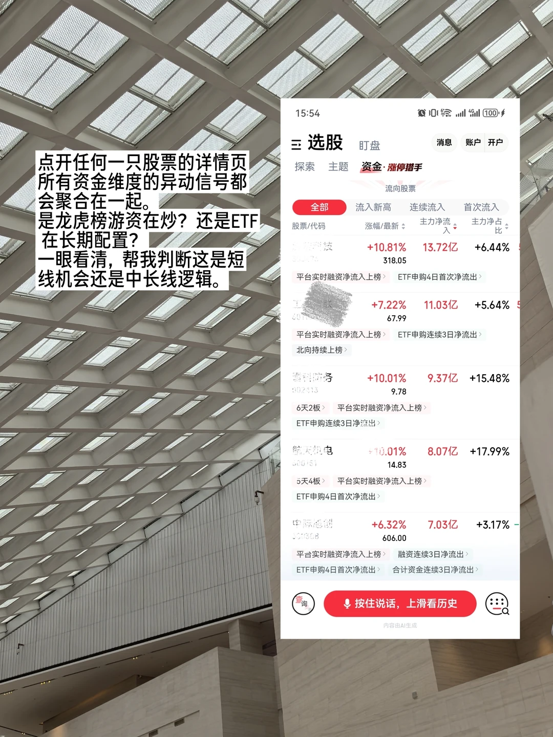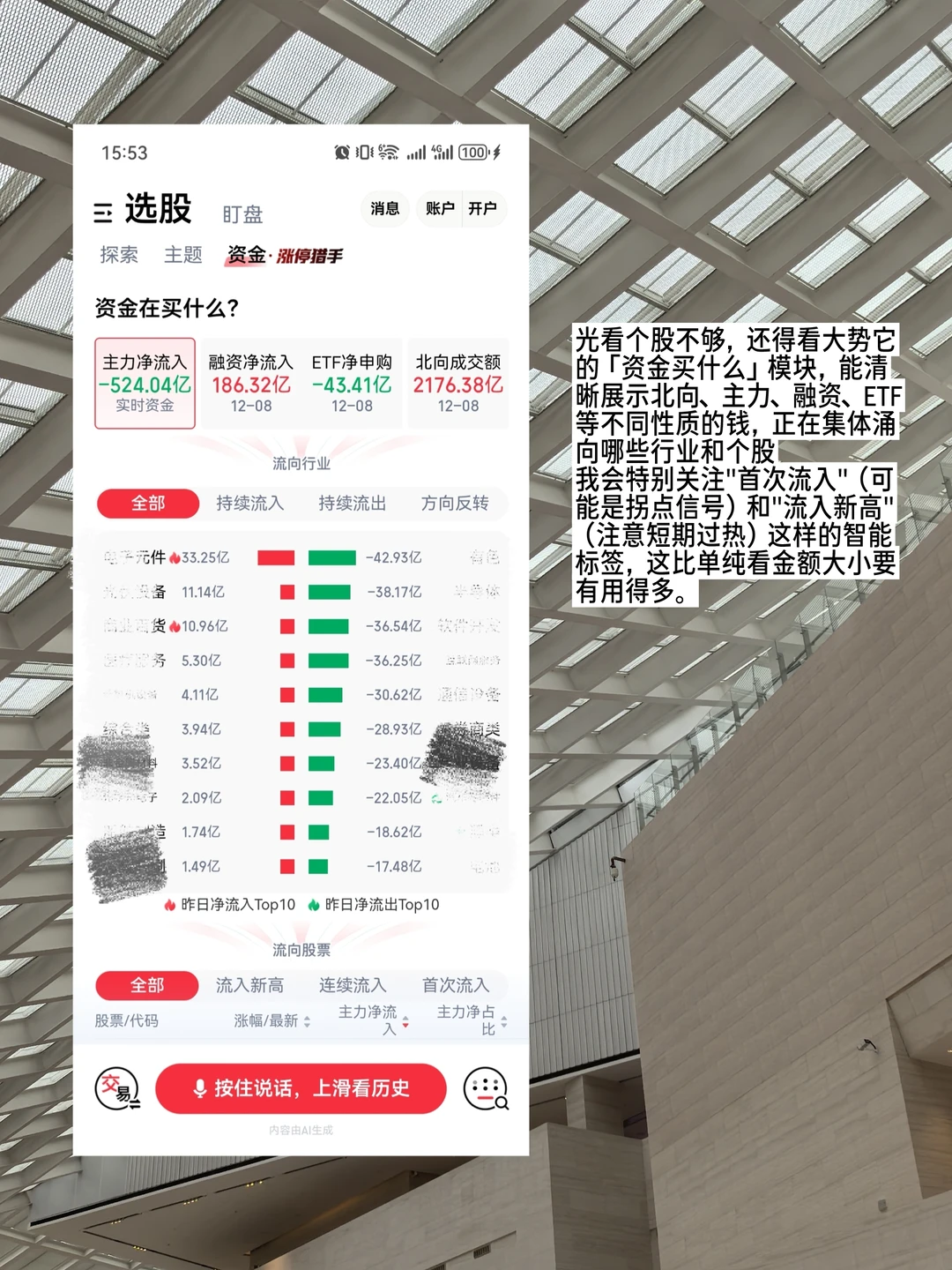 光看个股不够,还得看大势。「资金买什么」模块,能清晰展示北向、主力、融资、ETF等不同性质的钱,正在集体涌向哪些行业和个股。我特别关注“首次流入”(可能是拐点信号)和“流入新高”(注意短期过热)这样的智能标签,这比单纯看金额大小要有用得多。