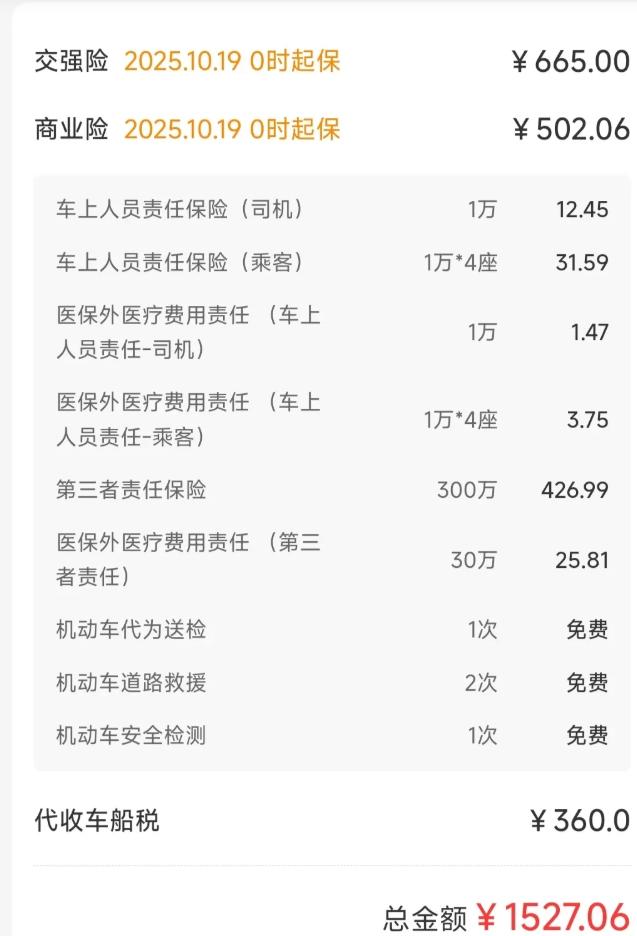 这是我今年的汽车保险,总共是1527块钱。 这其中交强险665块,商业险502块。这价格很明显就是没有车损险的,因为好歹是20多年的老司机,只要遵纪守法出行,就不可能出现属于我全责或者部分责任的情况。 但是第三者责任保险是必须要买的,而且必须要买300万元以上,因为谁也不知道会不会在路上碰到豪车之类的。 各位有兴趣的话可以参考一下我的投保方案,我觉得这对10年以上老司机来说,已经是最合适的投保方案了。 一年1527块钱,平摊12个月的话,一个月也就是120块钱左右,这对一个有车一族来说基本没有什么太大压力,却可以给我们最大的保障。 另外再顺便讲一下,这个保险公司是后来我新换的一家,因为之前的保险公司有问题。 之前的保险公司很令人奇怪,我从来就没有出过险,但是我的车险居然连续三次上涨。我自从用他家保险之后就没有报过保险,很难理解为什么一直让保费上涨。 正常来说的情况是这样的,越是不出险,保险公司给我们的保费就要越低才对,因为像这样的客户才是保险公司最喜欢的客户,难以理解他们为什么要将客户往外撵。 结果等到第二年,那家保险公司又有人给我打电话,我就直接回复说,你们的我以后就不考虑了。 现在换了保险公司后,基本上每个月能省下个40来块钱,而且预计以后还平平安安的话,保险公司一定会继续下调价格,这也算是给各位提个醒吧。【来自懂车帝车友圈】