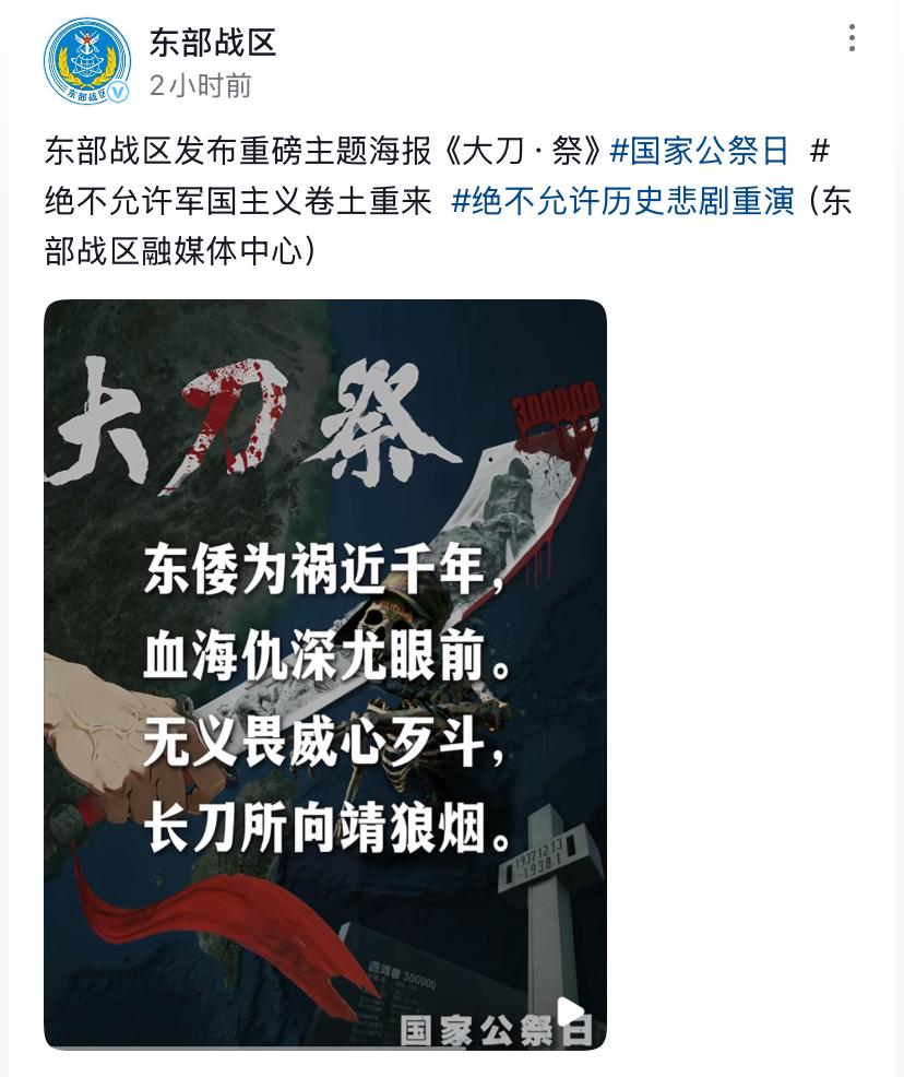 东部战区发布重磅主题海报《大刀、祭》 东倭为祸近千年,血海仇深尤眼前。 无义畏威心歹斗,长刀所向靖狼烟。 这血泪斑斑的历史,怎能忘记?! 落后就要挨打!这是用30万同胞的生命换来的惨痛教训! 我们不能让历史重演! 勿忘国耻,吾辈自强!让逝者安息,让民族屹立!