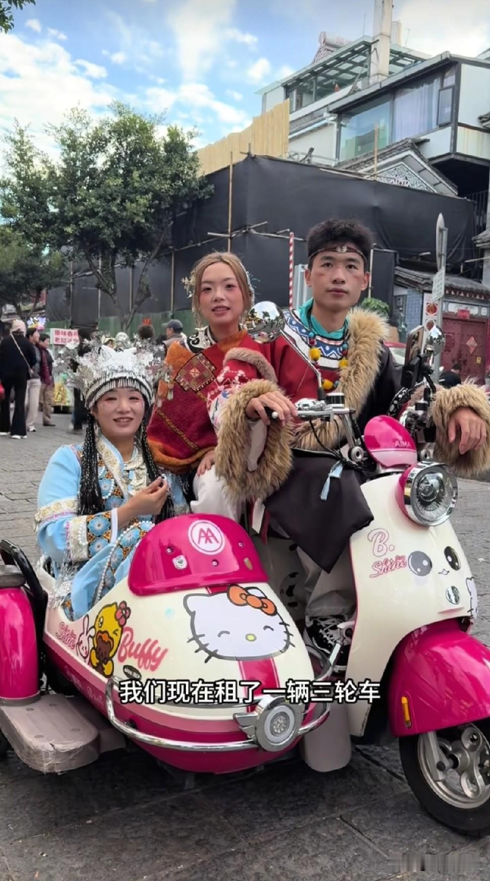 有网友说,海军的打扮像封神榜里的人物,还真有些像诶!许健华大妹还有海军来到了云南大理,此行他们准备带货云南农产品。 许建华团队带货前夕,历来都是要拍视频预热。许健华和大妹还有海军都换上了云南的民族服装,脸上全都上了妆。他们还租了挎斗摩托车,一路风驰电掣,搞笑的是挎斗摩托车居然是粉色的,上面画着hello Kitty的图案。 在寻亲团体里,持续火这么长时间还有很多人关注的,非谢浩男一家莫属了,大概是由于这一家人有独特的魅力吧。
