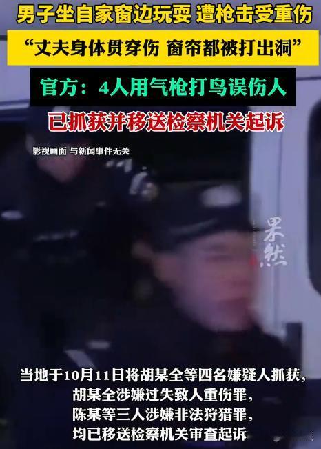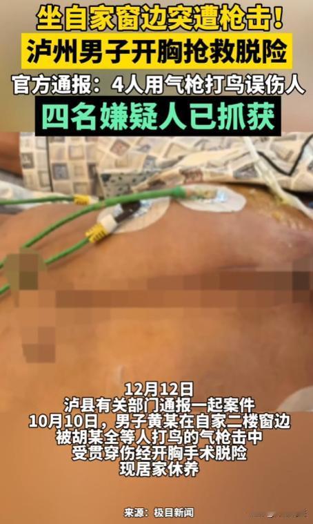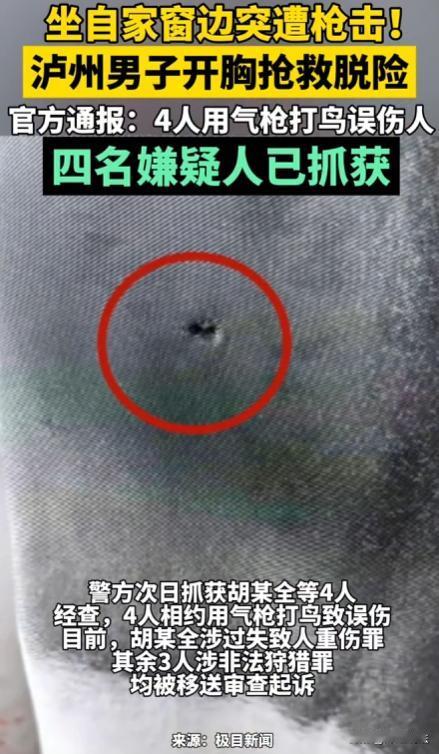 四川泸州,一男子在自家二楼窗边休息时,突然遭遇枪击,子弹穿过窗帘,直接打进男子胸腔,情况危急,家人紧急送医,男子做完开胸手术才捡回一条命,警方调查发现,原来是4名男子当天在男子家附近拿气枪打鸟,其中一人失手误伤男子,酿成大祸。 (信息来源:大河报、法治视讯、极目新闻、齐鲁壹点) 2025年10月10日上午,黄某正躺在自家二楼窗边休息,阳光透过窗户洒在身上,暖烘烘的,他闭着眼享受着。 突然,砰的一声,黄某只觉得胸口像是被重锤狠狠击中,钻心的疼痛瞬间袭来,他猛地睁开眼,低头一看,胸口有血正汩汩地往外冒,衣服被染红了一大片。 再一看,窗户上的窗帘也被打穿了一个大洞,显然是有子弹射了进来。 家人听到动静,急忙跑过来,看到这一幕都吓坏了,他们手忙脚乱地简单给黄某处理了一下伤口,就赶紧把他送去救治。 经检查后发现,子弹造成了贯穿伤,直接打进了黄某的胸腔,情况十分危急,迅速展开抢救,紧急为黄某做了开 胸 手 术,经过一番努力,黄某才终于脱离了生命危险。 黄某妻子看着躺在病床上的丈夫,她怎么也想不明白,丈夫好好在家休息,怎么就遭了这样的罪。 为了弄清楚事情的真相,也为了让更多人知道这件事,她把家里的监控画面和丈夫的遭遇做成了视频发到了网上。 视频发出去后,引起了当地人的关注。 有当地人透露,2个月前就见过几个人拿着气枪在林子里打鸟,当时大家也没太在意,毕竟打鸟这种事在农村偶尔也能见到,可没想到,后来就听说有人在家被枪伤了。 黄某妻子得知后,更加坚信丈夫的受伤和那些打鸟的人有关,她一边照顾着丈夫,一边焦急地等待着民警的调查结果。 10月11日,民警经过调查,终于锁定了嫌疑人胡某全等4人,并迅速将他们抓获。 原来,当天胡某全等4人拿着气枪在黄某家附近打鸟,他们看到林子里有鸟,就兴奋地举枪射击,胡某全在射击的时候,没有控制好方向,子弹偏离了目标,直接射进了黄某的家里,正好打中了在窗边休息的黄某。 黄某经过一段时间的治疗后,虽然身体还在恢复中,但好歹捡回了一条命,可这件事给黄某和他的家人带来的心理创伤,却不是短时间内能够愈合的。 胡某全等4人拿着气枪打鸟,这种行为本身就存在很大的安全隐患,气枪虽然不像真枪那样威力巨大,但近距离射击也能对人造成严重的伤害。 他们为了自己的娱乐,不顾周围人的安全,这种行为实在是太不负责任了。 那么,从法律的角度来看,这起事件又该如何认定呢? 胡某全在打鸟过程中,因为过失导致子弹射进黄某家,造成黄某重伤。 根据《刑法》规定,过失伤害他人致人重伤的,构成过失致人重伤罪。刑法第二百三十五条规定,过失伤害他人致人重伤,处三年以下有期徒刑或者拘役。本法另有规定的,依照规定。 在这起事件中,胡某全的行为与黄某的重伤有直接的因果关系,符合重伤二级的界定,所以胡某全涉嫌过失致人重伤罪。 陈某等3人虽然没有直接开枪打伤黄某,但他们和胡某全一起参与非法捕猎活动。 根据《野生动物保护法》规定,违反狩猎法规,在禁猎区、禁猎期或者使用禁用的工具、方法进行狩猎,破坏野生动物资源,情节严重的,构成非法狩猎罪。 陈某等3人的行为违反了野生动物保护法,涉嫌非法狩猎罪。 有些人法律意识淡薄,为了满足自己的私欲,不顾法律的约束,做出一些危险又违法的行为。 就像胡某全等4人,他们可能觉得打鸟只是一件小事,不会有什么严重的后果,所以才会肆无忌惮地拿着气枪去打鸟。 但他们没有想到,自己的一个小小举动,却给别人带来了巨大的伤害。 不要因为一时的贪玩或者好奇,就去尝试一些危险又违法的行为,也要提高自我保护意识,在遇到危险的时候,要及时采取措施保护自己。 目前,案件已移送检察机关审查起诉,后续将由法院审判。