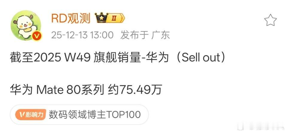 华为Mate80系列近一周销量增长37万左右,平均每天5万,还是很猛的,可惜就是供应仍比较紧缺。