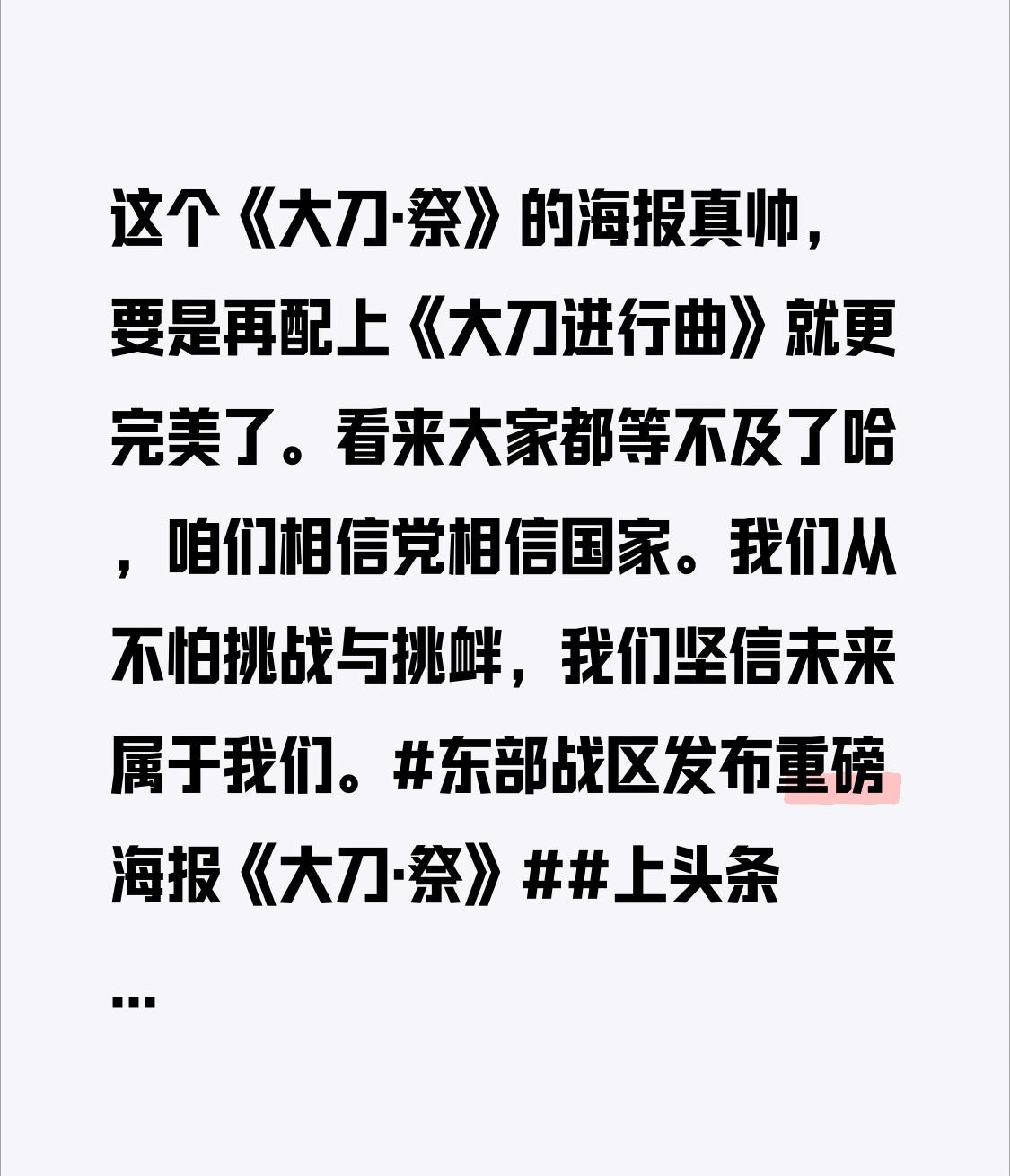 这个《大刀•祭》的海报真帅,要是再配上《大刀进行曲》就更完美了。看来大家都等不及了哈,咱们相信党相信国家。我们从不怕挑战与挑衅,我们坚信未来属于我们。