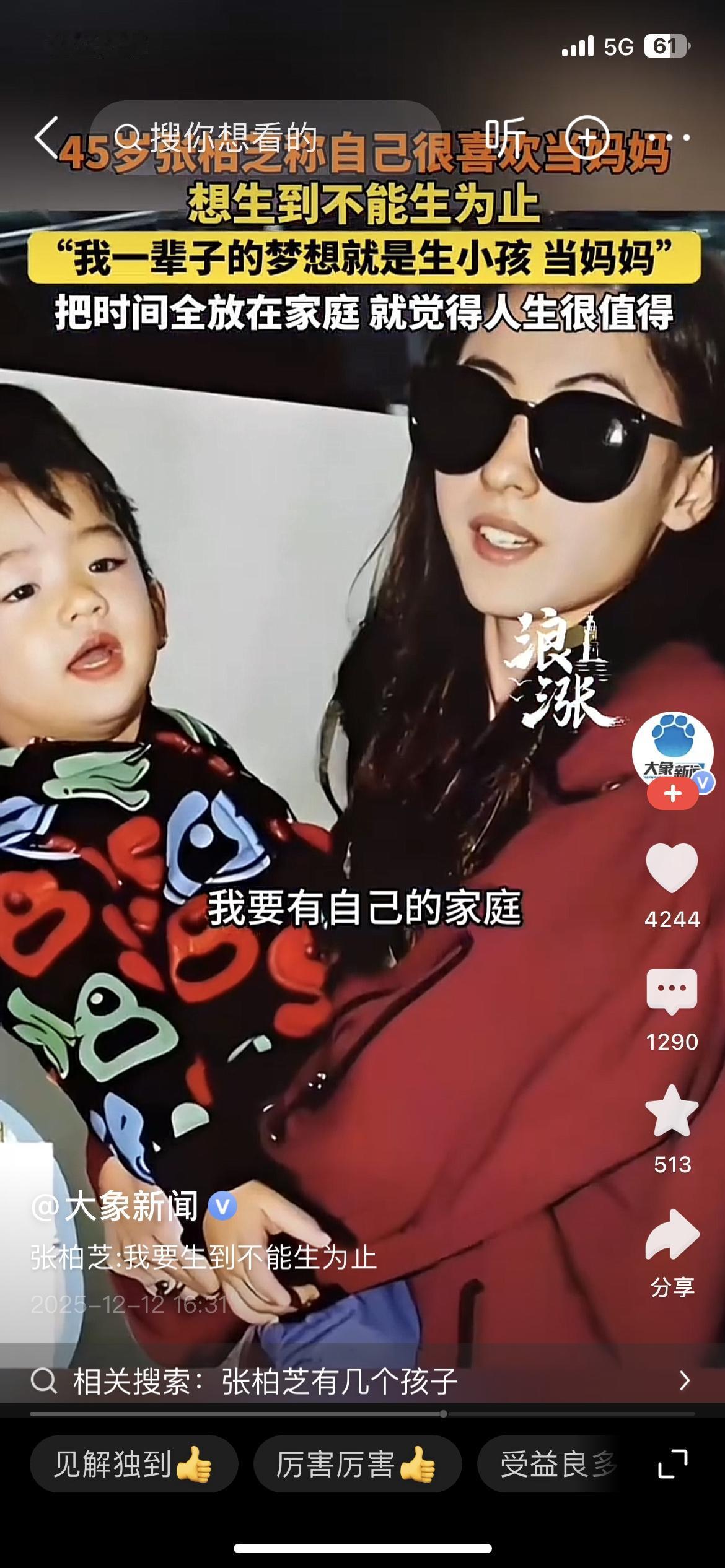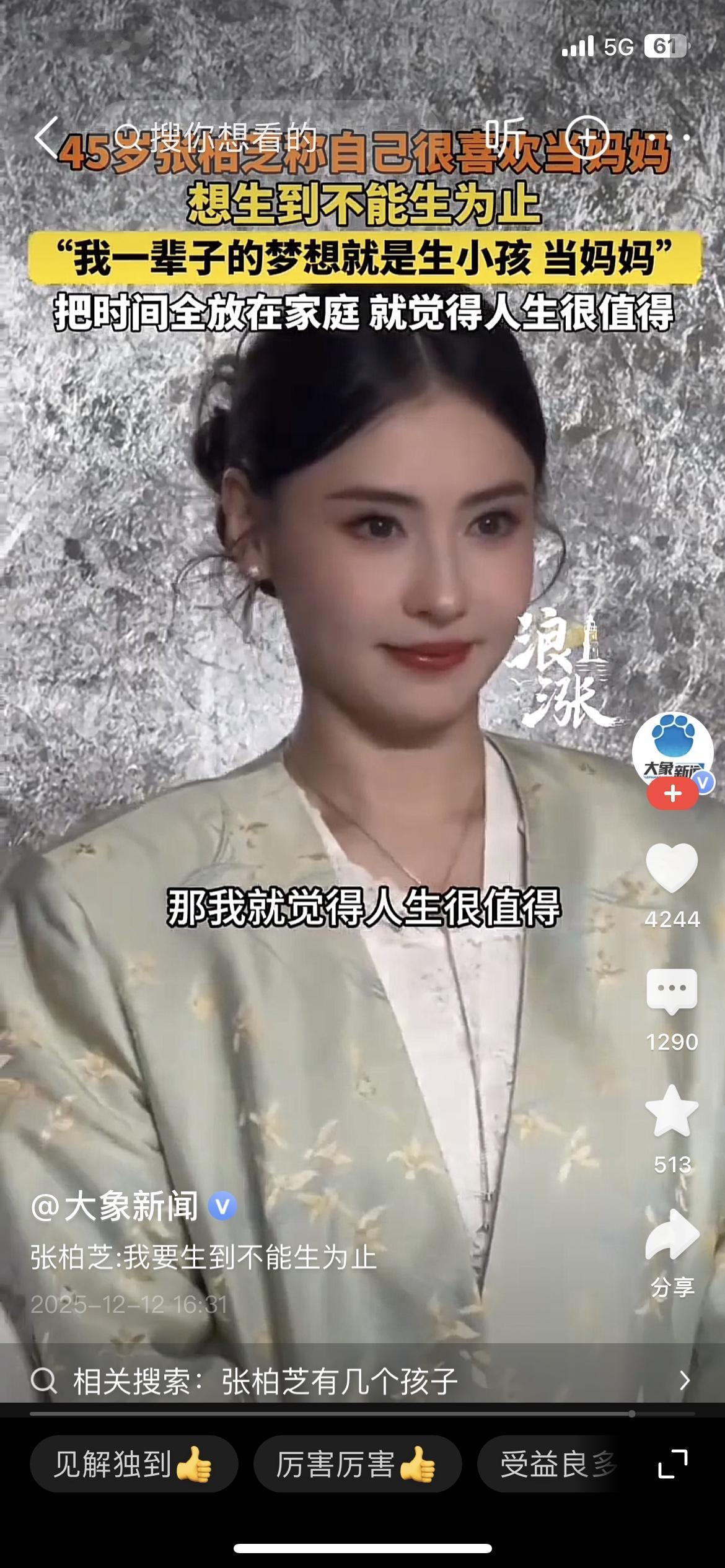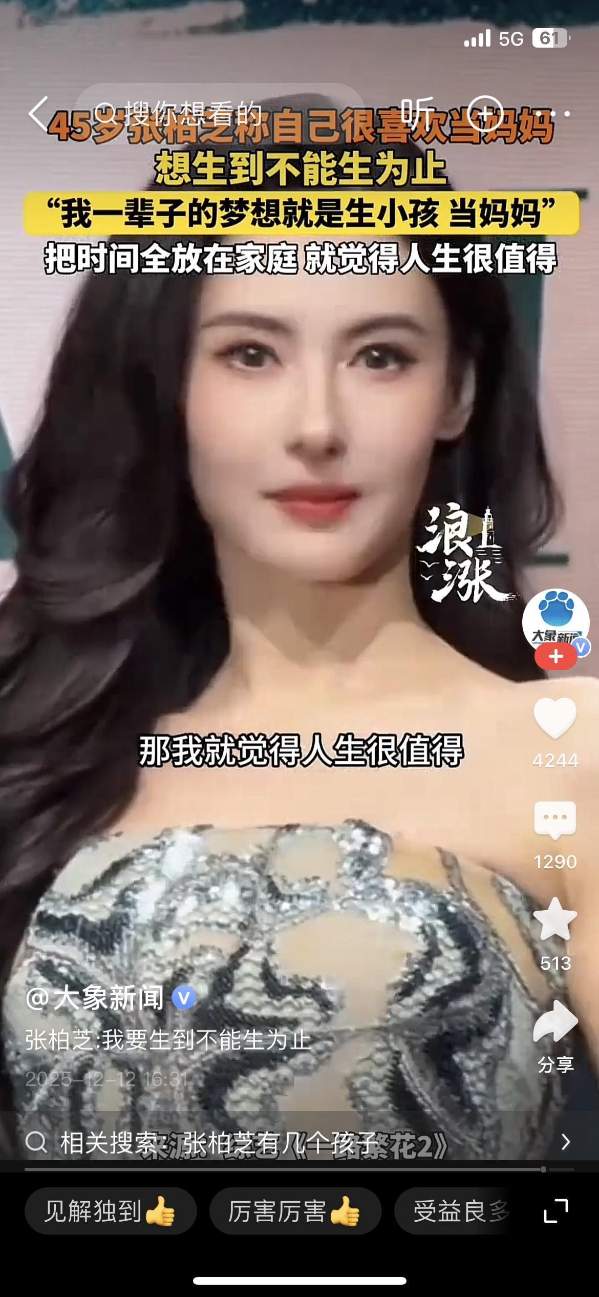 45岁张柏芝谈生育,想生到不能生为止引热议 平时关注明星家庭的朋友留心点,权威媒体刚曝出张柏芝的新采访! 45岁的她在综艺里说,一辈子的梦想就是生小孩当妈妈,还想生到不能生为止,连亲妈都劝她别再生了。 说实话,我身边也有朋友觉得当妈妈是人生最美的事,和张柏芝的想法特别像,只是大家的生育选择真的差很多。 咱普通人对“生儿育女”和“人生价值”的看法也各有不同,别用自己的标准去评判别人就好。 你怎么看张柏芝想生到不能生的想法?评论区唠唠~