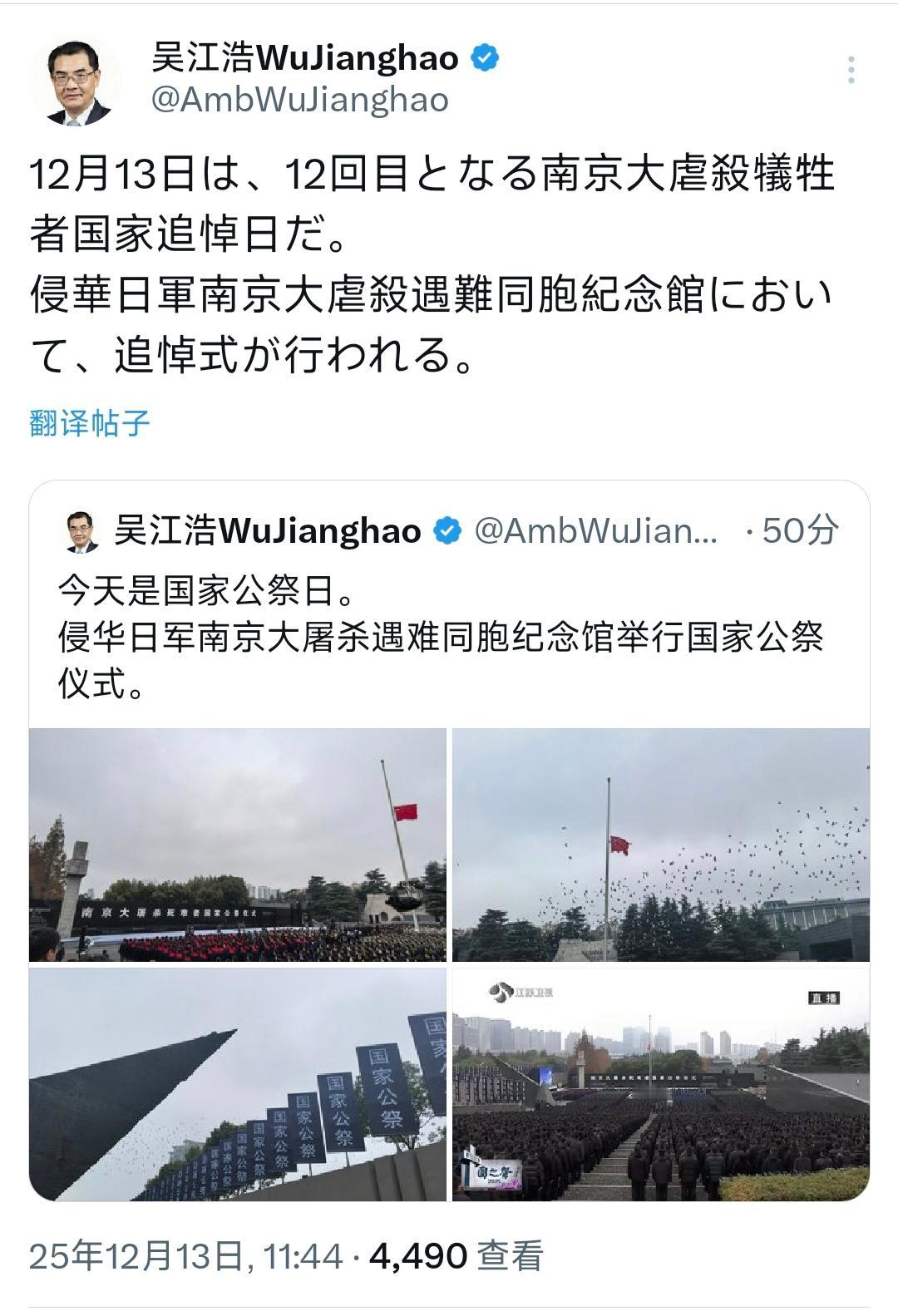 中国驻日本大使吴江浩今天(12月13日)用中日文发文写道:“今天是国家公祭日。侵华日军南京大屠杀遇难同胞纪念馆举行国家公祭仪式。” 今年是南京大屠杀惨案发生88周年,88年前的今天,南京城陷入了人间炼狱。30万手无寸铁的同胞,在日军的屠刀下惨遭杀害,这不是随便说的数字,而是铁证如山的历史事实。就在今年12月5日,侵华日军南京大屠杀遇难同胞纪念馆还公布了一批新征集的文物史料,每一件都在控诉着日军的暴行。 有两封日军士兵写的家信,让人看了牙根发麻。其中一封是日军士兵村田芳夫写给父亲的,他在信里轻描淡写地说,南京有个死刑栈桥,每天都在用日本刀斩杀或射杀中国的败残兵、伤兵,还把尸体抛进扬子江冲走,居然说“真痛快”。 经考证,这个村田芳夫所属的部队,在占领南京后确实在周边实施了大屠杀,而他自己后来在1938年在中国战死了。另一封是日军中尉山川仪仁写的,信上盖着“南京陷落纪念”的邮戳,他只提自己参与了日军入城式,还抢了副麻将准备当特产送人,但史料证明,他所在的部队当时就在南京幕府山参与了大屠杀。 还有一组老照片,定格了当时的惨状。有被日军炮火炸毁的南京中华门、长干桥,有日军入城式的嚣张场景,更让人揪心的是一张记录南京孩童沿街乞讨的照片。照片背面写着“南京唐山路宿舍附近孩子乞讨的实况”,那是日本侵略者占领下,普通百姓的真实遭遇。 另外,南京保卫战中牺牲的军医麦子莊的档案也被捐赠了出来,档案清楚记载,他1937年12月13日在南京突围战斗中阵亡,年仅29岁,留下了妻子和年幼的儿子。这些文物不是摆设,都是历史的见证,证明了南京大屠杀不是编造的,而是真实发生过的惨剧。 可能有人会问,都过去88年了,为啥还要反复提?因为有些日本人,就是不想承认这段历史。南京大学的教授说过,在日本,忘记南京大屠杀是人为的、系统化的行为。从上世纪五六十年代开始,就有人故意翻案,到了后来,中小学教材也被修改。现在日本的一些教科书里,根本不提日军的屠杀暴行,反而质疑远东国际军事法庭的裁定,甚至有教材直接抹去了南京大屠杀的内容。更过分的是,还有日本政客公然参拜供奉着二战甲级战犯的靖国神社,为军国主义招魂,甚至有人说南京大屠杀是“虚构”的。 我们铭记历史,不是为了延续仇恨,而是为了勿忘国耻,珍爱和平。88年过去了,南京从当年的断壁残垣变成了如今的繁华都市,中国也早已不是当年那个任人欺凌的国家。但我们不能忘记,和平是需要捍卫的,只有自身强大了,才能避免历史悲剧重演。这就是“吾辈自强”的道理,每一个中国人都要记住,国家的强大,是我们安身立命的根本。 而对日本来说,只有真正正视历史、深刻反省,以真诚的态度向受害国和人民道歉,才能获得真正的谅解,也才能在国际社会赢得尊重。如果一直回避、否认历史,只会让自己越来越孤立。日本驻华大使馆之前还提醒在华日本公民,在公祭日期间要注意安全,避免暴露身份,这恰恰说明他们心里清楚,日本当年的罪行是不可饶恕的,也说明他们对历史的态度始终没有端正。 今天,我们以国之名祭奠30万遇难同胞,吴江浩大使的发文,就是在告诉世界,历史真相不会被掩盖,正义不会缺席。作为普通人,我们能做的,就是记住这段历史,珍惜现在的和平生活,用自己的努力为国家的发展出一份力。吾辈自强,不是一句口号,而是刻在骨子里的信念,只有我们每个人都强大起来,国家才能更强大,历史的悲剧才永远不会再发生。