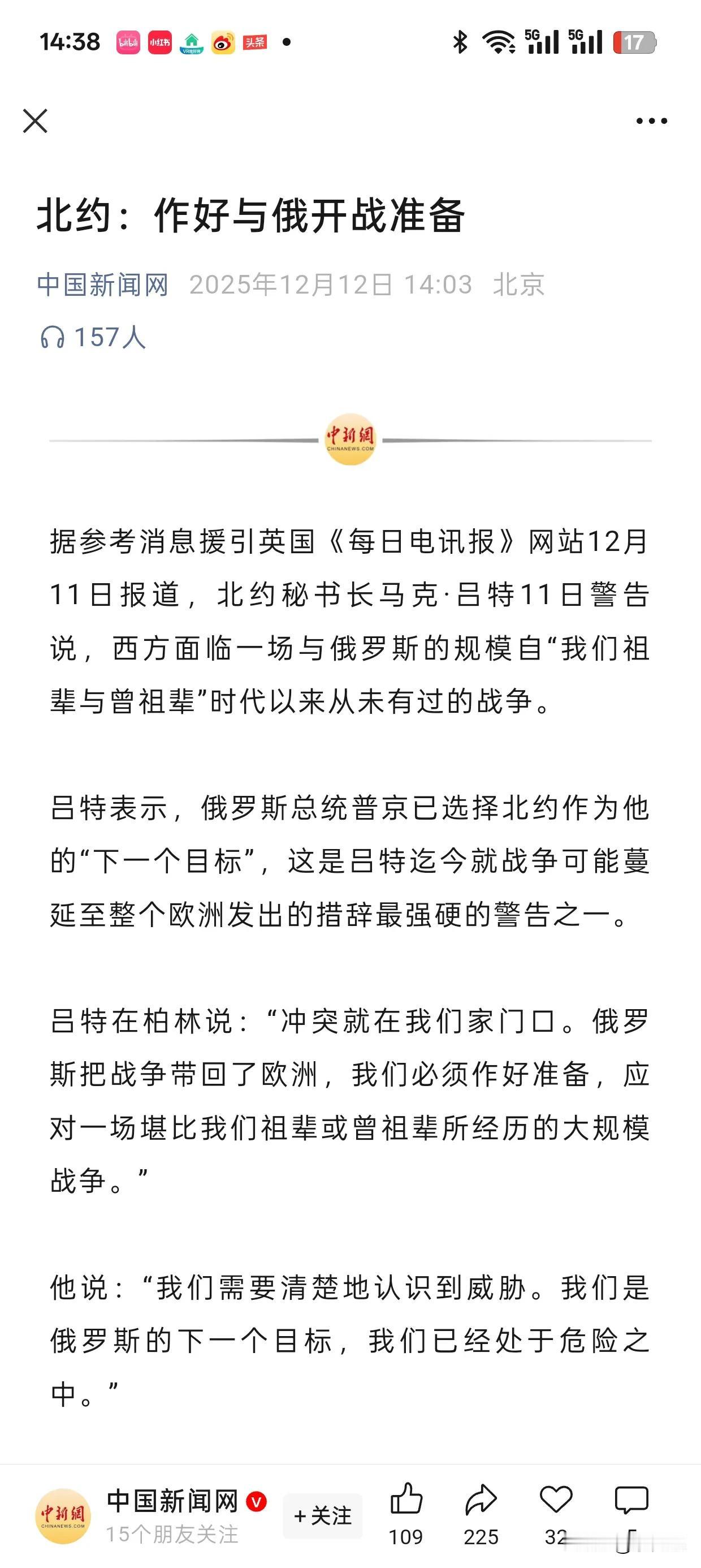北约秘书涨威胁俄罗斯说要搞一场从未有过的战争,主要是普大帝干赢乌克兰后,现在威胁北约!因为北约离当前北约部署的导弹中,俄罗斯最近的是波兰伦济科沃反导基地的导弹,其与俄罗斯飞地加里宁格勒的直线距离仅约150公里!!! 美国以为用乌克兰拖垮了俄罗斯军队,但他去重造了战斗民族的意志力,乌克兰没有了,战斗民族的下一个目标,除了北约没有想到其他地方。。。。 首先得说俄乌冲突这档子事。美国一开始的算盘很清楚,就是想靠着不断给乌克兰送武器、派援助,让俄罗斯在战场上慢慢耗着,把它的军队拖垮、国力耗空。可事与愿违,打了这么多年,乌克兰那边已经撑不住了。最新的情况是,乌克兰军民伤亡总数都突破40万了,全国超900万人流离失所,要么逃到国外,要么在国内颠沛流离,基辅街头很难见到青壮年男性,经济更是崩了,三年里萎缩超30%,外债高达2000亿美元,相当于整个国家一年GDP的110%还多,不少国有战略企业都被外资低价拿走了,完全成了被榨干价值的棋子。 反观俄罗斯,不但没被拖垮,反而被这场冲突重塑了凝聚力。之前有民调显示,俄罗斯民众对总统的支持率从2022年的64%涨到了2024年12月的76%,超过一半的人都觉得这场特别军事行动让社会更团结了,92%的人都认为自己是爱国者。经济上也没像西方预测的那样崩溃,2022年GDP只降了1.4%,2023年和2024年增速都超过4%,靠着重工业和军事相关产业的发力,还带动了不少就业,低收入人群比例也降了不少。美国本想消耗俄罗斯的军力,结果反而让战斗民族的意志力更坚定了,这是他们万万没料到的。 现在乌克兰基本没了对抗的能力,北约就开始坐不住了,吕特的威胁言论其实就是这种焦虑的表现。而让局势更紧张的,还有一个关键的军事部署——北约在波兰伦济科沃启用的反导基地。这个基地可不一般,部署的是美国陆基“宙斯盾”反导系统,不只能拦截导弹,还能发射射程2400公里的“战斧”巡航导弹,甚至能加装核弹头。最关键的是,它离俄罗斯的飞地加里宁格勒直线距离只有150公里左右。大家可以想象一下,相当于在人家家门口150公里的地方,架起了一套能打远程目标的武器系统,换谁都得提高警惕。 俄罗斯对这个基地的启用早就表达了不满,总统新闻秘书佩斯科夫明确说,北约把军事设施往俄罗斯方向推进,就是想遏制俄罗斯的军事潜力,俄罗斯肯定会采取相应措施来保证军力平衡。事实上,俄罗斯也确实这么做了,在加里宁格勒部署了S-400防空导弹营和“匕首”高超音速导弹中队,这种导弹速度能达到10马赫,整个波罗的海区域都在它的覆盖范围内。两边就这么形成了“针尖对麦芒”的局面,你在我家门口部署武器,我就针对性加强防御,紧张感自然越来越强。 可能有人会问,俄罗斯真的会把目标对准北约吗?普京其实已经说得很明白,俄罗斯无意与欧洲作战,这话他说了不止一遍,但如果欧洲主动要开战,俄罗斯已经做好了应对准备,甚至警告说要是真打起来,可能很快就会出现没人能和俄罗斯谈判的局面。说白了,俄罗斯的态度是“人不犯我,我不犯人”,但也绝不怕事。 北约之所以这么紧张,还有个深层原因是他们的东扩计划。这些年北约一直在往东推进,把军事前沿不断向俄罗斯边境靠近,芬兰和瑞典加入北约后,北约与俄罗斯的边境线直接延长了1300公里。现在又在波兰部署这种近距离的反导基地,等于把军事压力直接怼到了俄罗斯脸上。在俄罗斯看来,这已经不是简单的军事部署,而是对自己生存空间的挤压,所以必须强硬回应。 再说说美国在里面的角色。表面上看,美国通过给乌克兰援助,消耗了俄罗斯约60%的常规军力,战略轰炸机部队损失40%,主战坦克库存减少55%,精确制导导弹消耗超70%,自己没损失一兵一卒就重创了战略对手,军火商还赚得盆满钵满,股价涨了200%。但他们没算到,俄罗斯的战时经济能撑住,民众的凝聚力能提升,更没算到乌克兰会这么快就被榨干价值。现在北约和俄罗斯的矛盾激化,美国想置身事外也难了。 其实现在的局面就是个恶性循环:北约觉得俄罗斯有威胁,就不断东扩、加强军事部署;俄罗斯觉得北约的行动侵犯了自己的安全,就强化反制措施;双方的动作越多,彼此的猜忌就越深,冲突的风险也就越大。吕特说要面临“从未有过的战争”,与其说是预测,不如说是在给北约成员国施压,让他们增加国防开支,跟着美国一起对抗俄罗斯。 总结下来就是,美国想借乌克兰拖垮俄罗斯的算盘落了空,反而让俄罗斯的意志力更强了。乌克兰撑不住后,北约没了“缓冲”,就直接跳出来对俄罗斯放狠话。再加上波兰那个近距离反导基地的刺激,两边的对抗已经到了很危险的地步。但大家也不用过度恐慌,俄罗斯的核心诉求是保障自身安全,只要北约不主动越界,真打起来的概率其实不高。只是这种“你进我退、你强我硬”的博弈,短期内恐怕很难结束,咱们只能持续关注局势的发展。