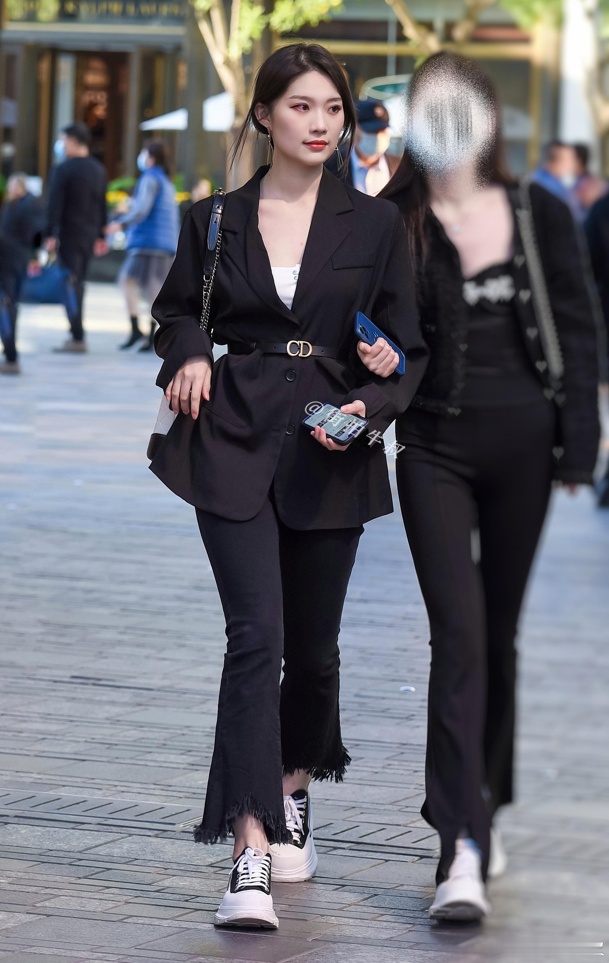 港风穿搭的黑色西装牛仔裤