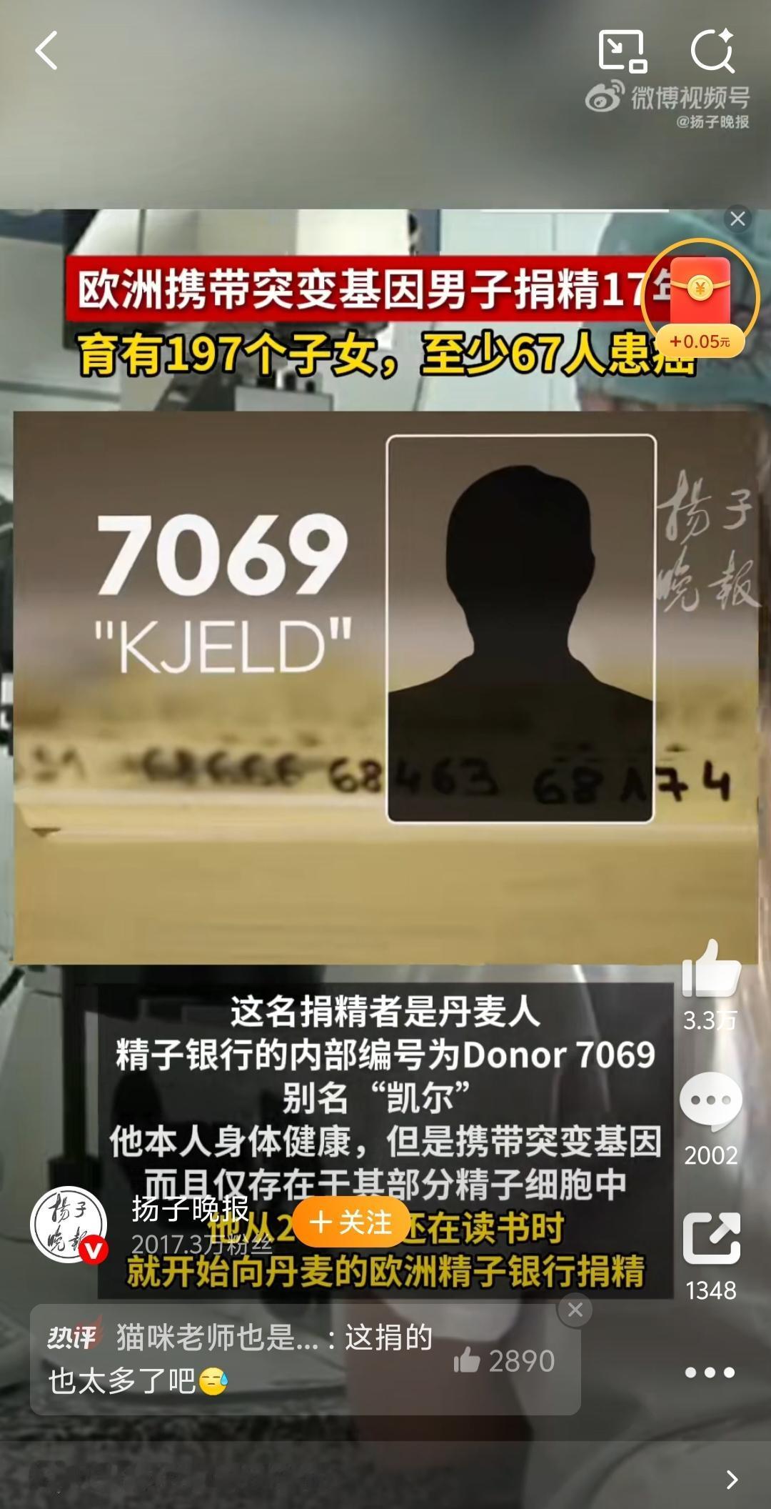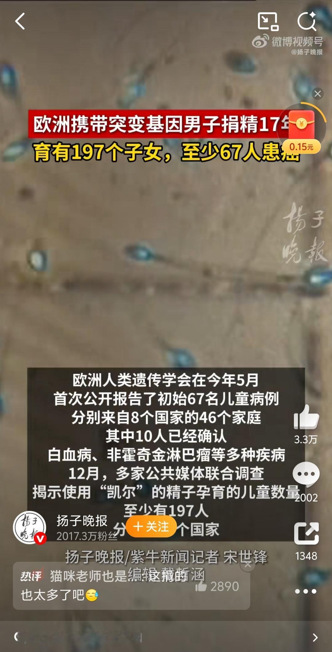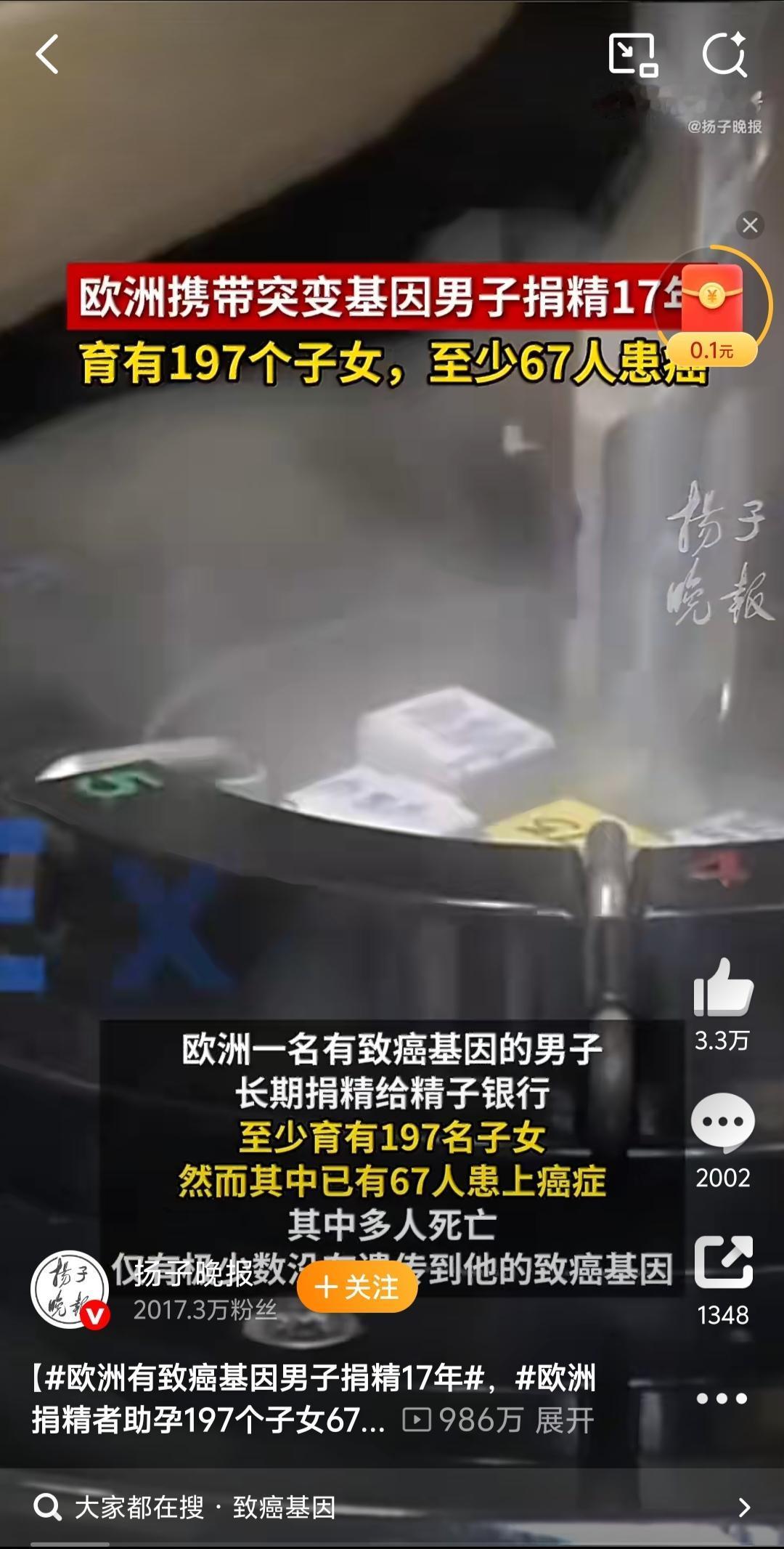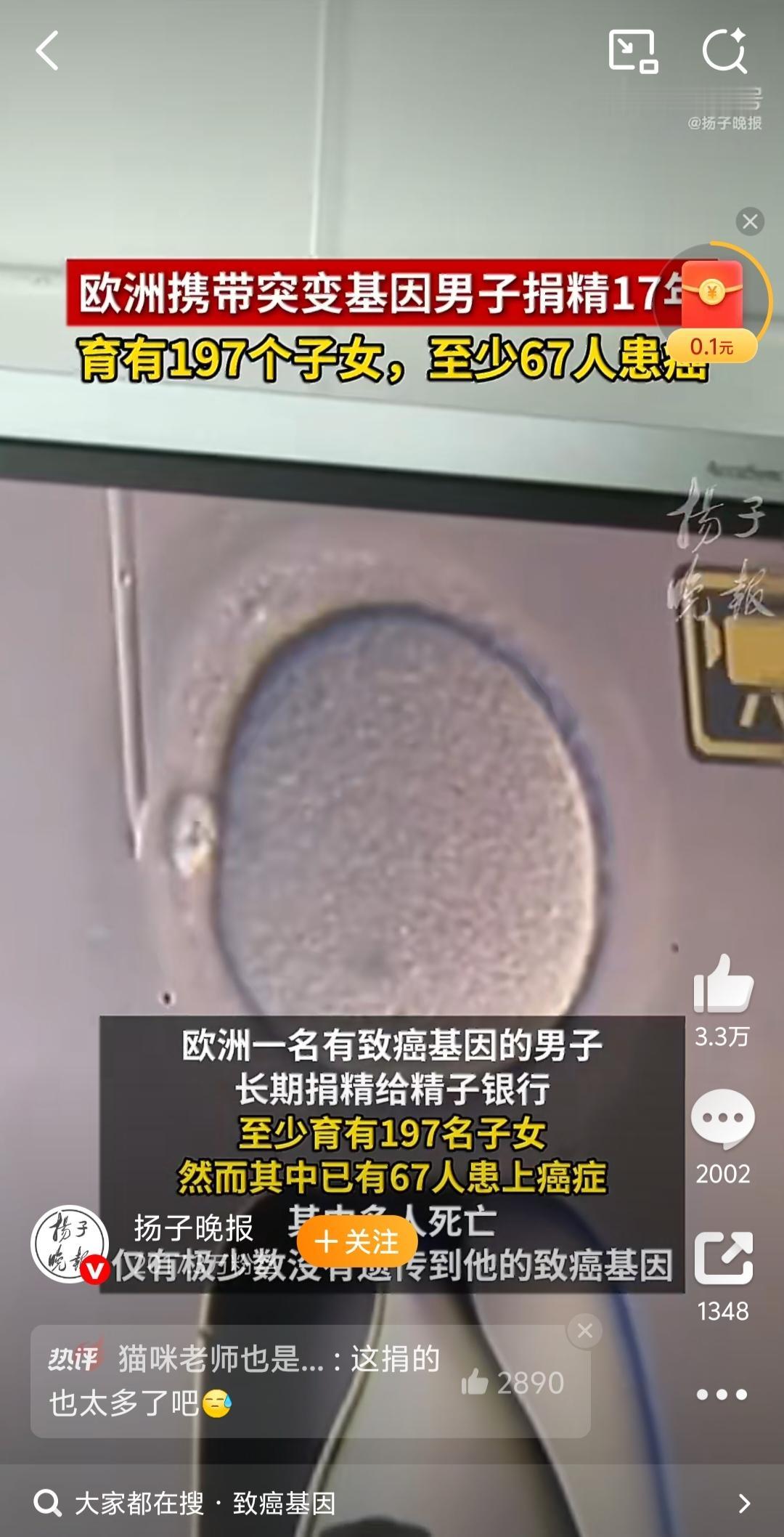 惊悚!欧洲男子携致癌基因捐精17年,近200个孩子90%患癌风险! 欧洲爆惊天捐精丑闻!丹麦男子凯尔(编号Donor 7069)17年间持续捐精,其精子销往14国67家诊所,孕育至少197名子女,却藏着致命隐患——20%精子携带TP53致癌基因突变 ! 他本人健康、通过所有常规筛查,可这种“性腺镶嵌”突变根本查不出。如今已有10名孩子确诊白血病、脑瘤等癌症,多人幼龄夭折,幸存者终身要面对90%的患癌概率,需年年做全身MRI筛查。 悲剧根源直指三重漏洞:技术筛查滞后、跨境监管真空(比利时限6家,他却助孕53名)、机构逐利滥用精子。辅助生殖本是希望,却因规则失守变成“生命豪赌”!科技再进步,也不能让生命安全为商业利益让步。你觉得该建立全球统一捐精监管标准吗? 捐精 遗传基因 欧洲新鲜事