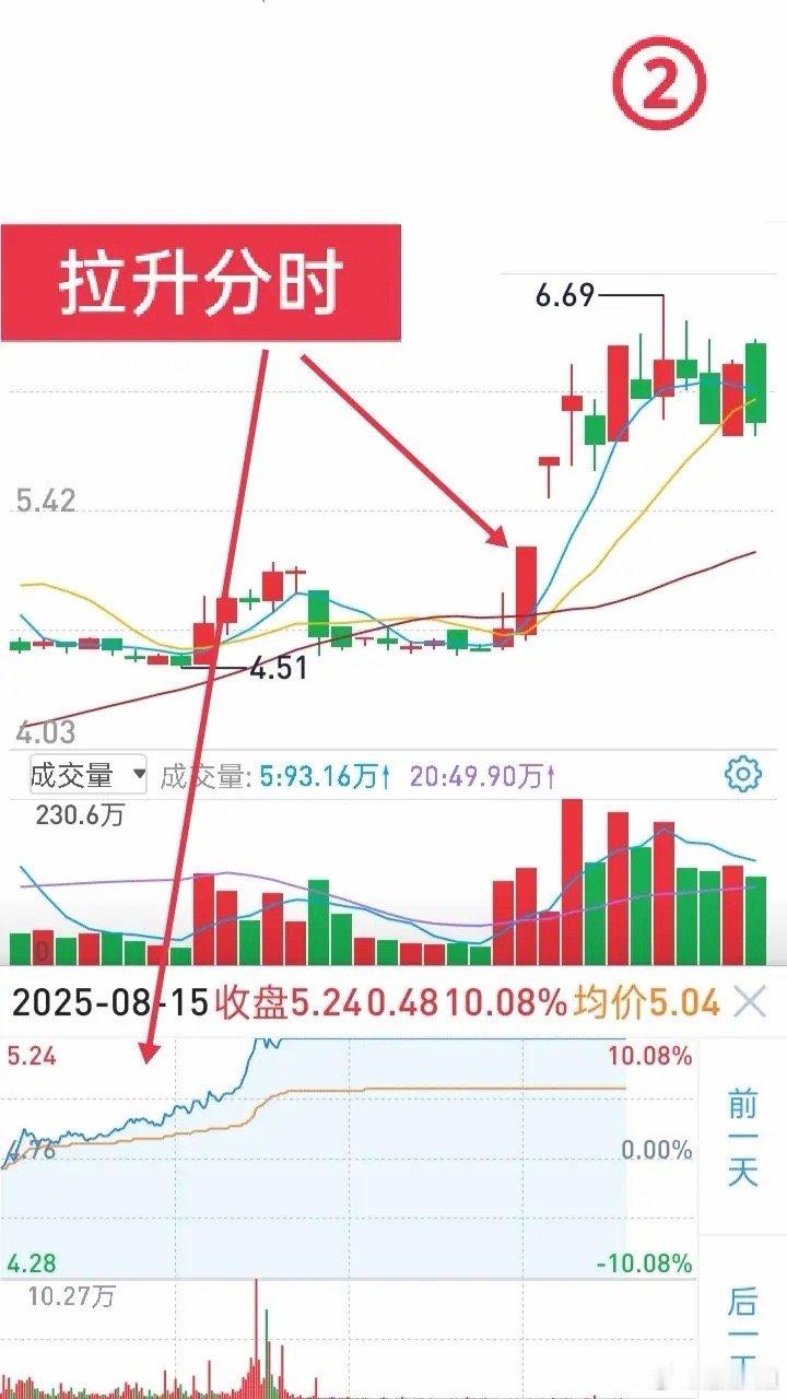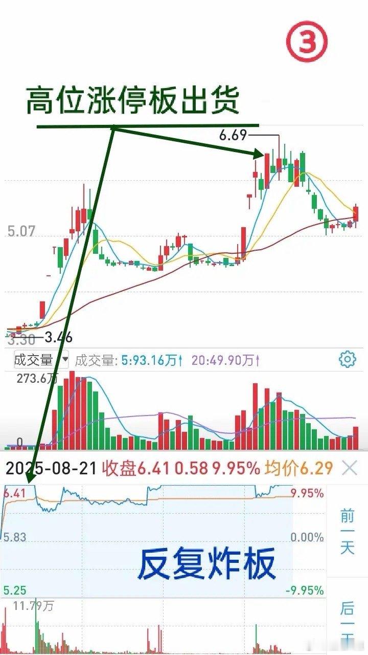 短线判势:别错把试盘、出货当拉升做短线最怕误判股价上涨性质:错把试盘当拉升易踏空,误将出货当拉升会深套。拿不准时别慌,先冷静分析,再动手不迟。每天复盘要重点看个股主升浪K线和当日分时图,反复揣摩总结。练到形成潜意识,追涨时才能快速选到确定性高的拉升股,避开试盘和出货陷阱。给你看个典型案例,直接上干货:• 图②(拉升):股价拉升吃掉前一根K线上影线,走势转强;分时图上股价在均价线上“一浪高过一浪”,成交量还逐渐放大,这是明确的拉升态势。• 图①(试盘):早盘急拉后回落,中午再拉却遇明显抛压,主力留上影线(仙人指路形态),是在测试上方压力。这种走势别急于进,即便后续涨停,主力也可能因试盘不如意或跟风多调整几日。• 图③(出货):高位横盘要警惕,三日不涨大概率出货;高位涨停反复炸板,是主力在涨停板出货,这类涨停碰都别碰。三浪上涨后,股价不涨但成交量大、换手高,或是出现乌云盖顶大阴线、天量长上影线,千万别抄底。