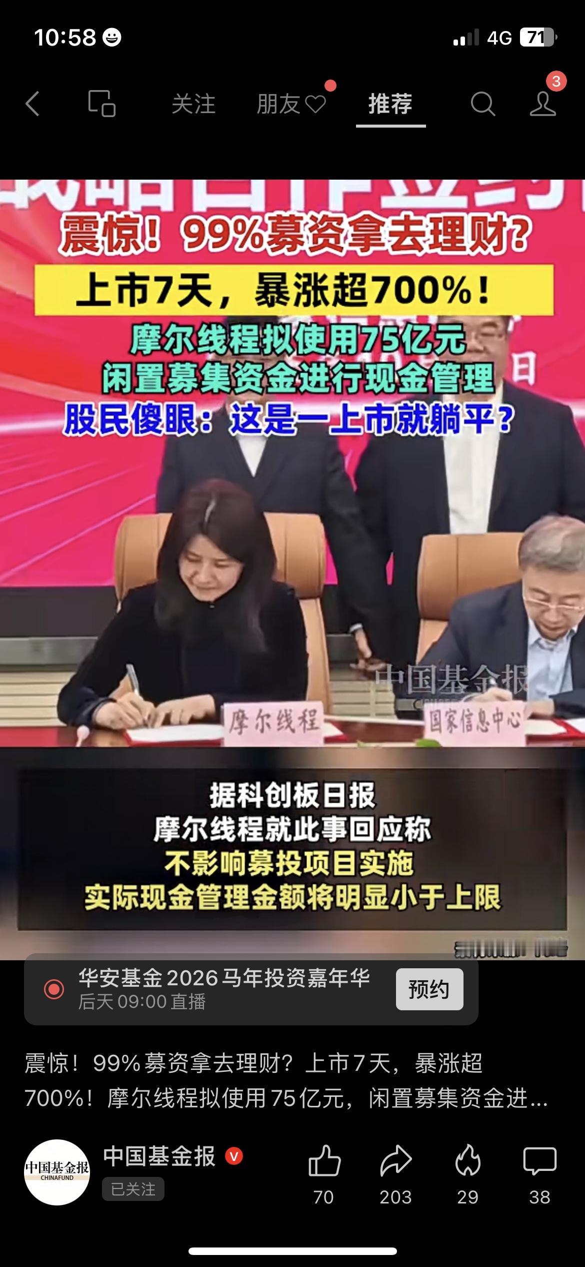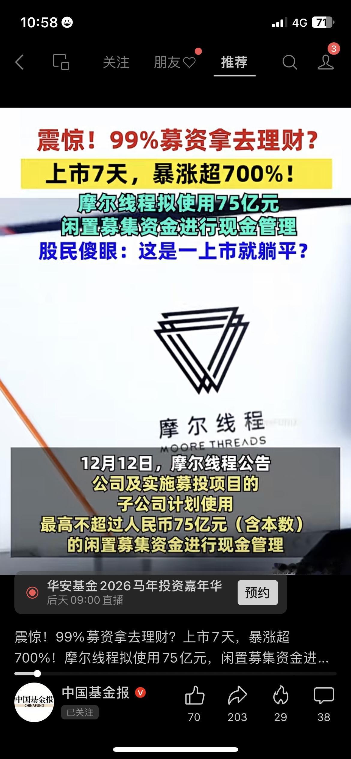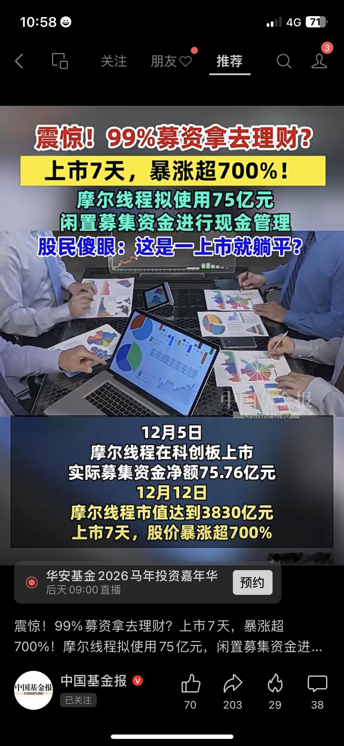别忽略!股民留心点,摩尔线程7天暴涨700% 关注科创板的股民赶紧看,摩尔线程这事有点意思! 上市7天股价涨超700%,还拟拿75亿募资理财。 公司回应说不影响募投项目,其实很简单, 咱股民看这类股票别只盯涨幅,要查募投项目进展, 在同花顺APP就能查公司公告,别踩坑。 你怎么看募资理财这操作?评论区唠唠~摩尔线程 摩尔资本