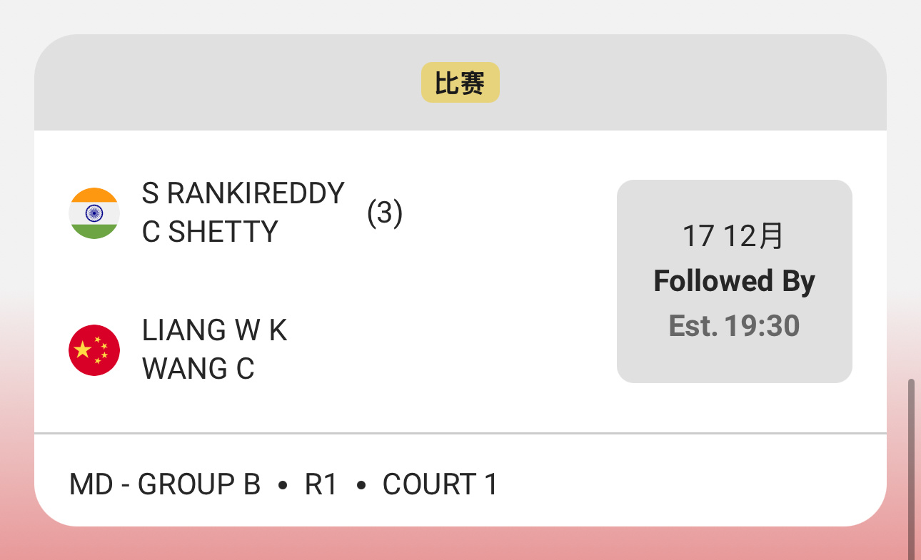 杭州总决赛男双GROUP B17号:王昶梁伟铿VS兰基雷迪谢提18号:王昶梁伟铿VS谢定峰苏伟译两天都是下午一号场地第四场!!!王昶梁伟铿冲了!!!!干就完了!!!