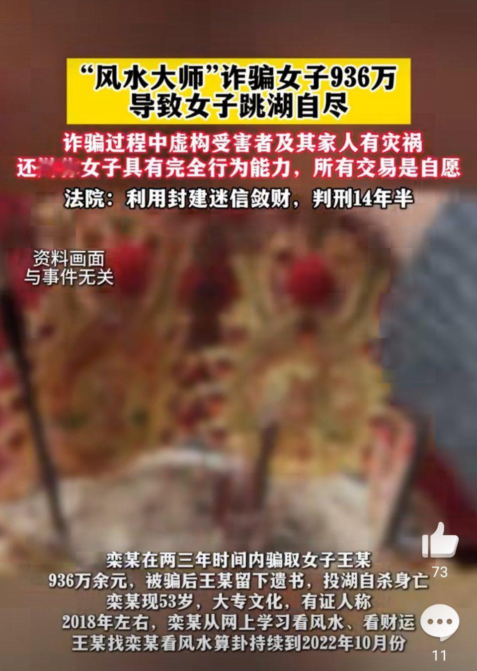 就因为想给老爷子迁坟图个吉利,山东淄博的王女士怎么也没想到,自己会被所谓的“风水大师”骗光近千万家产,最后被逼得投湖自杀。这件事听着让人揪心,背后藏着的骗局和人性的弱点,更值得每个人警醒。 王女士当初只是想找个风水师看看迁坟的事儿,却意外认识了栾某。这个53岁的女人,不过是从网上学了点看风水的皮毛,就敢装大师。她抓住王女士重视家庭的心理,凭空编出“血光之灾”的谎话,说只有花钱做法事才能辟邪聚财,不仅能保家人平安,还能让公司生意兴隆。王女士信以为真,三年里一次次给栾某转账,前前后后加起来竟有936万元。可这些钱根本没用来“消灾”,全被栾某拿去挥霍了,旅游、买奢侈品、买房,三年里她个人消费就高达581万。等王女士发现不对劲时,钱早就追不回来了,公司扛不住债务垮了,还连累了身边不少人,她自己也被查出心理状态重度异常。绝望之下,她留下遗书,说自己“认识了不该认识的人,听信了别人的蛊惑”,最终选择了投湖自尽。后来法院查明真相,认定栾某的诈骗行为和王女士的死亡有直接关系,判处她14年6个月有期徒刑,可再多的刑罚,也换不回一条鲜活的生命。 看完这个事儿,心里又气又疼。气的是骗子太黑心,明明是网上学的三脚猫功夫,却敢拿别人的家庭和性命当筹码,把别人的血汗钱当成自己挥霍的资本,法庭上还狡辩是“赠与”“借款”,毫无悔意。疼的是王女士太傻,怎么就会相信这种虚无缥缈的“血光之灾”?可反过来想,她的遭遇又不是个例。生活里谁没点软肋?重视家人健康、希望事业顺利,这些都是最朴素的愿望,可就是这些牵挂,成了骗子下手的突破口。他们专挑人们焦虑的时候趁虚而入,用恐吓加画饼的套路,一步步让受害者失去判断力,到最后倾家荡产都反应不过来。 其实这些骗局的套路一点都不高明,所谓的“大师”连自己啥时候会被抓都算不准,怎么可能帮别人消灾?真正可怕的不是骗子的手段,而是我们心里的侥幸和迷信。总想着走捷径、靠外力改变命运,却忘了最靠谱的从来都是自己的判断和努力。生活里哪有那么多“血光之灾”,更多的是趁虚而入的骗局;哪有什么能逆天改命的大师,只有想不劳而获的骗子。王女士的悲剧提醒我们,遇事别慌,别轻易相信陌生人的花言巧语,涉及大额钱财一定要和家人商量,实在拿不准就找警察咨询,总比被骗子牵着鼻子走好。 14年的牢狱之灾,算是给骗子的惩罚,可王女士的生命再也回不来了。不知道大家身边有没有遇到过类似的封建迷信骗局?如果你是王女士,遇到这种情况会怎么应对?欢迎在评论区说说你的看法和经历。 来源:封面新闻