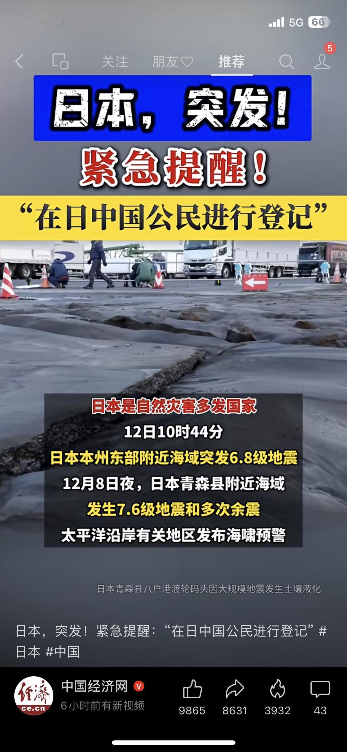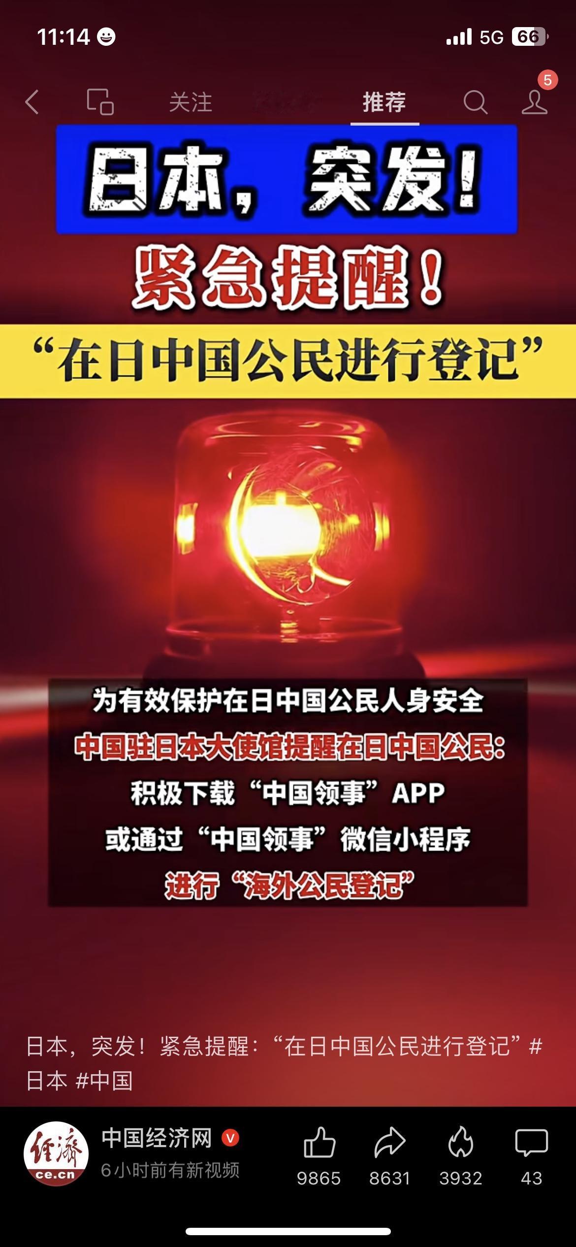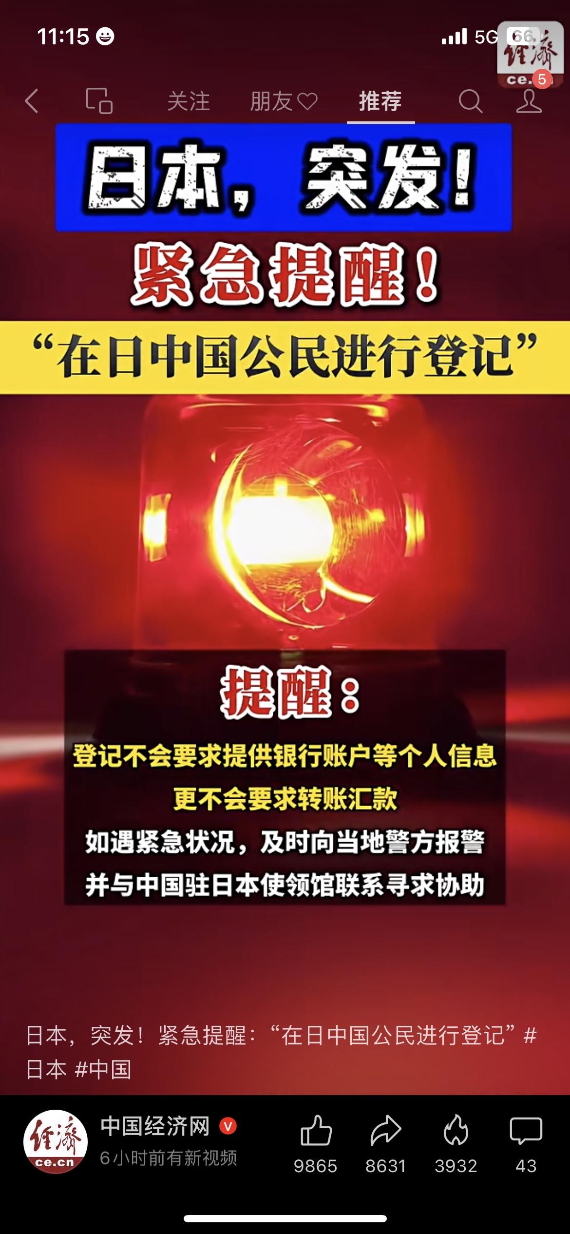 留心点!在日中国公民,紧急登记提醒别忽略 家里有亲友在日本的朋友赶紧看,权威渠道明确说要登记! 日本近期接连发生6.8级、7.6级地震, 驻日使馆提醒在日同胞做海外公民登记。 登记用“中国领事”APP或小程序就行,一点不麻烦, 而且官方不会要银行卡、不会让转账,别踩坑! 我有朋友在东京,刚用APP登完,就填了基础信息,两分钟搞定。 你身边有在日的亲友吗?评论区唠唠~