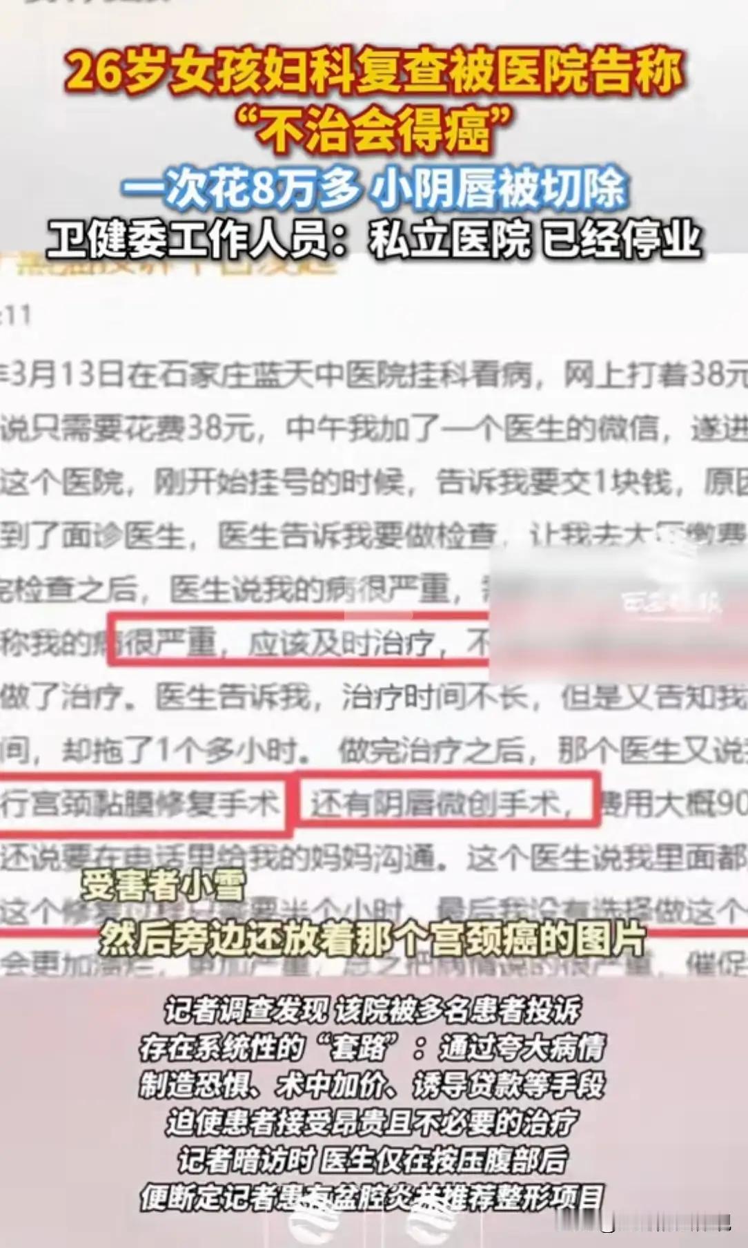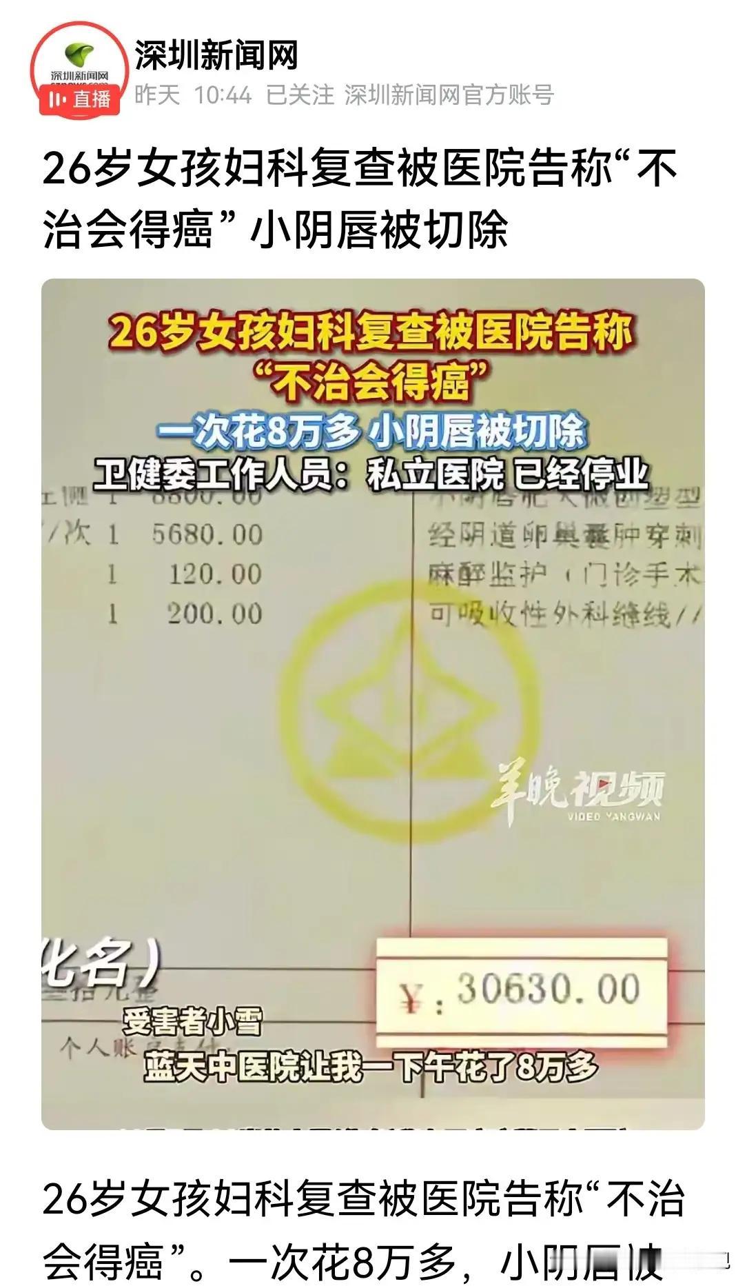 在河北石家庄,有一个26岁的女子,她的故事令人心痛,也令人深思。她本是一个普通的年轻人,怀揣对未来的憧憬,却在一次妇科复检中,人生突然被阴影笼罩。 那天,她走进某中医院,满怀期待地接受检查,却没想到迎来的是一场噩梦。医生的话如同晴天霹雳:“你患有多种妇科疾病,不及时治疗可能会变成癌症。”她的心一震,惶恐不安。为了“救命”,她支付了9000元,却被医生诱导做了小Y唇切除术。手术后,她的身体和心灵都承受着巨大折磨,疼痛难忍,整夜难以入眠。 然而,事情远没有结束。术后,她为了“康复”,不得不网贷5万,借了朋友2.5万,总共花费了8万元。那一段日子,像是走在刀尖上,钱财的压力让她喘不过气。更令人心碎的是,事后她前往三甲医院复检,结果推翻了之前的诊断。医生告诉她,她的疾病根本不存在,所谓的“妇科病”只是过度医疗的产物。 这不仅仅是一个个体的悲剧,更折射出某些医疗机构为了利益,忽视患者的生命健康,玩弄“以药养医”的把戏。民间有句古话:“医者父母心”,可如今,却有一些医生变成了“金钱的奴隶”。这些“坑害百姓”的行为,让无数家庭支离破碎,也让人们对医疗行业心存疑虑。 人生如修行,健康是最宝贵的财富。我们应怀有感恩之心,珍惜每一份健康,远离“以医谋私”的陷阱。面对疾病,要理性求医,切勿盲从,更不能被“忽悠”所迷惑。每个人都应成为自己健康的守护者,学会辨别真伪,懂得“未雨绸缪”。 这位女子的经历提醒我们:生命无价,勿让贪婪蒙蔽了双眼。只有守住初心,心怀感恩,才能在人生的修行路上越走越远。让我们共同呼吁:关注健康,拒绝过度医疗,让每个人都能拥有一个健康、幸福的人生。因为,人生只有一次,健康才是最真挚的财富。