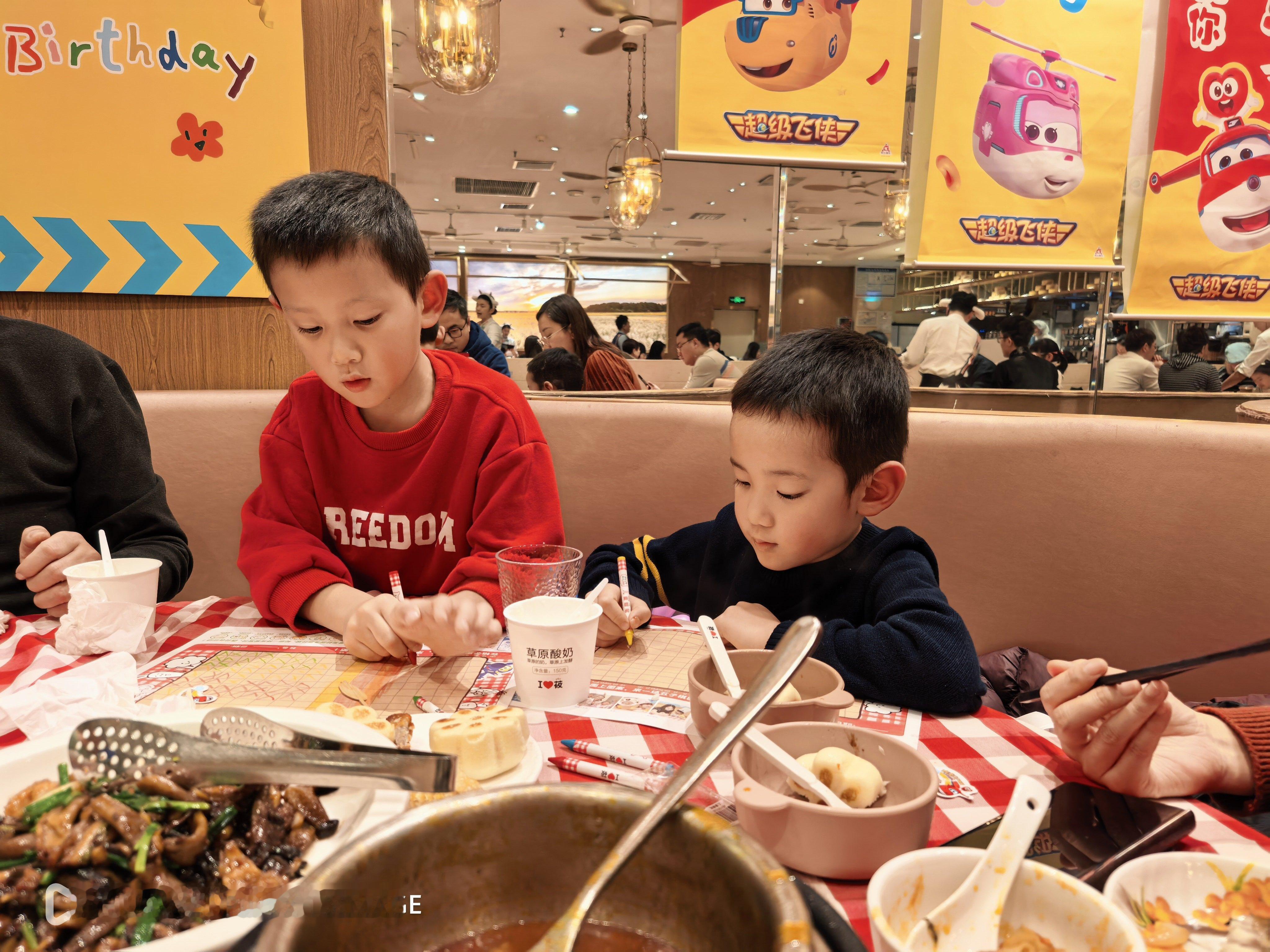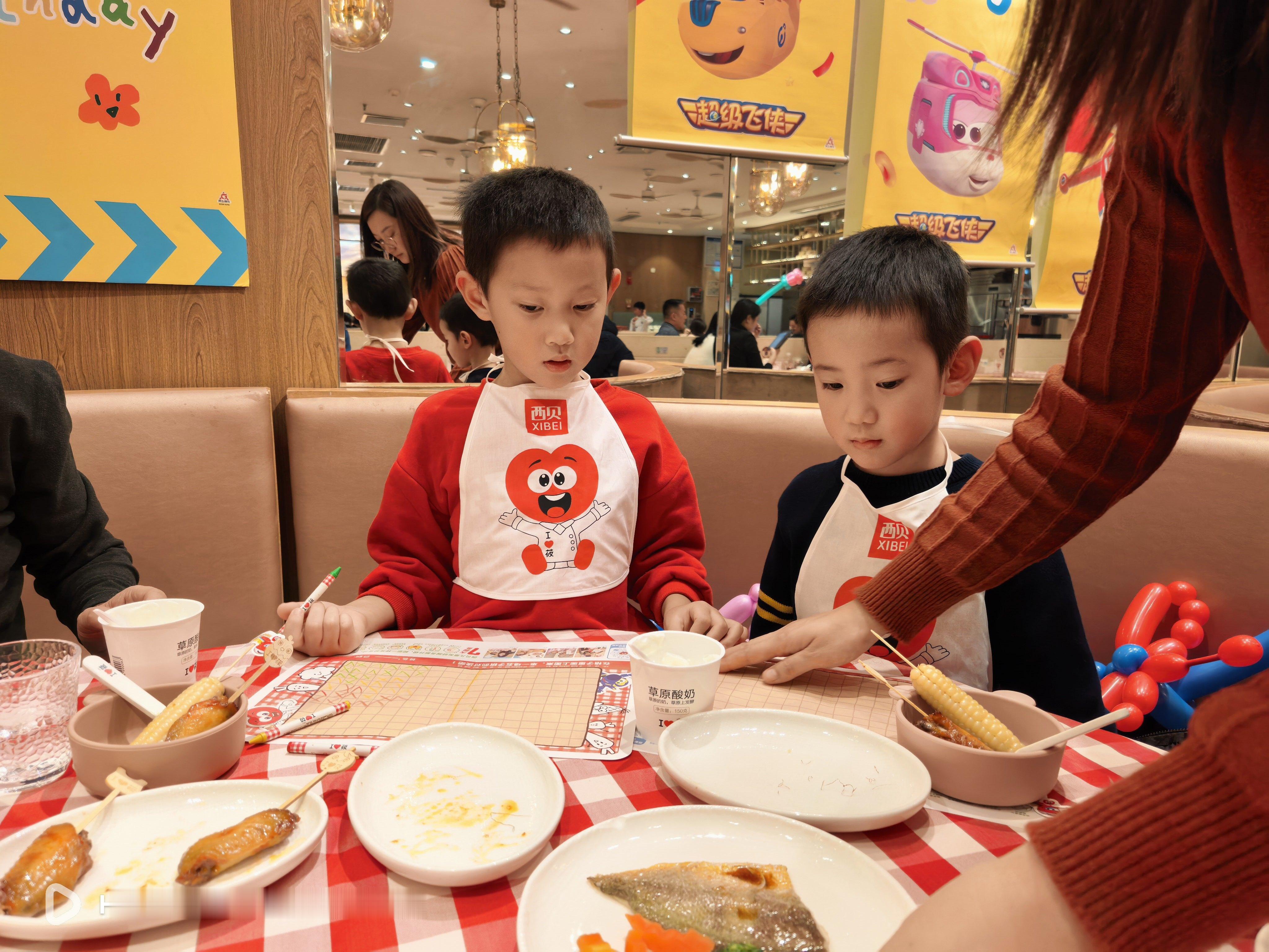 又来西贝了……5点半落座,整个餐厅就已经坐满了,生意好点了两个儿童套餐,感觉娃们挺爱吃,最重要的是送了两套彩笔,吃完两个娃就在那乱画以往这个时候,为了让大人安静吃个饭,我一般是要拿手机给他们看动画片的,在西贝省事很多了4大2小,一共花了383 ,个人觉得这个价格确实不贵……对了,刚才吃完饭,又送了两套画笔玩具和小零食西贝