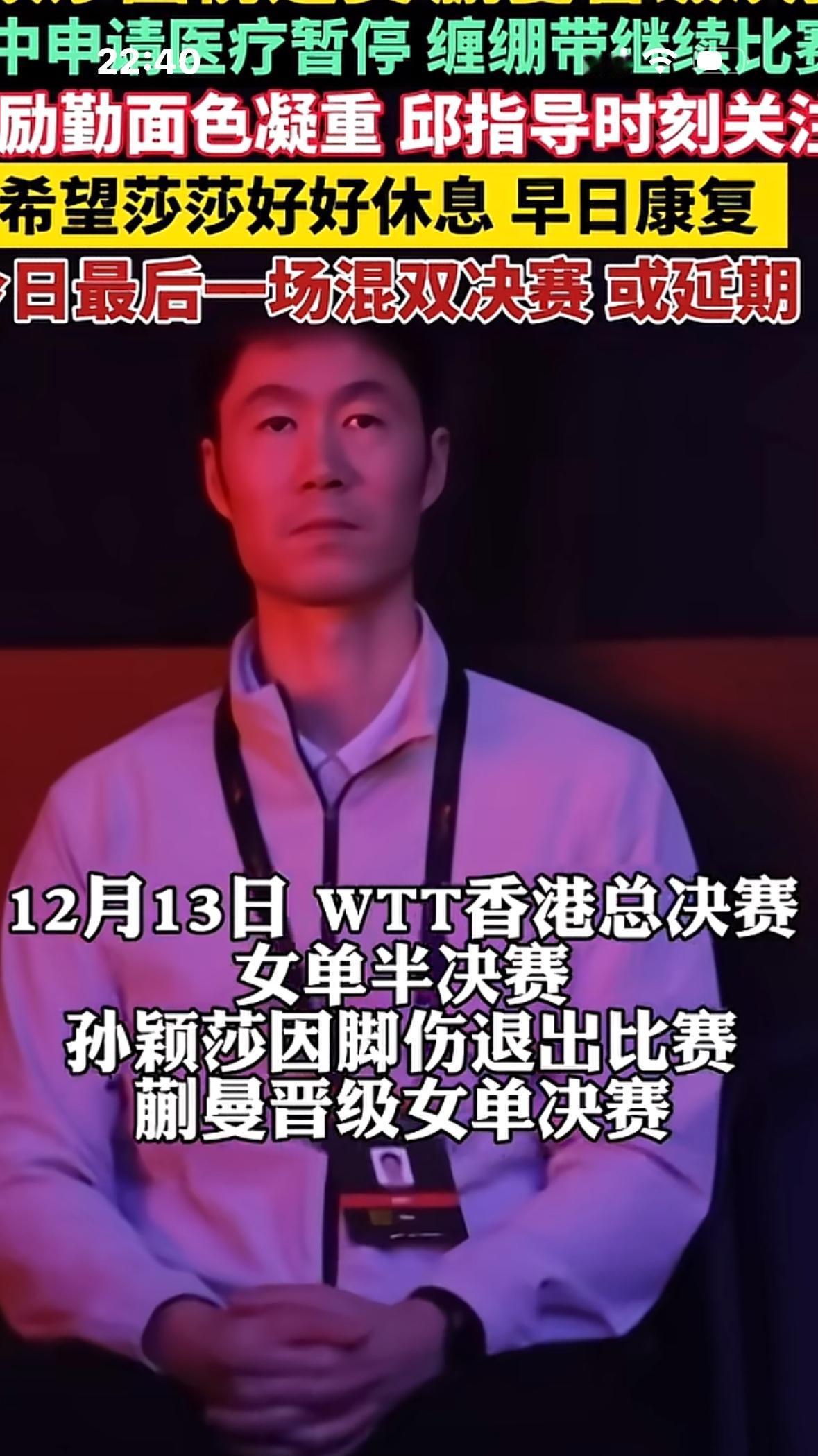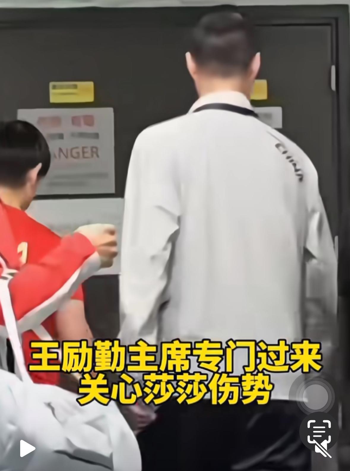 王励勤主席关系孙颖莎的伤势——德华亲自护送莎莎回酒店 孙颖莎脚部受伤牵动亿万球迷的心, 王励勤在看台上看到莎莎受伤 后,马上过来关心莎莎的伤情, 邱贻可指导也回来了, 孙颖莎真的是大格局, 弃单保混双, 莎莎真的很伟大, 永远都是胸前的国旗大于一切, 她的责任与担当, 在现役球员中,首屈一指, 德华护送莎莎, 就知道国乒队都在珍惜莎莎, 爱护莎莎, 这样球迷才放心! 祝孙颖莎早日康复! 早日回到赛场上!