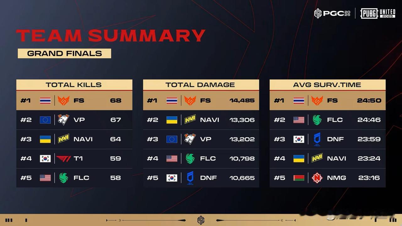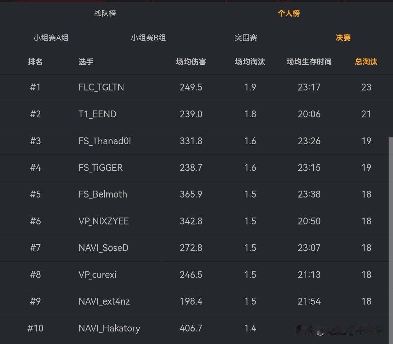 基本上三争一! 明晚FS、NAVI、FLC争夺PGC全球总决赛冠军 PGC全球总决赛决赛阶段第二天比赛结束! FS第一、NAVI第二、FLC第三、VP第四 离谱哥23个淘汰领衔战神榜 PCL独苗17战队发挥不佳,53分排名第十一位 从两天的分数来看,明晚大概率就是FS、NAVI、FLC三个队伍争夺总冠军了,第四名的VP有30分分差不太好追 FS作为东道主没有参加小组赛直接晋级总决赛的队伍,这两天的表现确实可以,圈往脸上套的同时人家也把握住了 NAVI下班局16杀吃鸡强行缩小了与FS的差距,上一次2022首次拿到了PGC冠军,这一次他们要再度向PGC冠军发起冲击 FLC与TWIS作为美、欧赛区的代表,在PGC的表现大相径庭,目前FLC处于冠军争夺战行列,而赢了一整年、硬了一整年的TWIS在本届PGC再次发挥失常,PGC冠军今年没戏了!