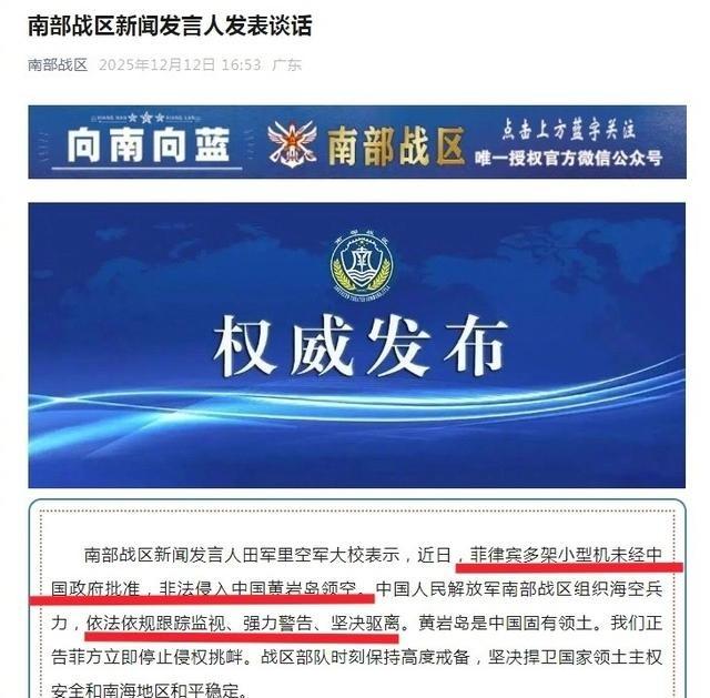黄岩岛出大事了?解放军驱离菲方飞机,菲律宾罕见沉默12日 南部战区12日公布消息,说近日菲律宾几架小型飞机没经批准就飞进黄岩岛领空,部队派出海空力量,按照规矩跟踪监视,还发出强力警告,把它们坚决赶走。发言人田军里大校强调,黄岩岛就是中国领土,菲方得马上停下这些侵权举动,部队随时戒备,守好主权和南海稳定。 这事一出,大家注意到的点是菲律宾那边安静得很。平时稍微有点摩擦,菲政府和媒体就赶紧发声,放照片视频抱怨,这次到12日都没动静。外交部、海警局那边也没回应,菲律宾大使馆和官方渠道也没表态。路透社等外媒问了,都说没收到评论。 黄岩岛这地方,中菲都有主张,但中国实际管着,渔业资源丰富。菲律宾飞机这种小规模闯入,以前也发生过,但这次用“强力警告、坚决驱离”这种词,力度明显大。部队行动专业合法,没给对方留余地。 菲律宾为什么不吭声,可能有几方面原因。一来,这次被赶走挺干脆,没拍到什么能炒作的画面。二来,最近南海事多,菲律宾在其他地方也吃过亏,不想再多开战线。三来,美国那边虽然撑腰,但具体到这种空中事件,美军也没直接掺和,菲律宾自己底气不足。 这事说明,中国在黄岩岛管控越来越稳。去年就公布领海基线,今年巡逻常态化,海警和部队配合默契。菲律宾再搞小动作,基本没效果。南海和平靠大家守规矩,菲律宾老挑事,只会让自己难堪。 部队继续保持警惕,黄岩岛主权没得商量。希望菲律宾早点明白,闹腾没用,坐下谈才靠谱。南海稳定,对大家都有好处。