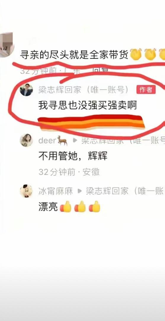 梁志辉说他不可能带货,他有实体生意,而且他对带货也不懂,流量交给他爸妈就可以了。没想到他还是经不住诱惑,从最开始的一个品,现在已经更新到11个品了。开通橱窗1天时间,卖出去900多单,这数据是一般带货主播苦口婆心介绍一天产品可能都卖不出去900多单。 梁志辉果然是做生意的,怼人是一怼一个准。当人有人吐槽,寻亲的尽头都是带货,梁志辉:我寻思也没强卖强买呀。 梁志辉回家后已把在老家全职带娃的妹妹、姐姐,都重新带回了职场。妹妹、姐姐后期应该会跟着爸爸妈妈带货,这样也能把她们各自的账号做起来。毕竟这波流量不会一直存在,总有一天会归于平淡,梁爸梁妈把这波流量已经变现的差不多了。