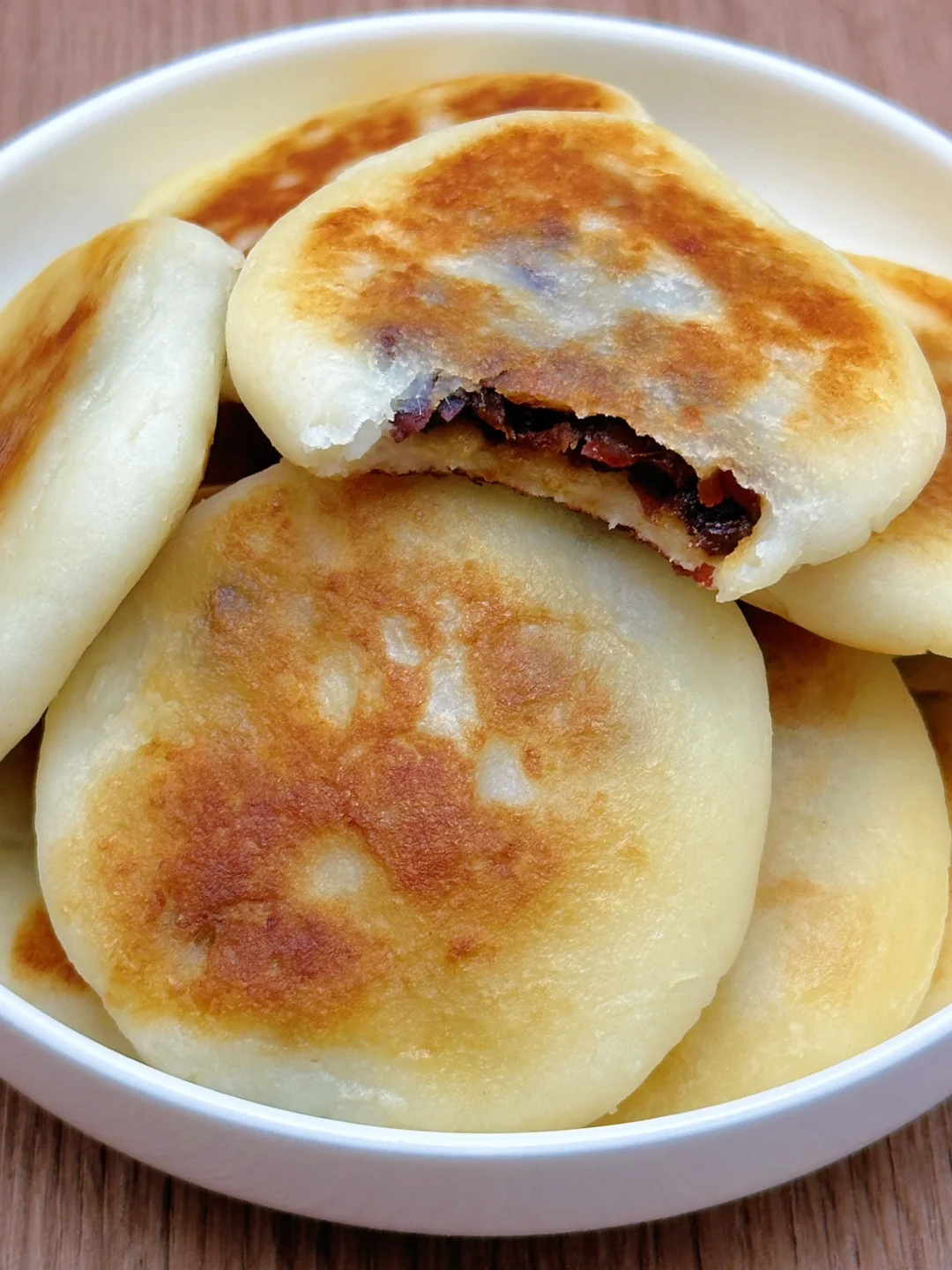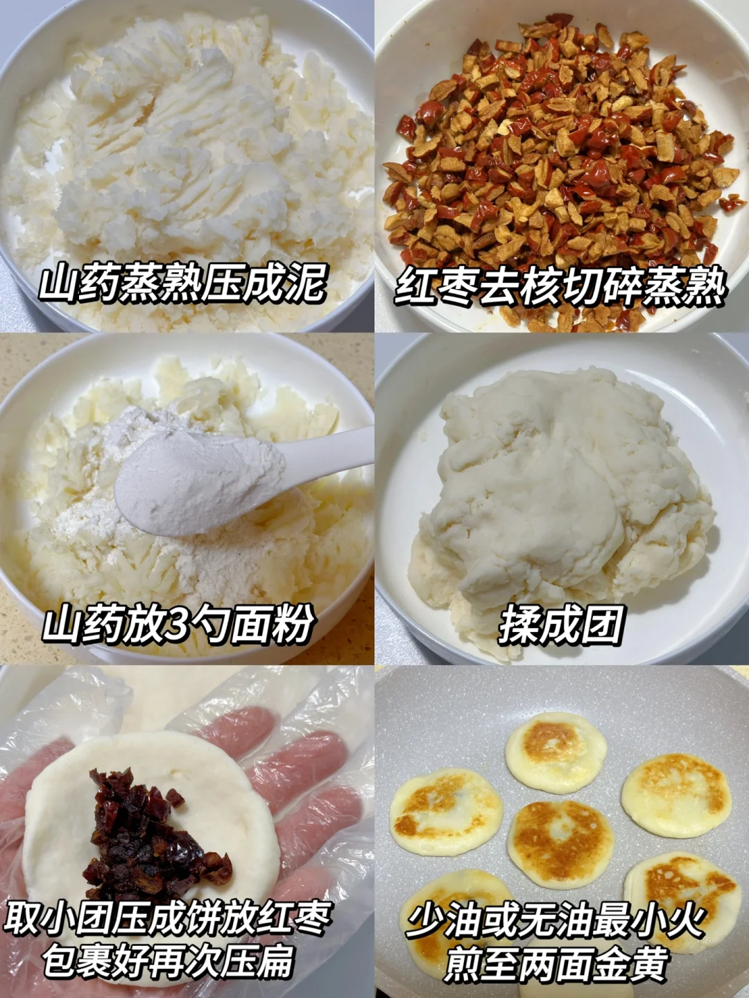 无糖的山药红枣饼,是多少女孩子的最爱呀,,山药可以健脾养胃搭配甜甜的红枣口感绝了,口感层次丰富,中和了红枣甜味,一口下去,爱了爱了,减脂的姐妹也可以放心吃哟,这大盘才400多大卡,一个才30多卡哟,姐妹们赶紧安排吧~ 🥗食材:山药、红枣、面粉 🥘做法:如图所示~ 1⃣️山药去皮蒸熟(大概20分钟)压成泥 2⃣️红枣去核切碎蒸熟 3⃣️山药加3勺面粉揉成团,取1小块揉圆,压扁,包入红枣泥,四周封起来,压扁 4⃣️平底锅少许油(或无油)两面煎至焦黄色(看个人喜欢,我比较喜欢焦一点[偷笑R])