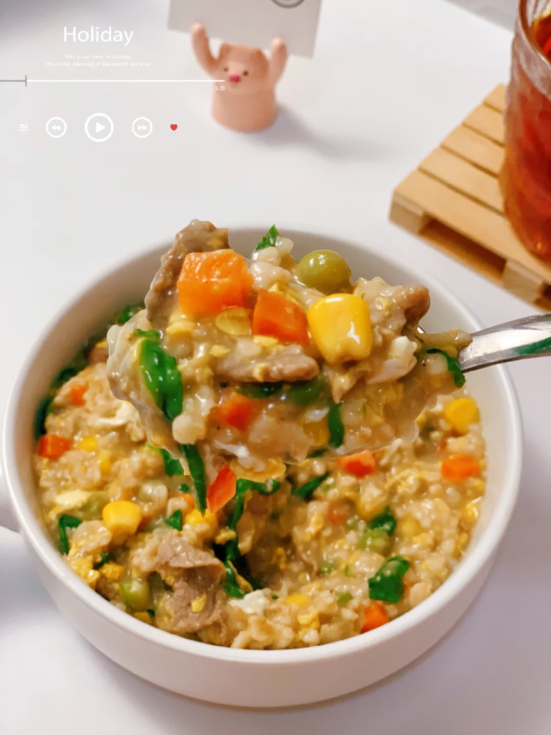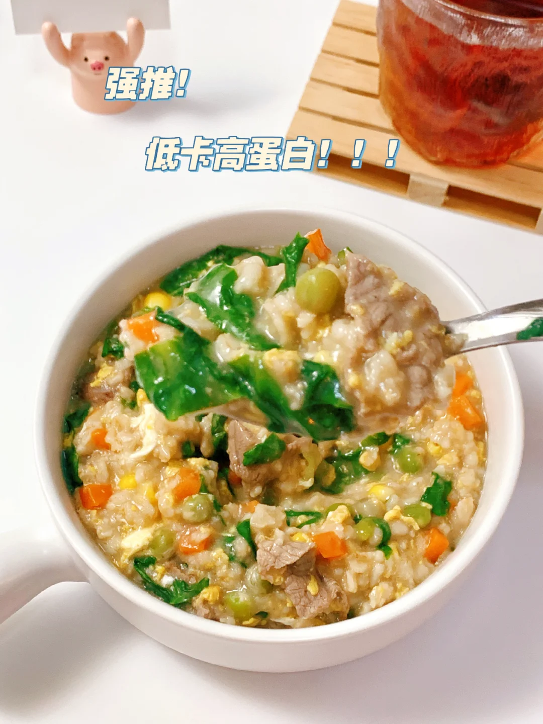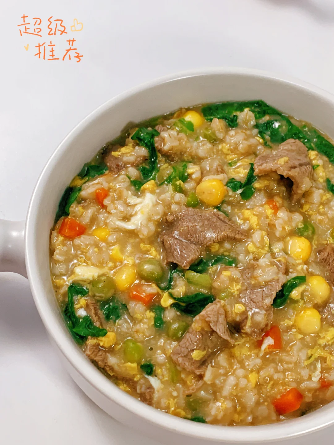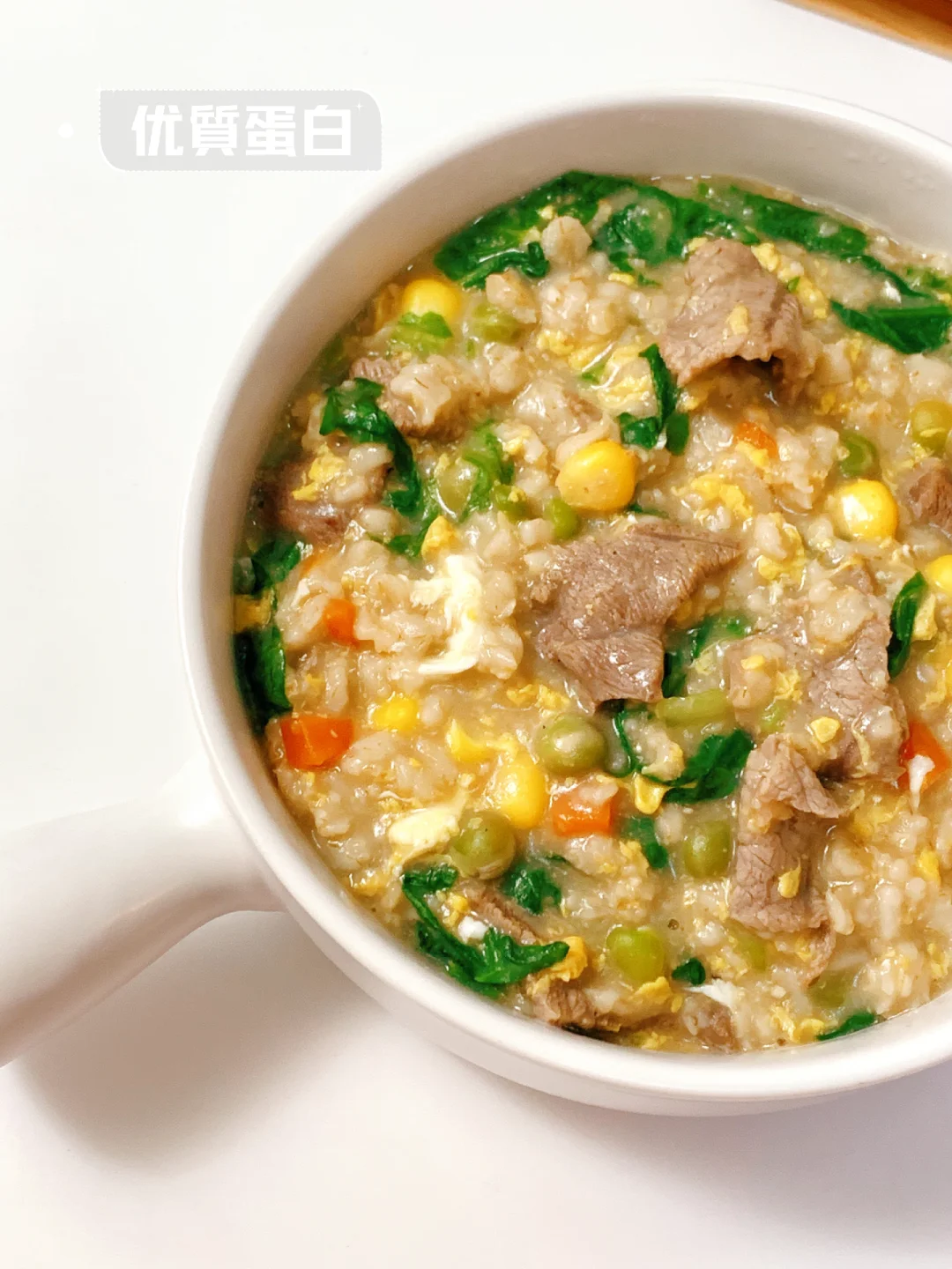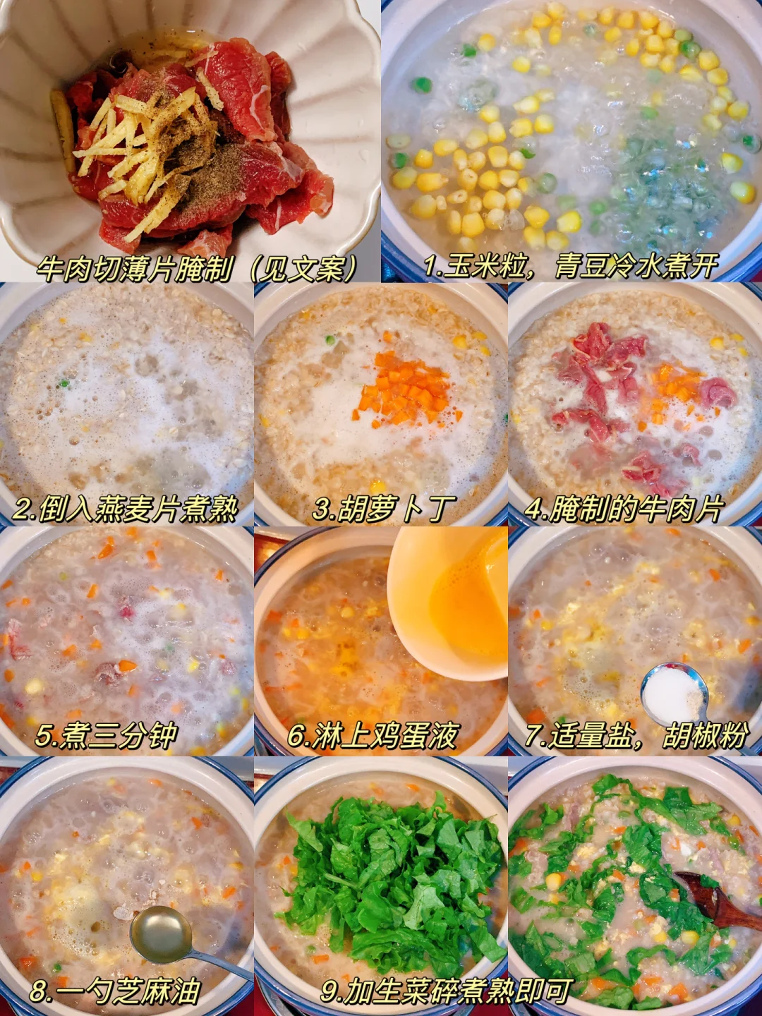 [害羞R]多少次早起就为了这一口,清新软糯,好吃又暖胃!低卡高蛋白,饱腹感超强,做法简单,好吃无负担❗阳康后要多补充碳水,蛋白质❗ 今日分享~~ 【牛肉鸡蛋燕麦粥】 食材: 主料:燕麦片,牛肉,生菜,胡萝卜🥕,玉米粒,青豆,鸡蛋 辅料:生姜,胡椒粉,芝麻油,料酒 [打卡R]做法见图片[打卡R] ✅牛肉切薄片腌制:姜丝,一勺料酒,黑胡椒粉,半勺淀粉腌制十五分钟。 ❤小提示: 还可添加其他喜欢的蔬菜。。。 ✨✨做好吃简单的减脂餐,分享我的低卡食记。 [私信R][私信R][私信R]喜欢请关注‼️