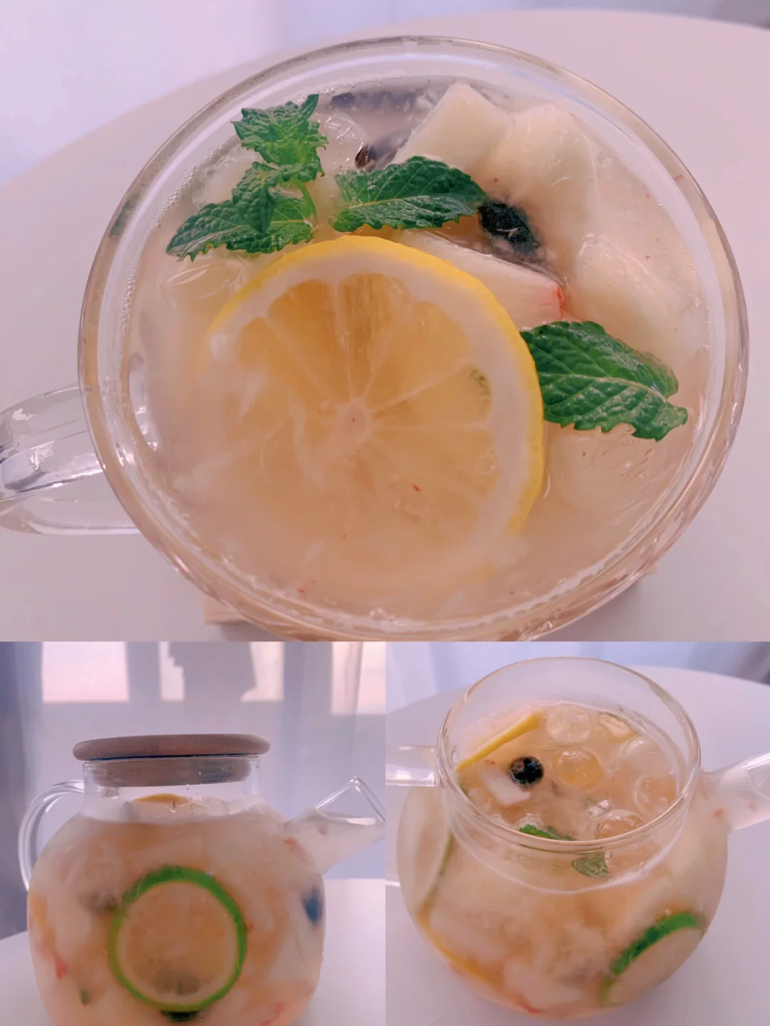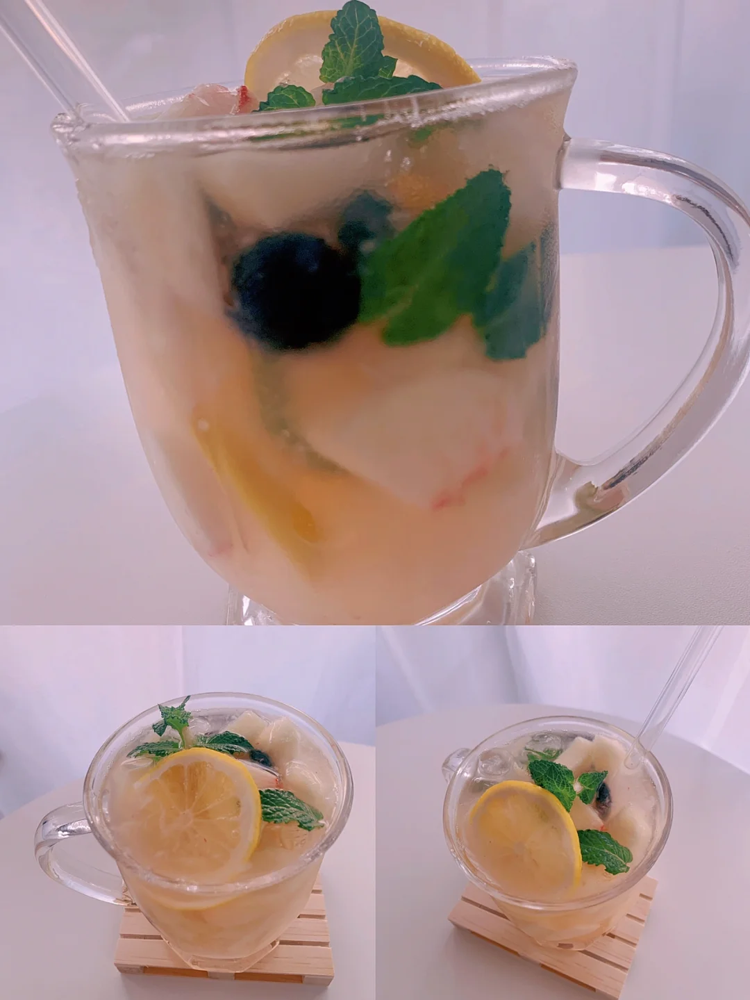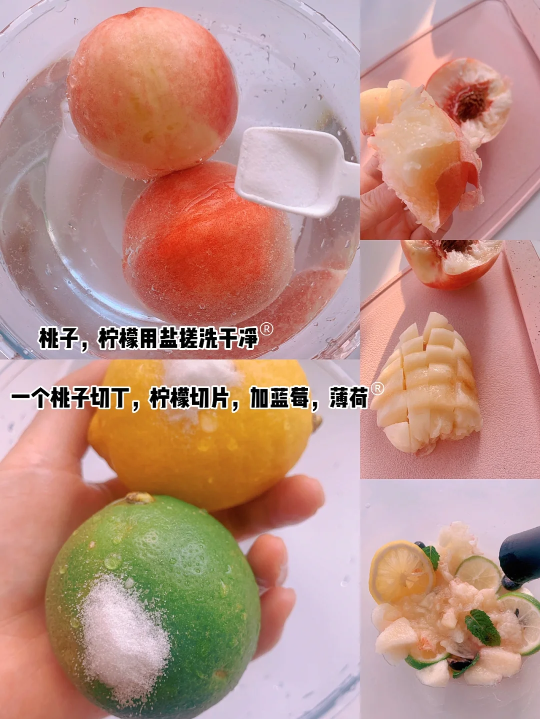 又到了吃桃子🍑的季节,怎少得了桃子饮品呢[偷笑R][偷笑R][偷笑R] 马上安排起来❗😘又是快乐的一天呢❗ ✨水蜜桃🍑➕柠檬🍋➕蓝莓🫐➕薄荷➕雪碧(减脂期的可换成无糖雪碧) 1️⃣桃子🍑,柠檬🍋用盐搓洗干净,一个桃子去皮切丁,柠檬🍋切片去籽,加蓝莓🫐薄荷叶捣碎。 2️⃣另一个桃子🍑切丁到入捣碎的桃汁中,加冰块,雪碧即🉑。 ⭐放入冰箱冷藏口感更加,谁能拒绝得了这样粉粉嫩嫩酸酸甜甜的饮品呢❗❗❗