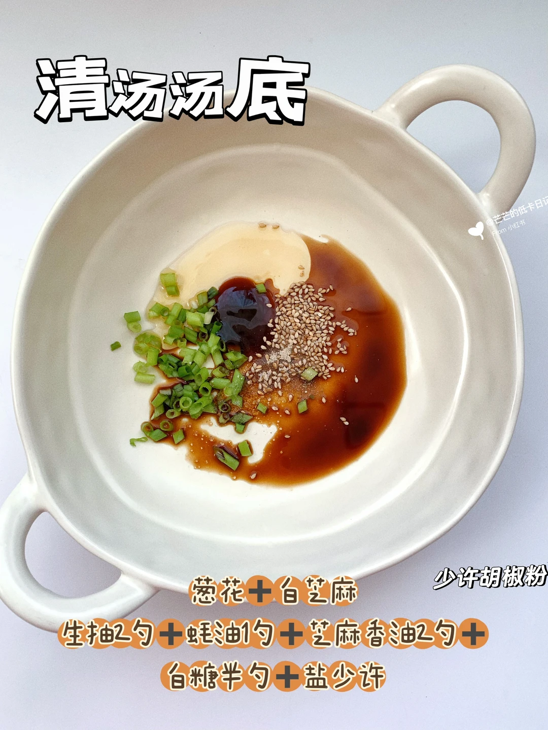 配料:白芝麻,葱花,生抽,蚝油,芝麻油,白糖,盐🧂,少许胡椒粉