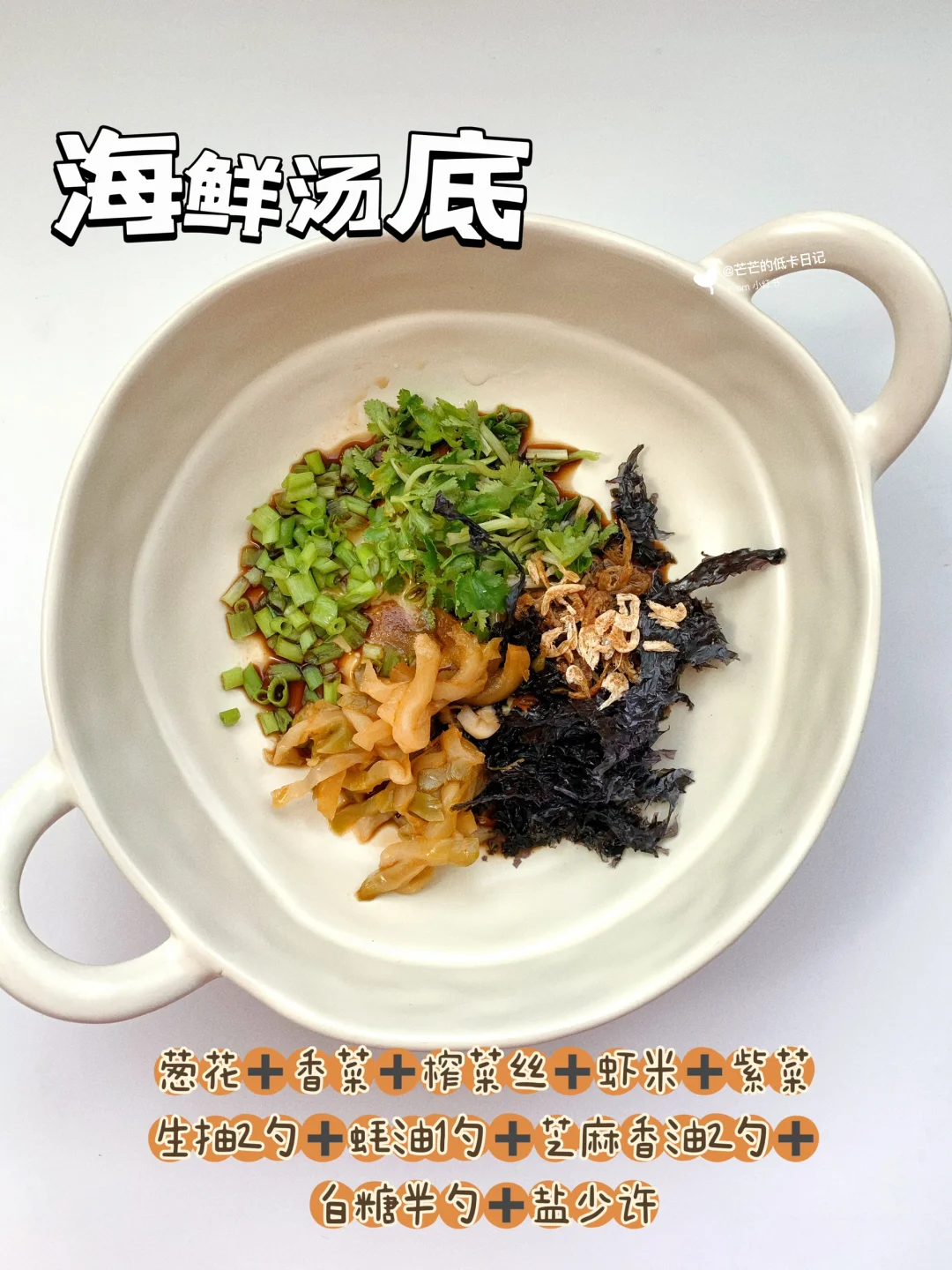 配料:葱花,香菜,榨菜,紫菜,虾米,生抽,蚝油,芝麻香油,白糖,盐🧂