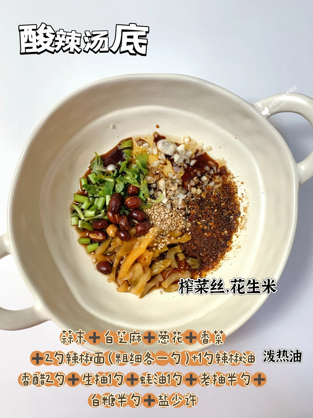 配料:蒜末,葱花,香菜,榨菜,辣椒面(粗细都要),白芝麻,辣椒油,香醋,蚝油,老抽,白糖,盐🧂
