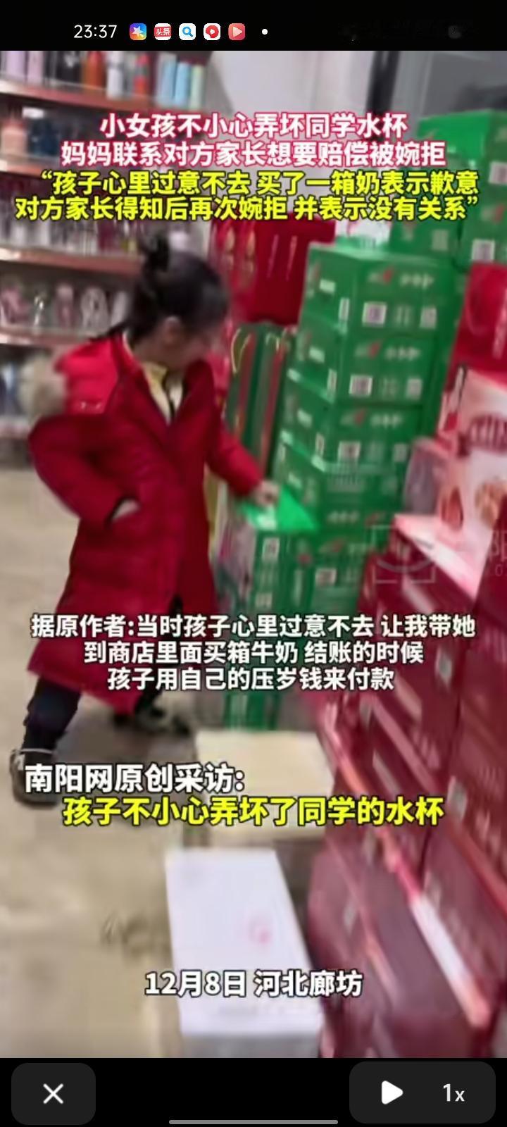 12月8日,廊坊霸州市。孩子妈妈发视频表示,女儿不小心弄坏同学的水杯,联系对方家长想赔偿被婉拒。当时孩子心里过意不去,带她到商店买箱牛奶,结账时孩子用自己的压岁钱付款,后面接到对方家长联系,谢绝了女儿买的牛奶,并表示可以交给老师,分给全班同学一起喝。