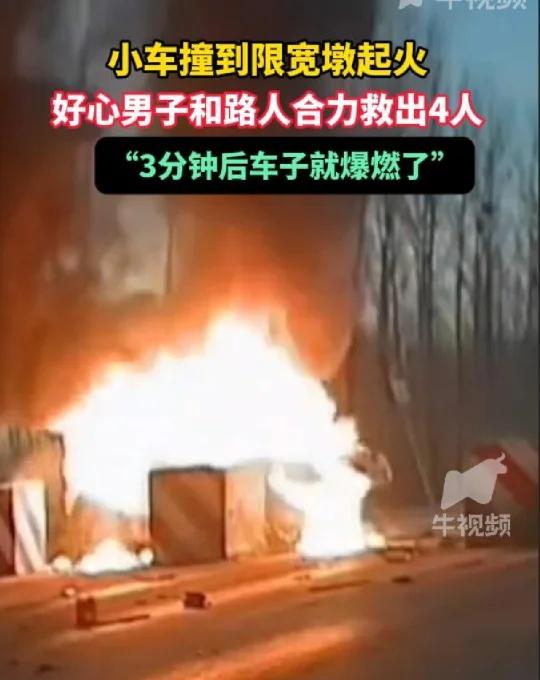 小车起火好心男子和路人合力救出4人 小车撞到限宽墩起火,好心男子和路人合力救出4人“3分钟后车子就爆燃了”