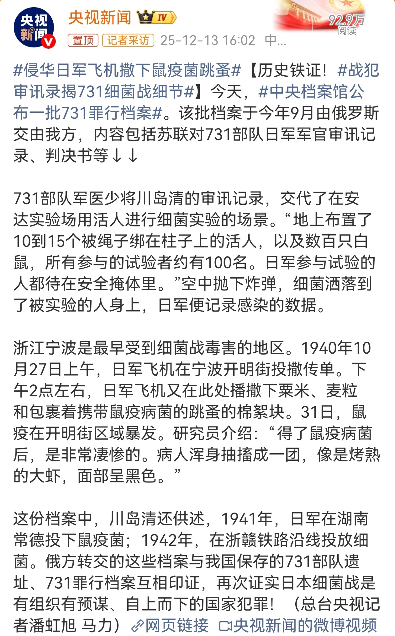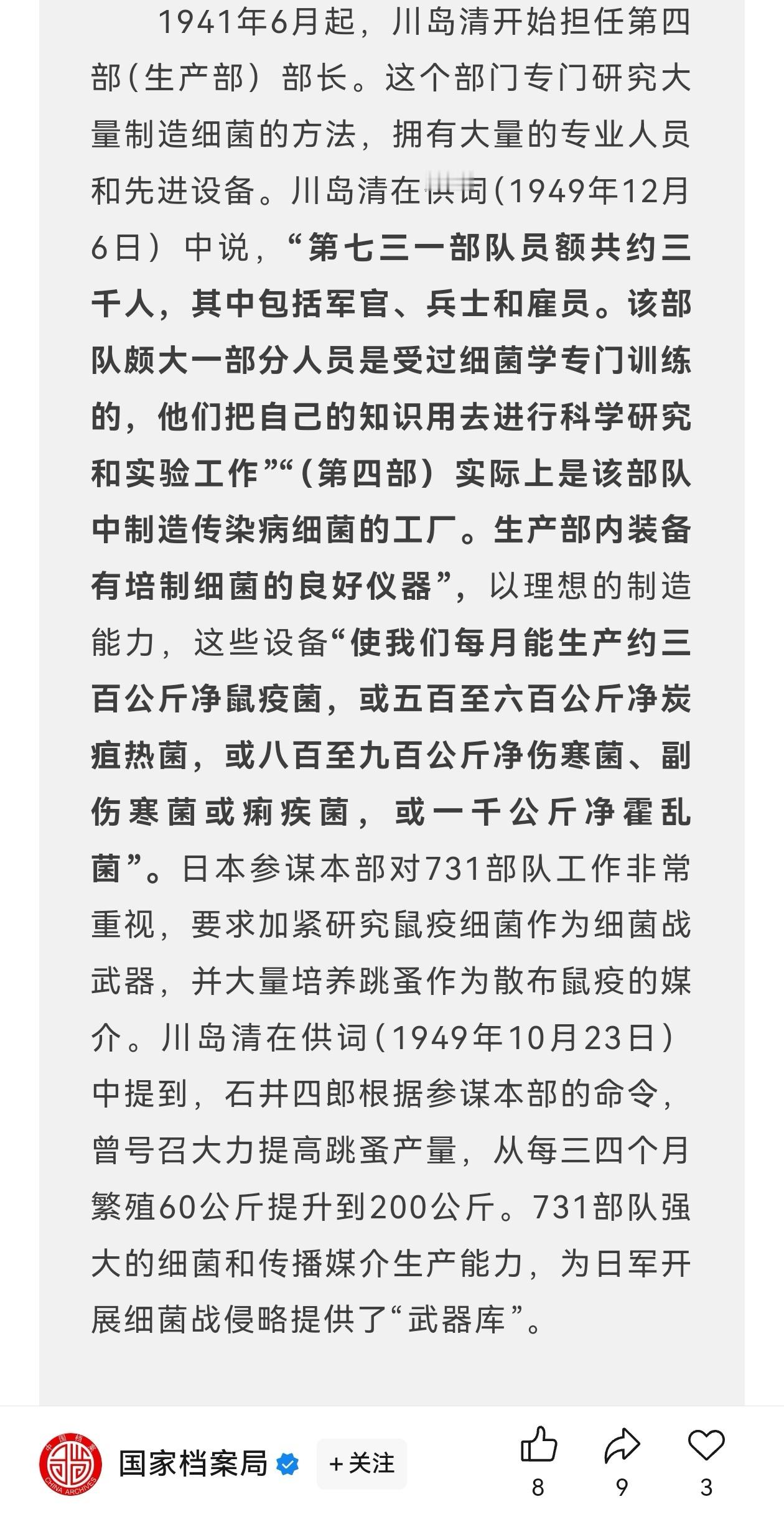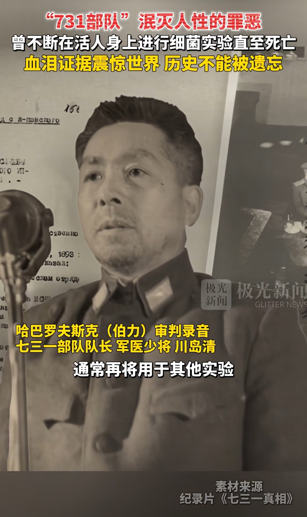 1893年出生的川岛清,是侵华日军“731部队”第四部(细菌生产部)部长,作为军医少将、医学博士的他,实则是细菌战核心指挥官,直接负责大规模培养鼠疫、霍乱、伤寒等病原体,并亲自参与用活人进行效能试验和实战投放,是伯力审判中供认罪行最详尽的战犯之一。战犯审讯录揭731细菌战细节满谈历史1939年4月到1943年3月,川岛清服役于731部队,历任总务部长、第一部长、第四部长,掌管“细菌工厂”第四部期间,每月可产鼠疫菌300kg、霍乱菌1t、炭疽菌500–700kg,研究和大量生产鼠疫、霍乱、伤寒、炭疽等致命细菌,为部队提供“弹药”。日本参谋本部对731部队工作非常重视,要求加紧研究鼠疫细菌作为细菌战武器,并大量培养跳蚤作为散布鼠疫的媒介,从每三四个月繁殖60公斤提升到200公斤,不仅无视生命、用活人做“实验材料”,还在战争中对我国军队甚至无辜平民投放研制的细菌武器,犯下了反人类、反文明、反伦理的野蛮暴行。1945年8月20日,川岛清被苏军俘获;1949年12月,他在哈巴罗夫斯克(伯力)军事法庭受审,以“准备和使用细菌武器罪”被判25年徒刑,是12名被告中量刑最重者之一。庭审中,他详细供述了731部队的组织结构、生产规模和焚尸灭迹流程,成为指证日本细菌战体系的关键证词。1956年苏日恢复邦交后,川岛清与其他战犯一起被提前遣返回国,同年12月26日登陆舞鹤港,此后未再被日本法庭追诉,晚年情况无公开记录。在我看来,川岛清作为731部队细菌武器量产与实战使用的直接责任人,已亲口承认侵华日军是在自上而下实施国家细菌战计划。战犯审讯录揭731细菌战细节