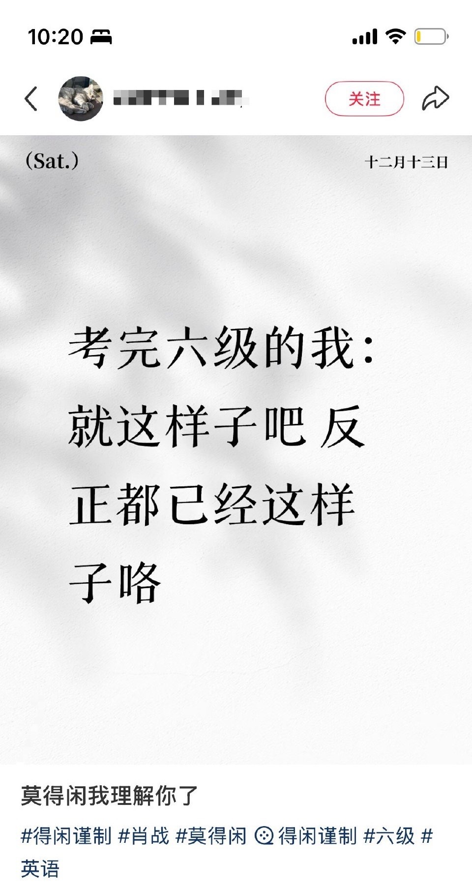 得闲谨制的得闲体就这样火了“考完六级的就这样吧,反正都已经这样子咯” “你只是考了,我只是没考,我们都没算过了”“我的中国语很好”