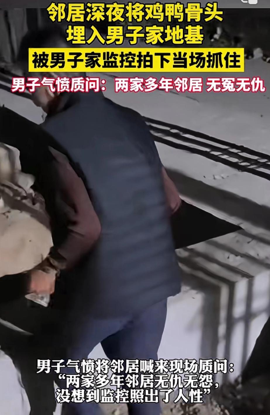 太缺德!广东邻居深夜埋鸡鸭骨头进新房地基!监控拍全程。 12月12日凌晨两点多,邻居大爷背着黑塑料袋,鬼鬼祟祟溜到男子刚挖好的地基旁,挖坑埋袋并用脚踩实,动作迅速得像做贼。男子睡前翻看工地监控发现异常,第二天挖掘出一袋腥臭味扑鼻的鸡鸭骨头。 男子拿着监控找邻居对质,对方一开始死不承认,还反过来指责他冤枉人,直到看到清晰画面才红着脸支支吾吾承认,男子报警并找村委会调解,最终邻居答应清理骨头并承担费用。 这大概率是嫉妒男子盖新房,或是迷信埋骨头能“破运”。更让人担心的是,这些骨头腐烂后会滋生细菌、招引害虫,还可能腐蚀地基钢筋,影响房屋稳定性。 网友纷纷吐槽这邻居太缺德,表面和睦背地里使阴招。邻里相处讲究互相尊重,有矛盾摆上台面说,耍这种小聪明既伤和气还可能触犯法律。 你觉得这邻居是单纯图方便,还是故意搞破坏?遇到这种心术不正的邻居,该忍气吞声还是较真到底?评论区聊聊你的看法!