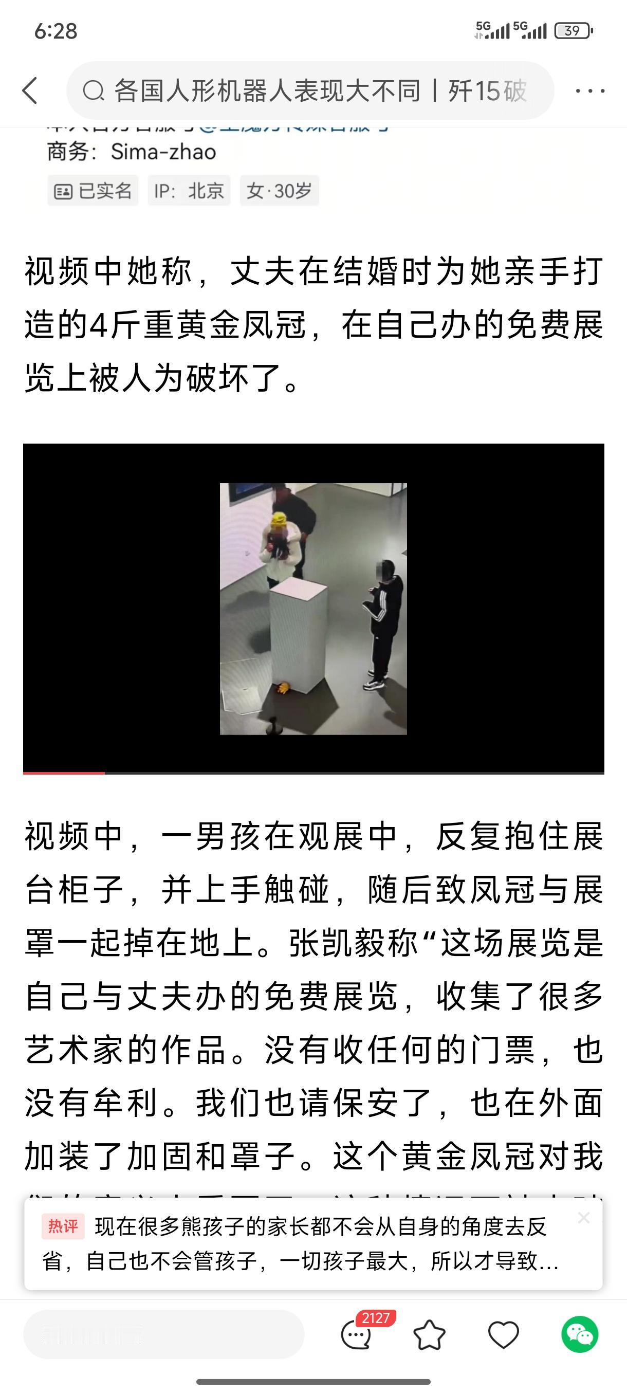 4斤重黄金凤冠展览上被人为破坏?还是刻意为流量设计摆拍,但如果此展览涉嫌碰瓷故意做的局,那性质就不一般了,该被追究对象恐怕要反过来。 这种现做的,不镶嵌任何一点稀有贵重宝石的纯黄金凤冠,其实毫无欣赏价值,而且本身其价值顶多按黄金价格加点人工费, 这样的物品的展览,若在城市根本不可能会有什么人感兴趣专门去参观,更不用说这样年龄小男孩,不可能对此事有兴趣, 而视频中,一男孩在观展中,反复抱住展台柜子,并上手触碰……这样的举动是令人怀疑的,怎么可能有这样的男孩会如此痴迷呢? 展品的摆放是完全不符合正常的展览规矩,凤冠与展罩按照贵重物品是有严格的要求,与参观者的间距, 然而可以清楚看到,展品其实根本就没有固定,以至于小孩一碰就掉下来,完全不符合正常展品展览的要求