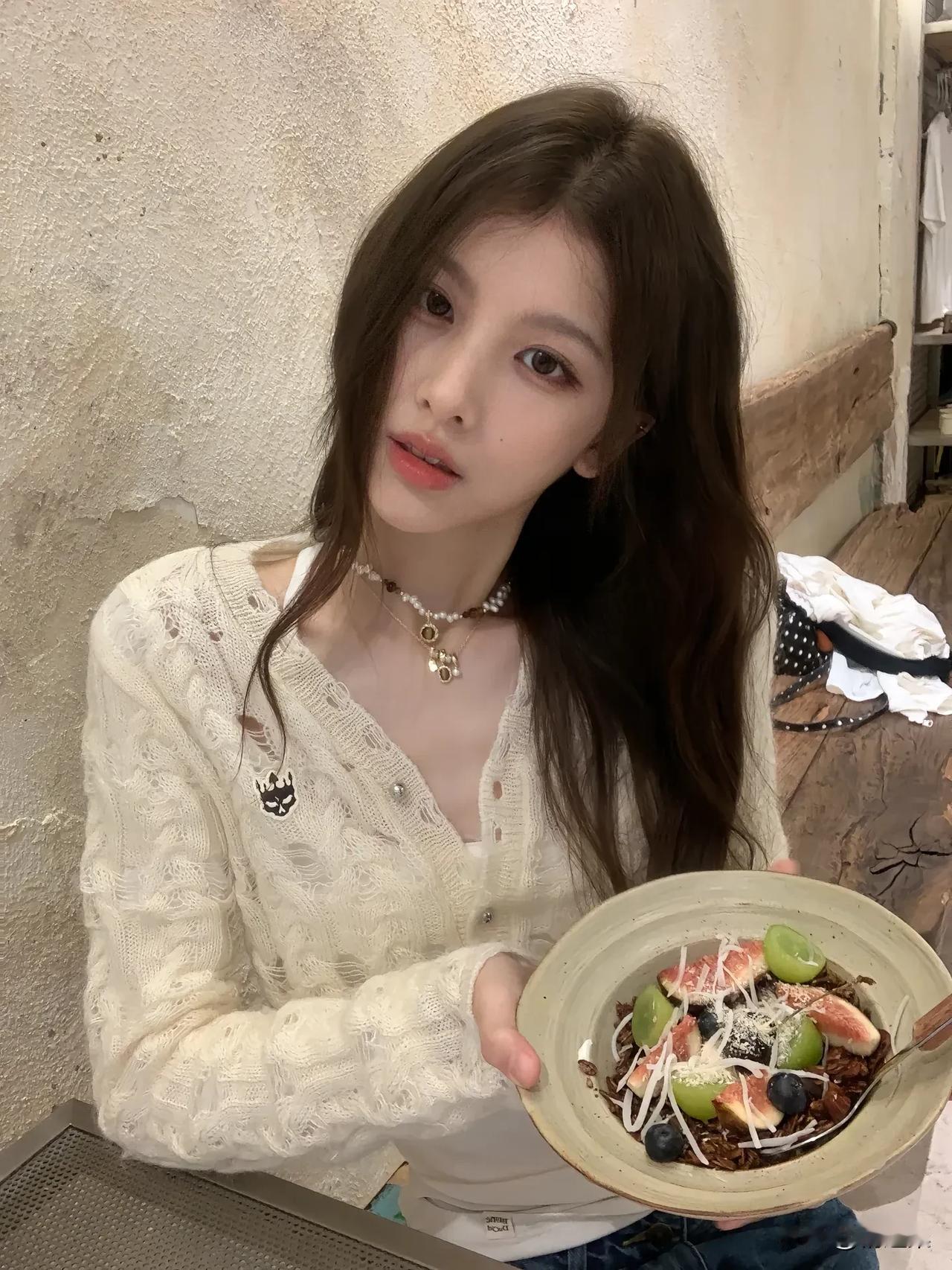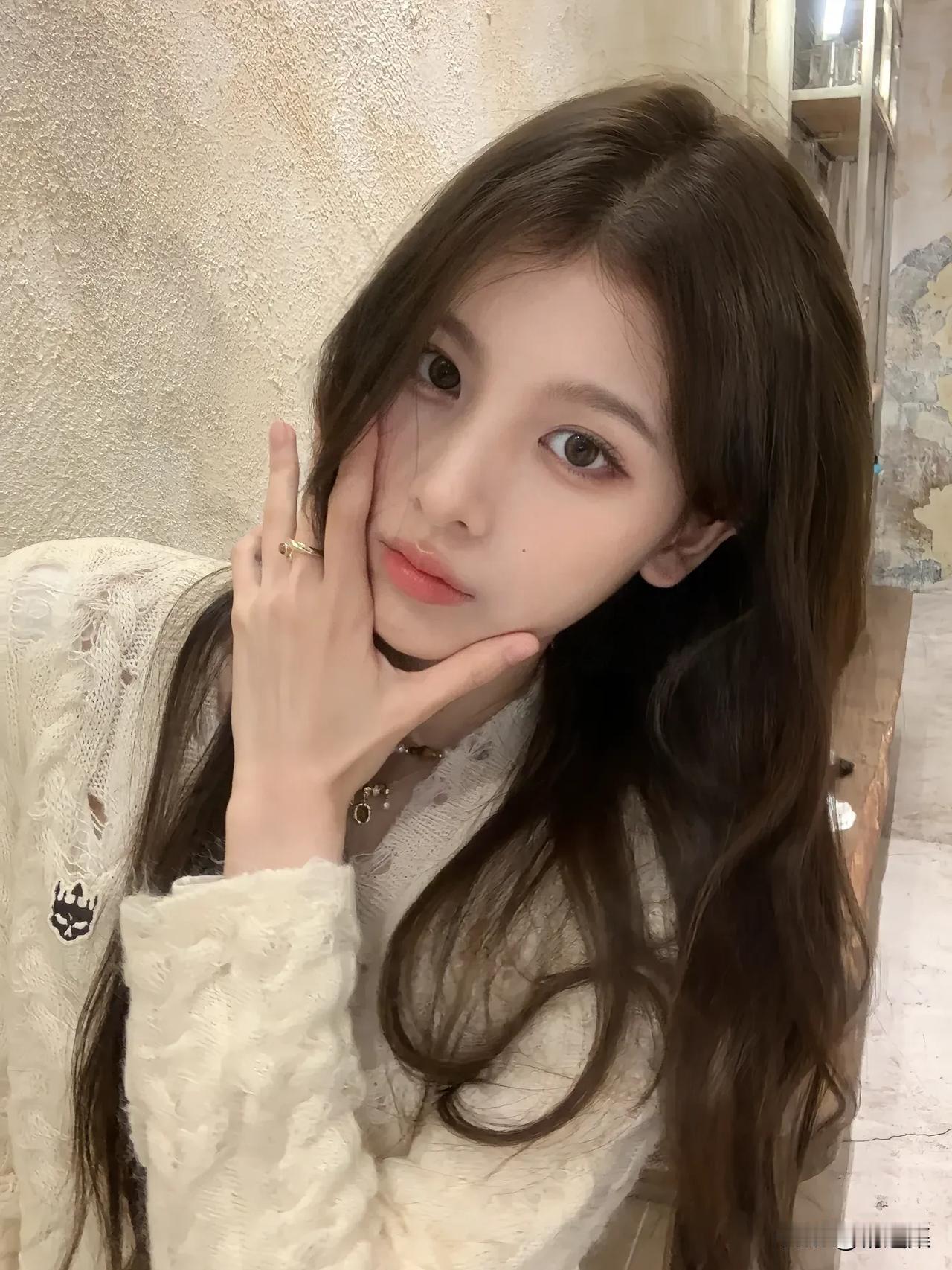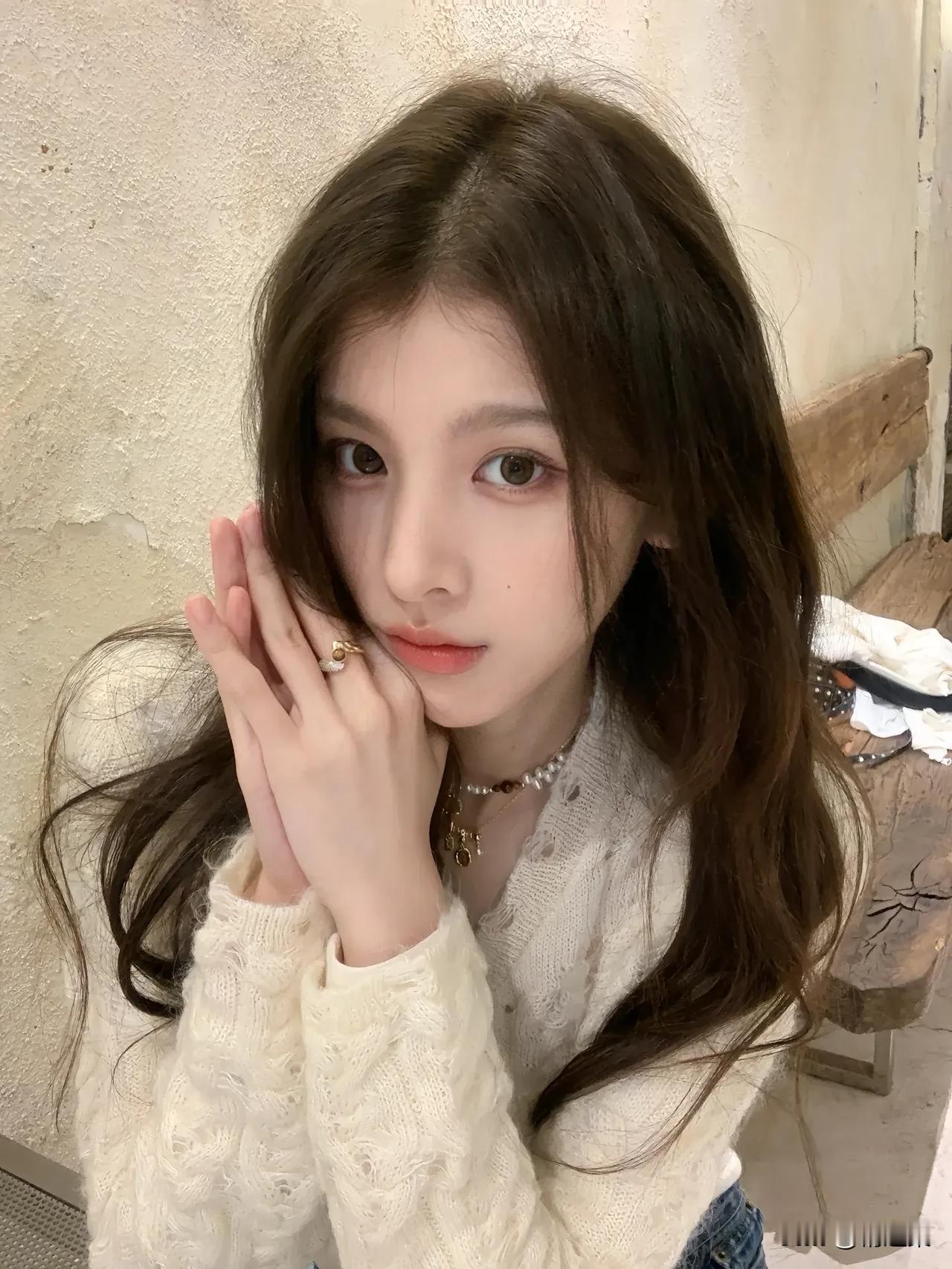 温柔甜美的少女,白色毛衣搭配珍珠项链,自然妆容,清新自然。